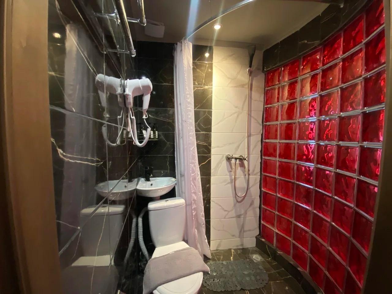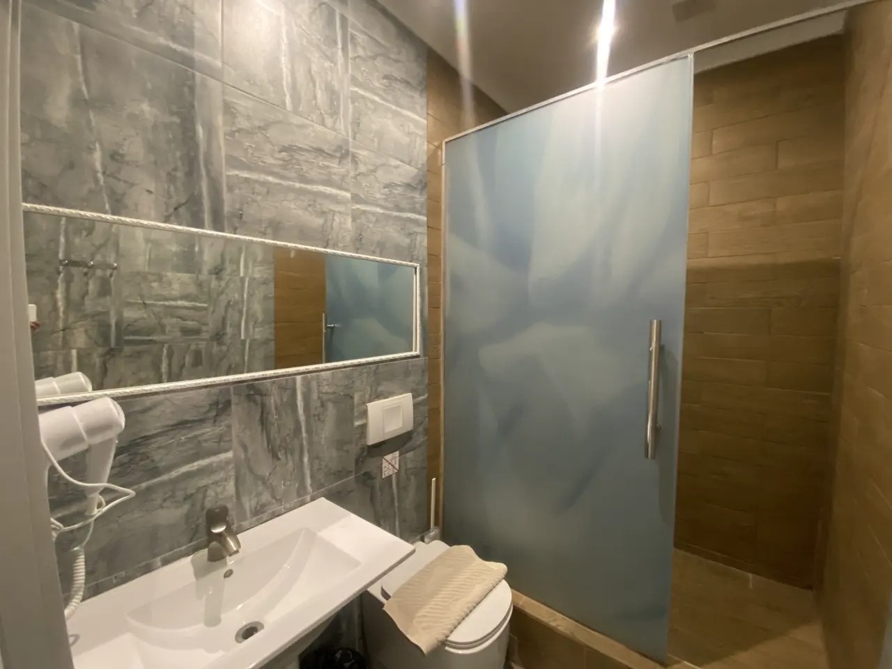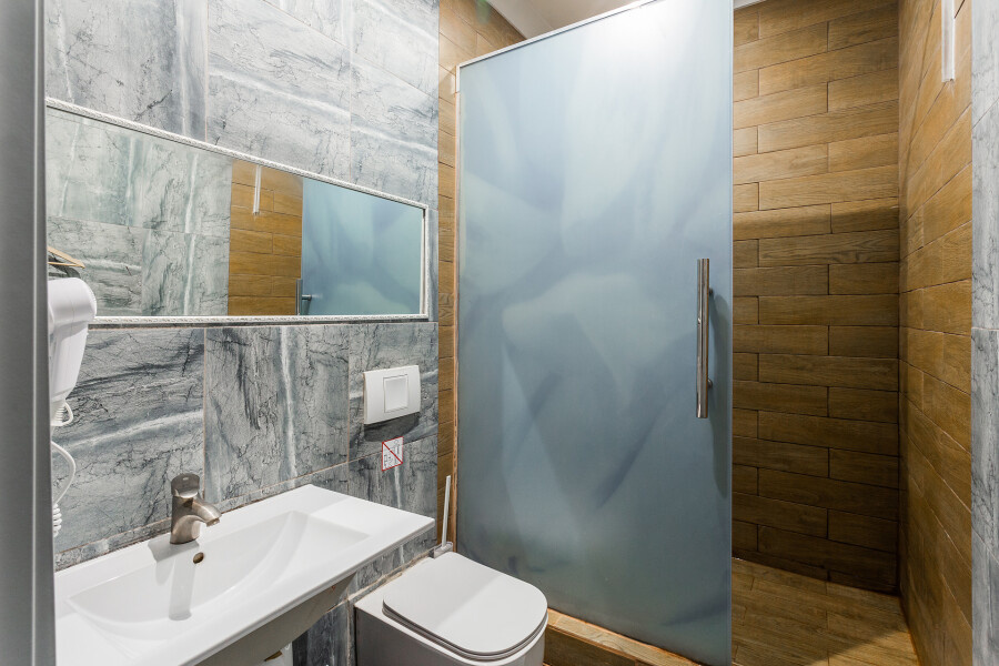 Номер холодный (при 0 за окном), от окна дует, тепло было только под одеялом. Одеяло узкое, для двоих уже некомфортно. Душевая неудобная, стена ванной полупрозрачная - почти видно, что делает второй. Стены картонные - храп/зевание соседей слышно как у себя. Номер подуставший.