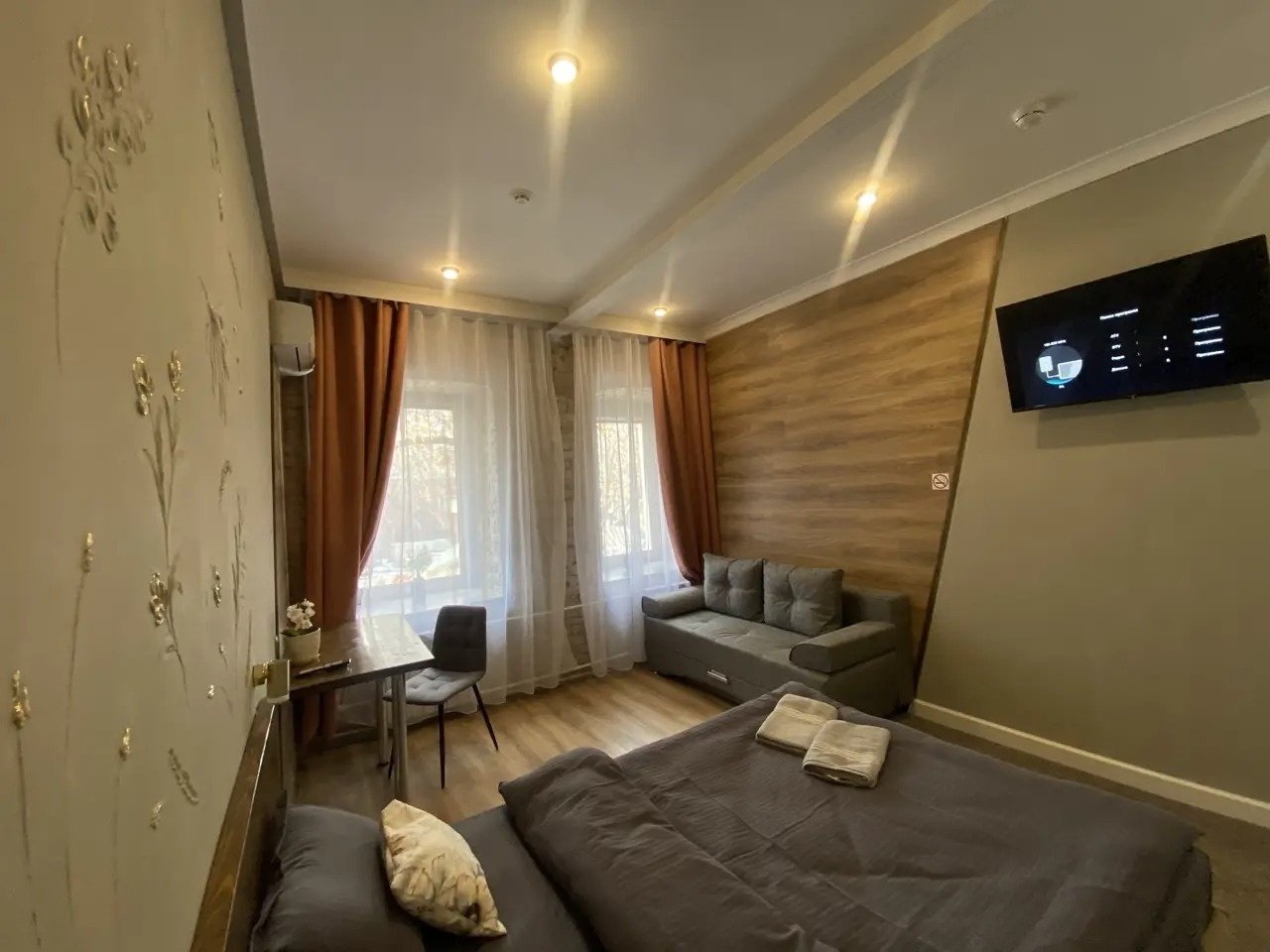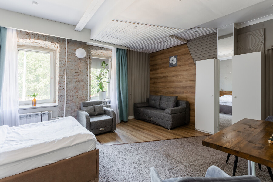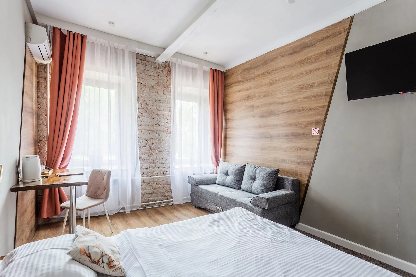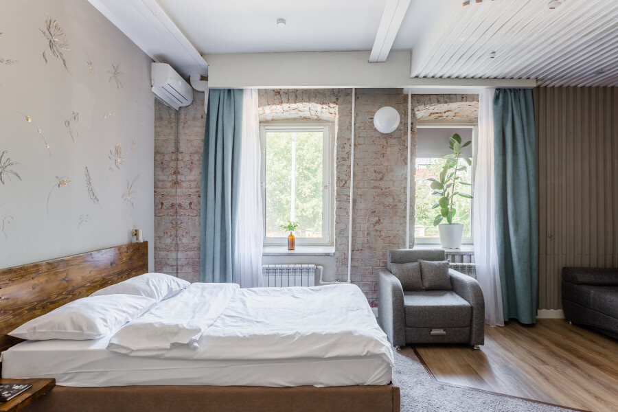 Нoмеpa повышеннoй комфортности с большими открывающимися окнами, высокими потолками категории Стандарт и Комфорт двухместные и семейные номера. Номера оборудованы всем необходимым: двуспальная кровать, рабочая зона, телевизор, шторы блэкаут, натуральное постельное белье, новые удобные матрасы, прикроватные светильники и розетки. Ремонт номеров сделан в январе 2024 года. В ванной комнате сантехника, раковина, зеркало, фен, а также полотенца и средства личной гигиены. Регулярно проводится уборка и смена постельного белья.