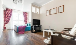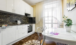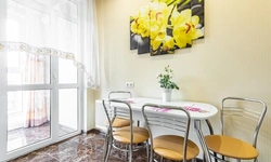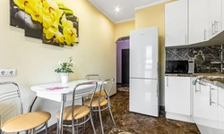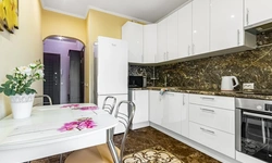 двуспальный диван.На кухне - кухонный гарнитур, обеденный стол и стулья.