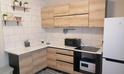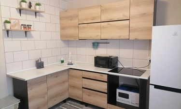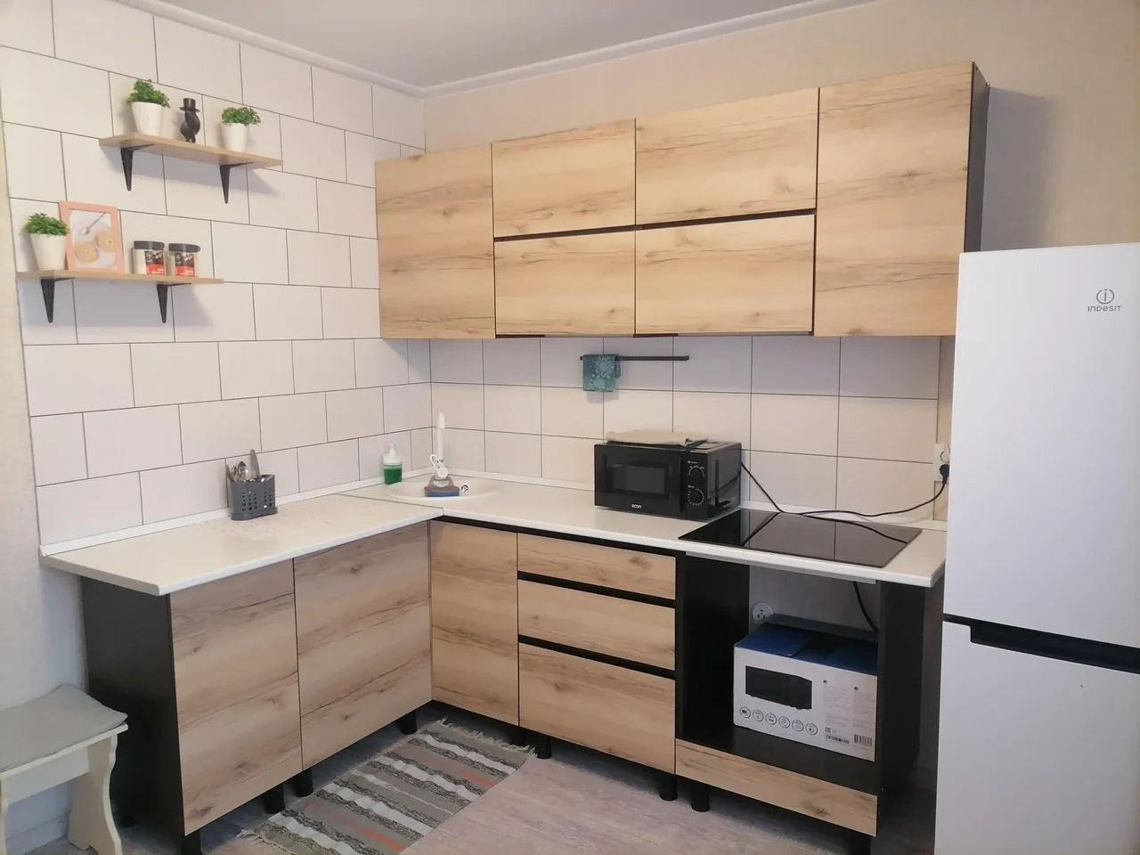 Уютная новая кухня, холодильник, плита, в кухне есть все принадлежности для приготовления пищи.