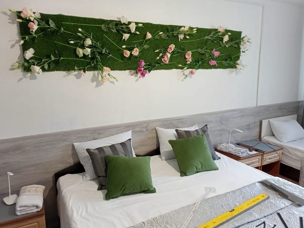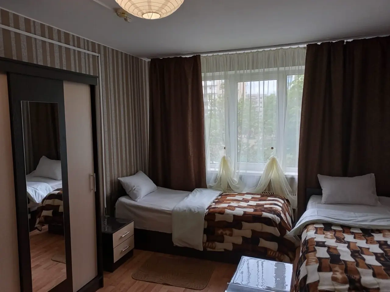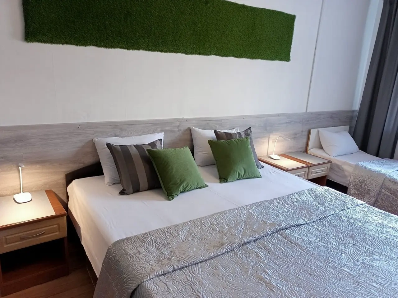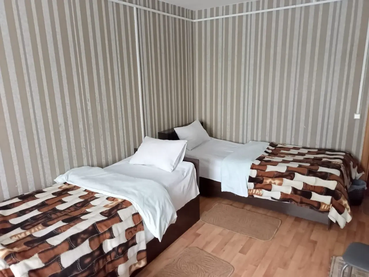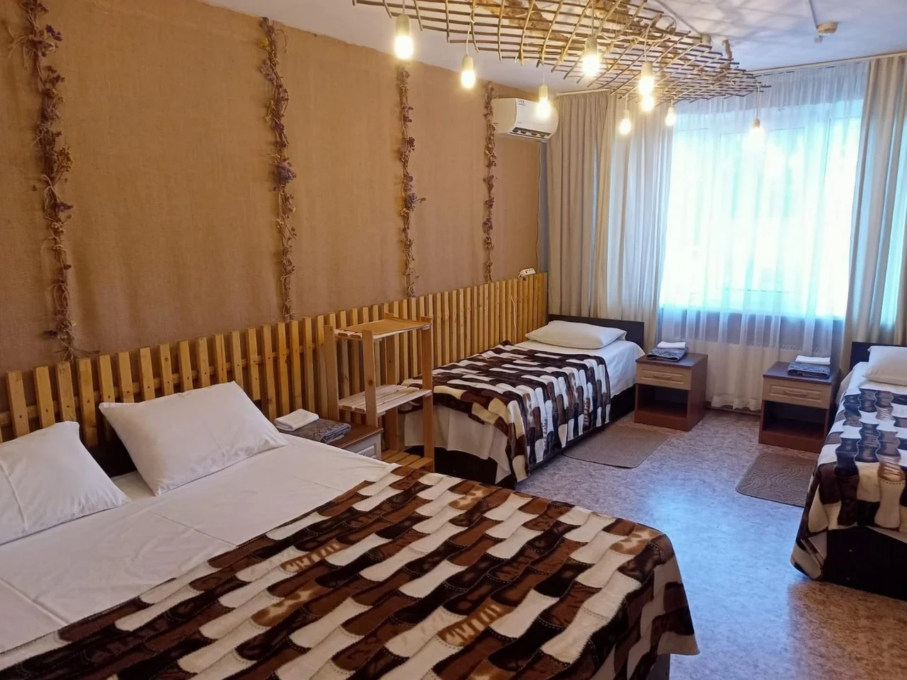 Трехместный номер: одна двухспальная ковать ( 180х200) + одна односпальная (90х200). Кондиционер. С/у и индивидуальные душевые кабины находятся на этаже ( не в номере !!! ). Постельное белье, полотенца. Холодильник , микроволновая печь, эл. чайник, фен, утюг, стиральная машина на этаже., WiFi . Парковка гостевая.