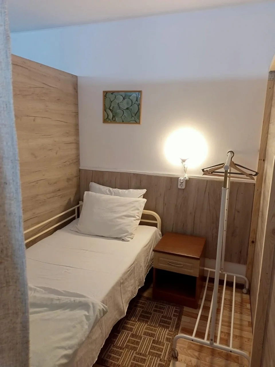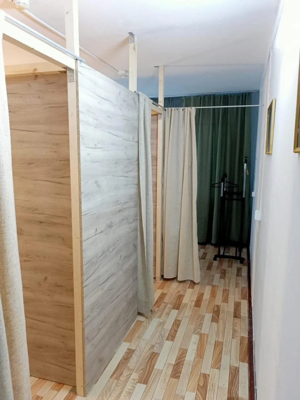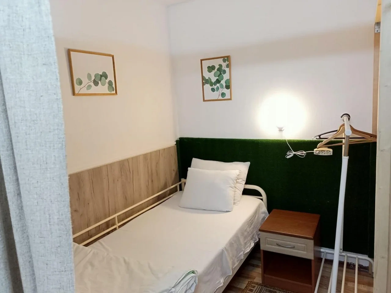 Выделенное спальное место в трехместном номере. Кровать ( 90 х200 ) , тумбочка, вешалка напольная, постельное белье , полотенца. Отгорожено от соседей перегородками Номер с кондиционером. С/у и индивидуальные душевые кабины находятся на этаже ( не в номере !!! ) Холодильник общий, микроволновая печь, эл. чайник, фен, утюг, стиральная машина ... WiFi . Парковка гостевая.