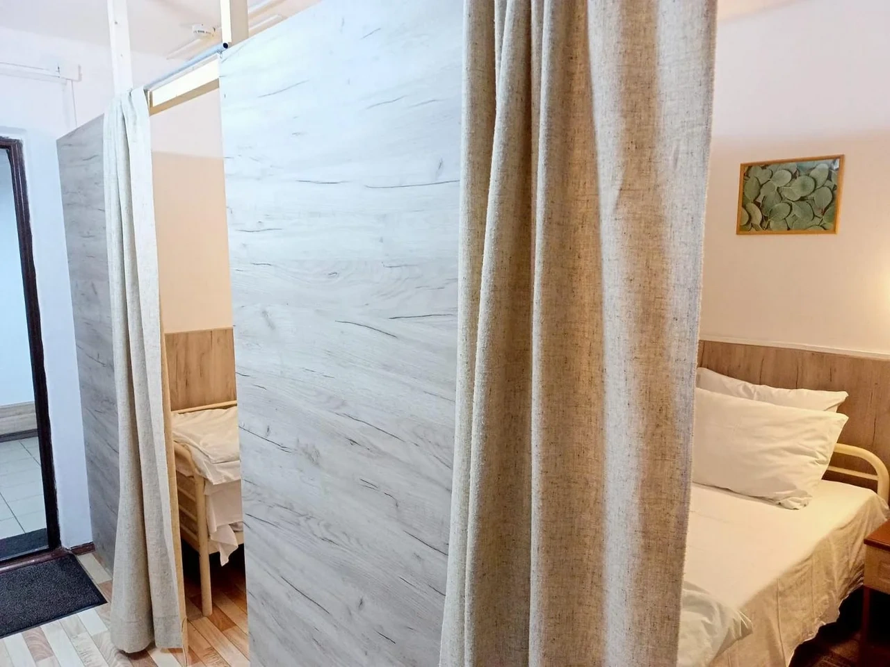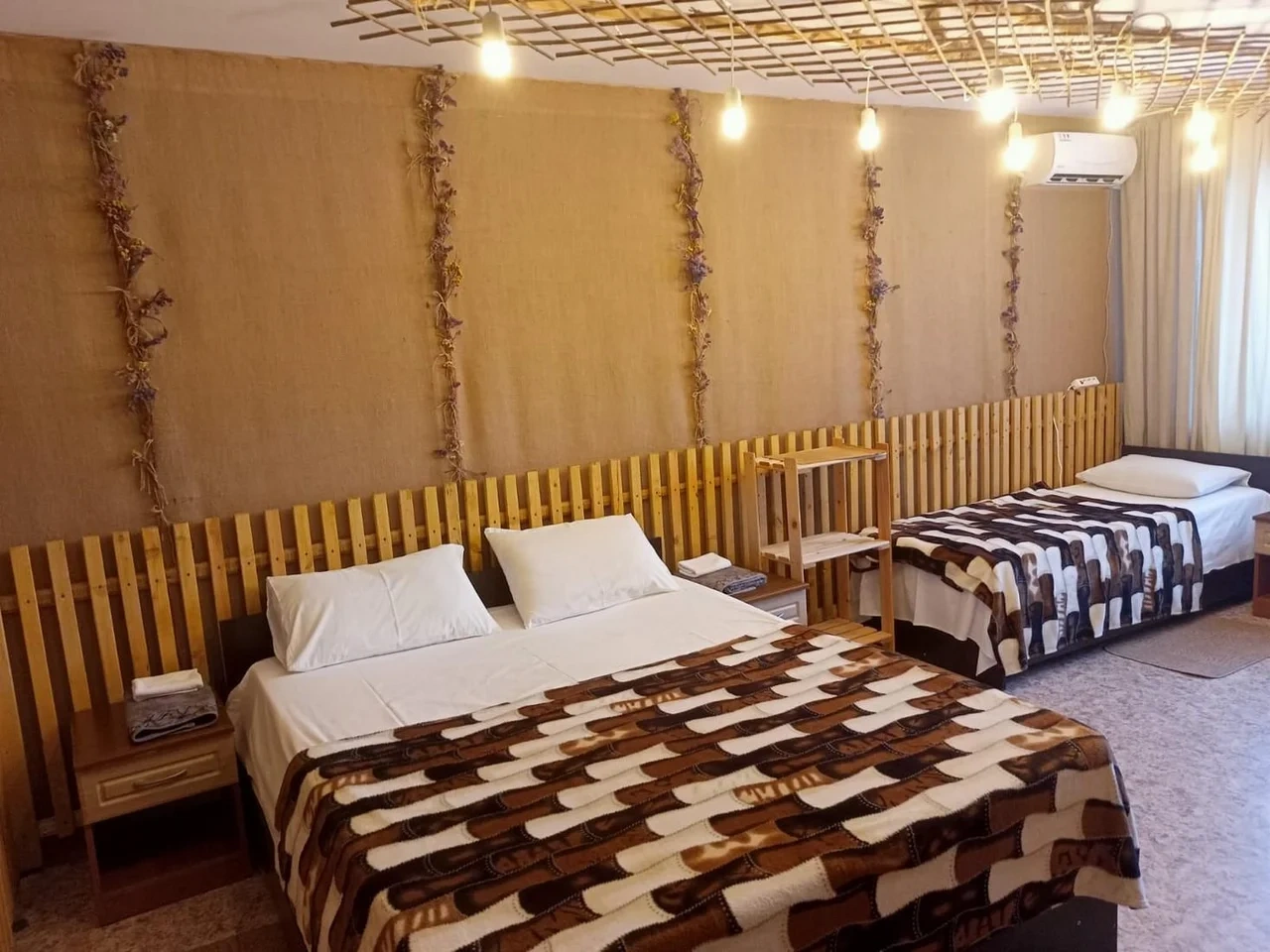 Четырехместный номер: одна кровать двухместная (160х200) + две одноместных (80х200) . Кондиционер , С/у и индивидуальные душевые кабины находятся на этаже ( не в номере !!! )Холодильник общий, микроволновая печь, эл. чайник, фен, утюг, стиральная машина ... WiFi . Парковка гостевая.