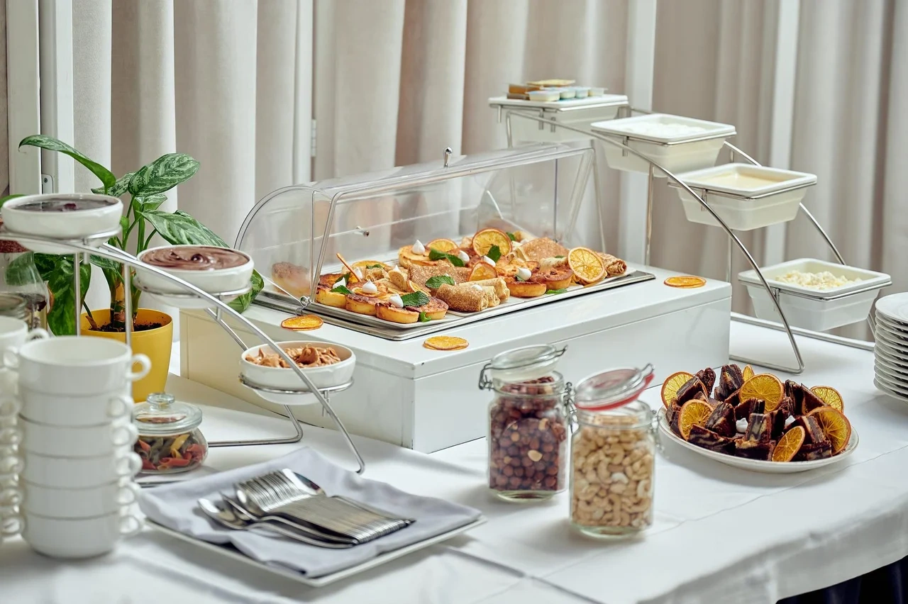 Очень достойный и хороший завтрак. Начиная от красной и белой рыбы до бутербродов с икрой и креветками, разнообразное мясное и сырное ассорти, овощи, оливки. Больший выбор горячих блюд. Молочная продукция. Выпечка, десерты, фрукты. Отличный капучино из кофемашины. Внимательные официантки.