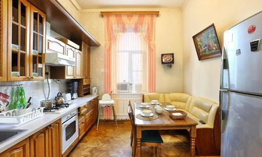 Уютная кухня, вместительный холодильник, много шкафчиков, большая светлая гостиная, места хватит всем!!!