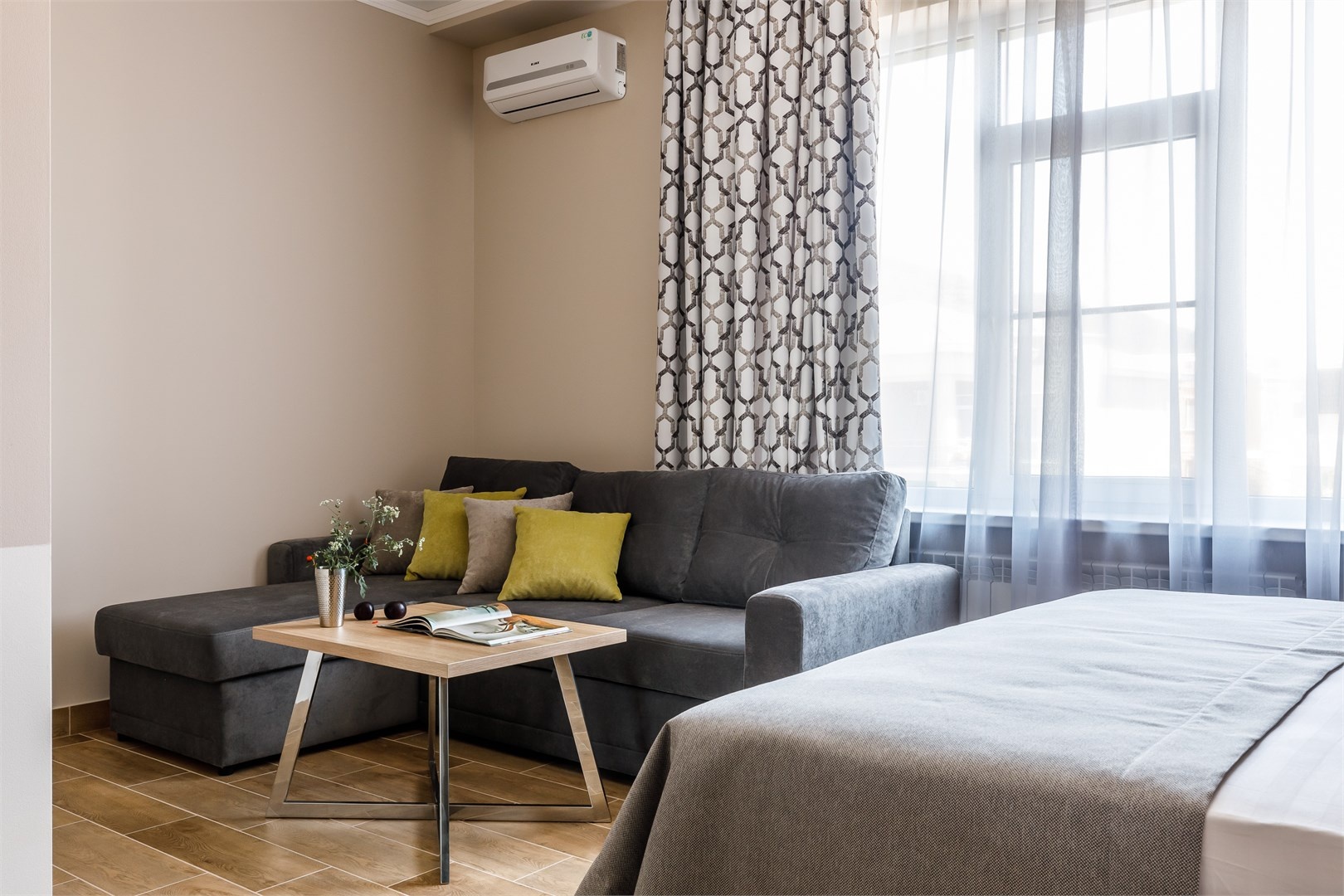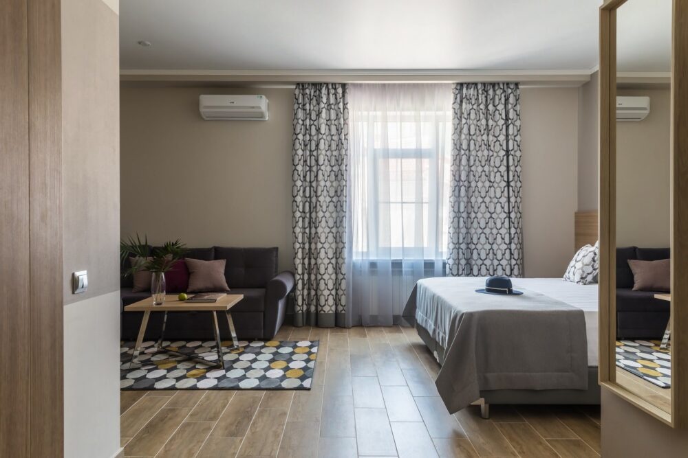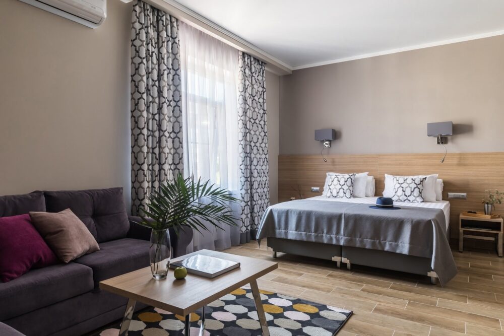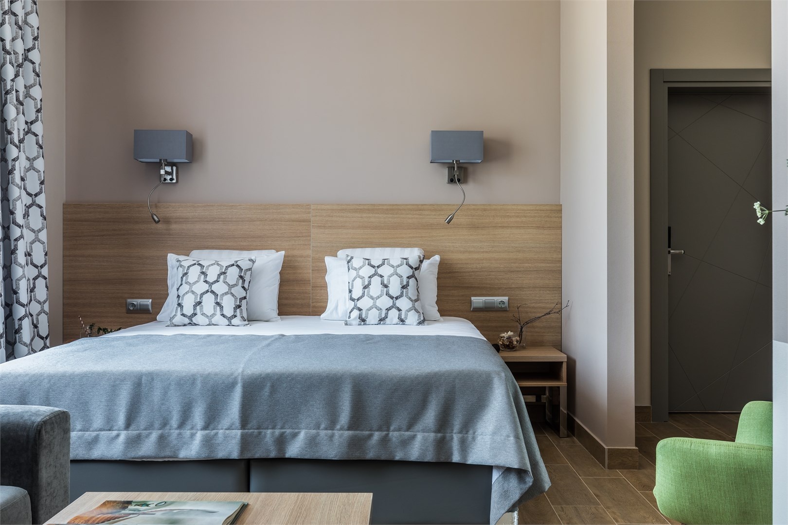 Стилизованный интерьер, уютные, просторные номера, благородные тона, большие окна, изысканные ткани, королевские матрасы, элегантный декор, мягкая мебель - создают приятную атмосферу для вашего отдыха. Удобная локация и безупречный сервис созданы для Вашего уюта и комфорта!