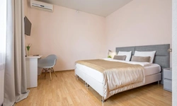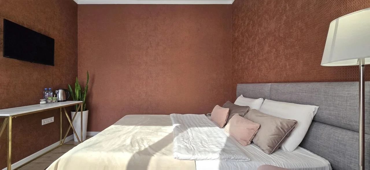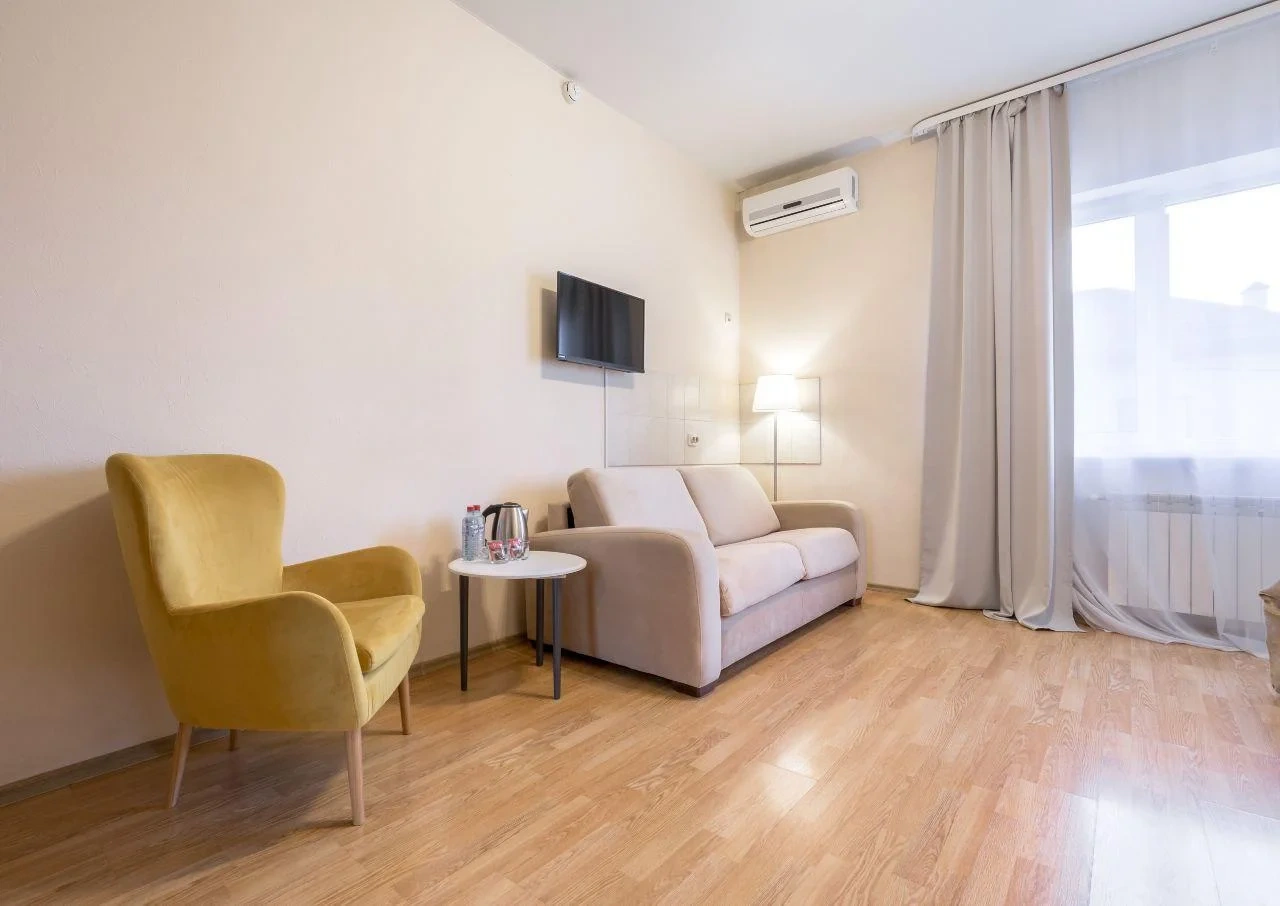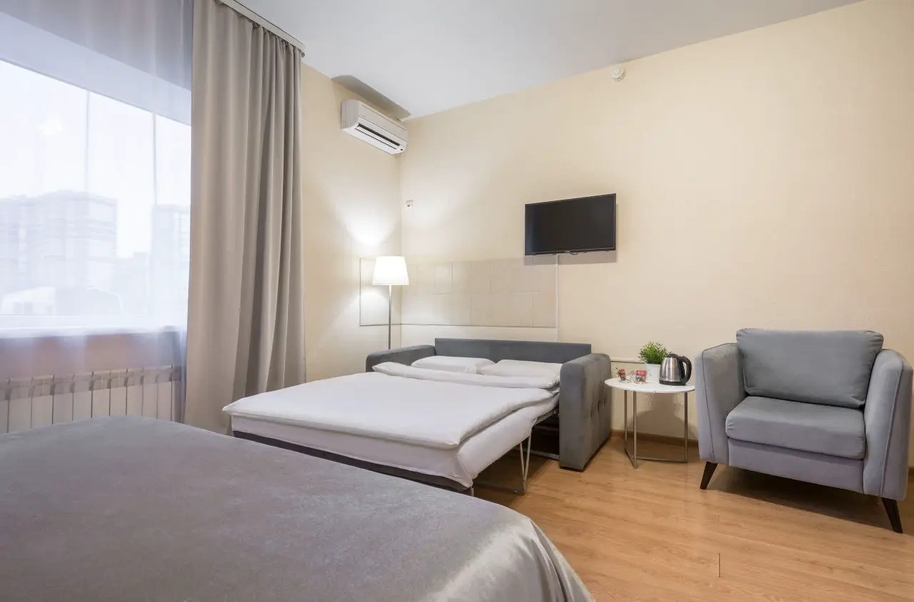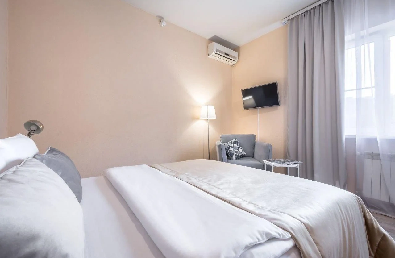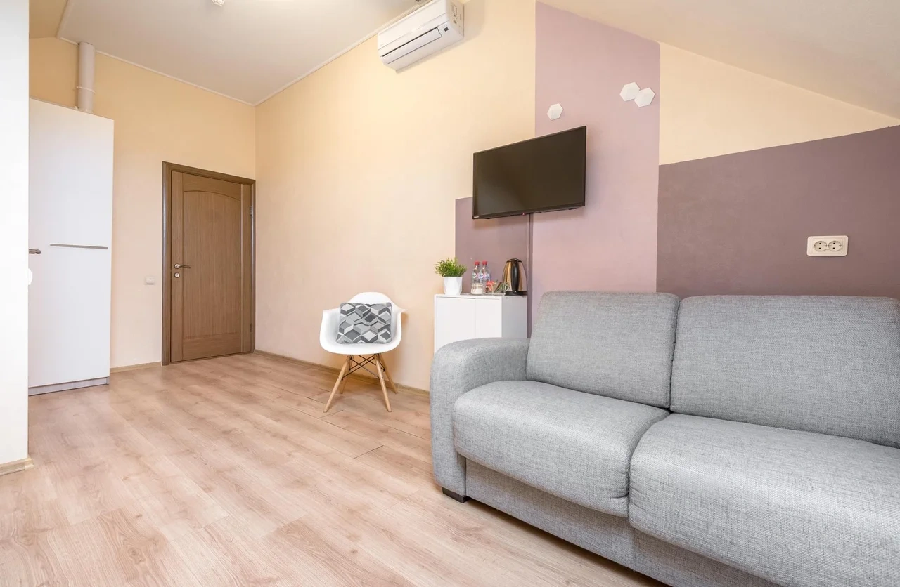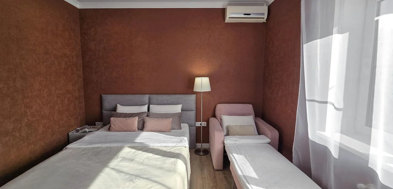 номер оооочень уставший( ламинат весь по краям каждой дощечки поднят, середина внизу, это ужас) его лет 5 назад пора было менять. Номер был на 3 этаже, окна на крыше никак не закрывались - основание от рольштор и маскитной сетки есть, самих штор и сетки нет) дали старую простынь закрыть, короче изъворачивались, а в итоге все равно в номере свет с улицы. Собаки лаяли всю ночь, так как гостишка находится в частном секторе. В общем намучались, хорошо, что уехали в 2 ночи оттуда. Сам Краснодар и то, как добирались до отеля это отдельная песня, по Краснодару ехали дольше, чем по трассе от Ростова. Город -пробка, а к чему я это пишу, если у вас есть возможность найти отель на трассе, лучше там, чем заезжать в город. Добираться до отеля далеко. Я искала двухкомнатный, вот только единицы поиск выдал, этот один из них, и как мне показалось не далеко от трассы, но добирались до него около 2-х часов.