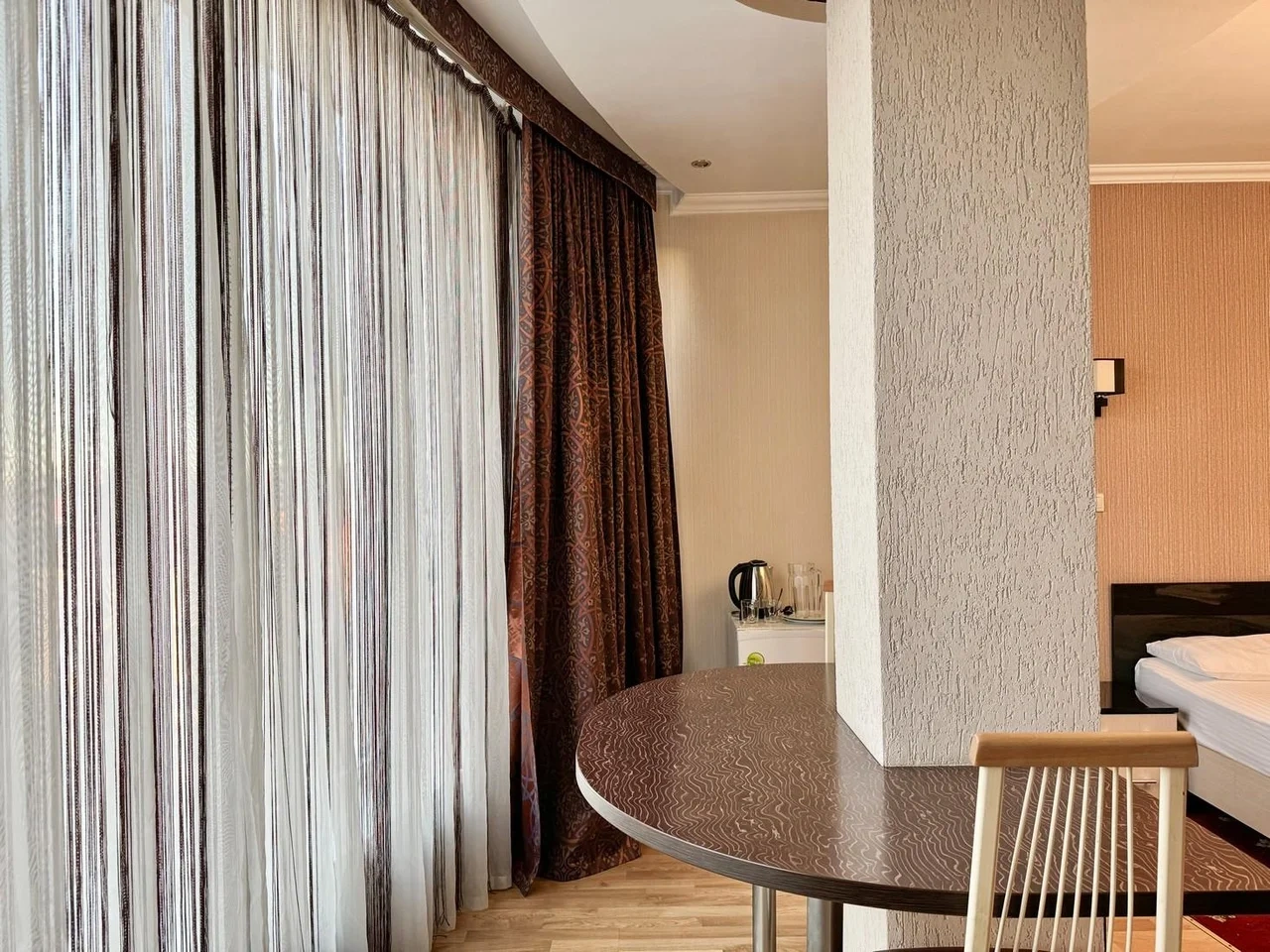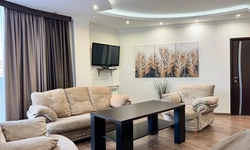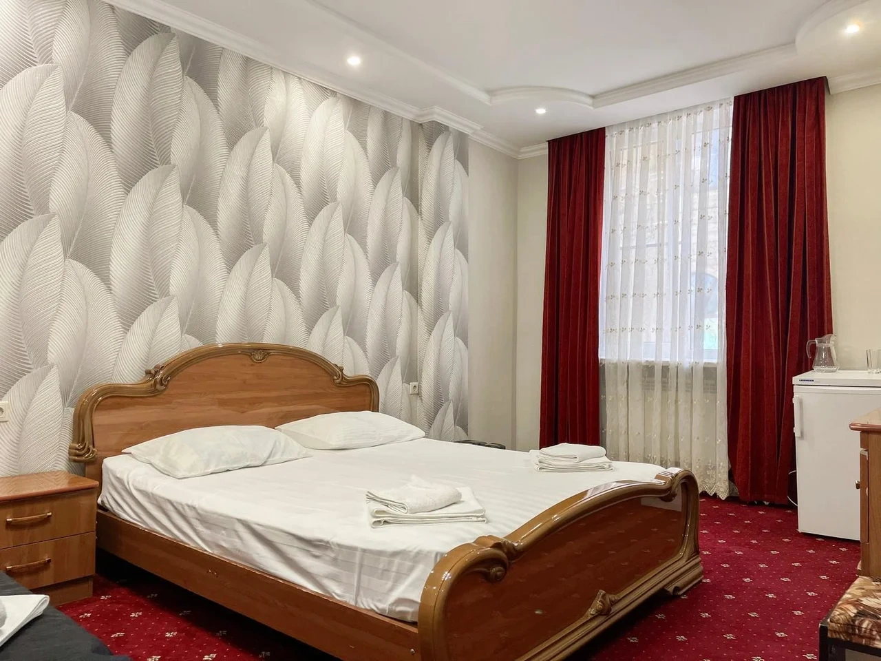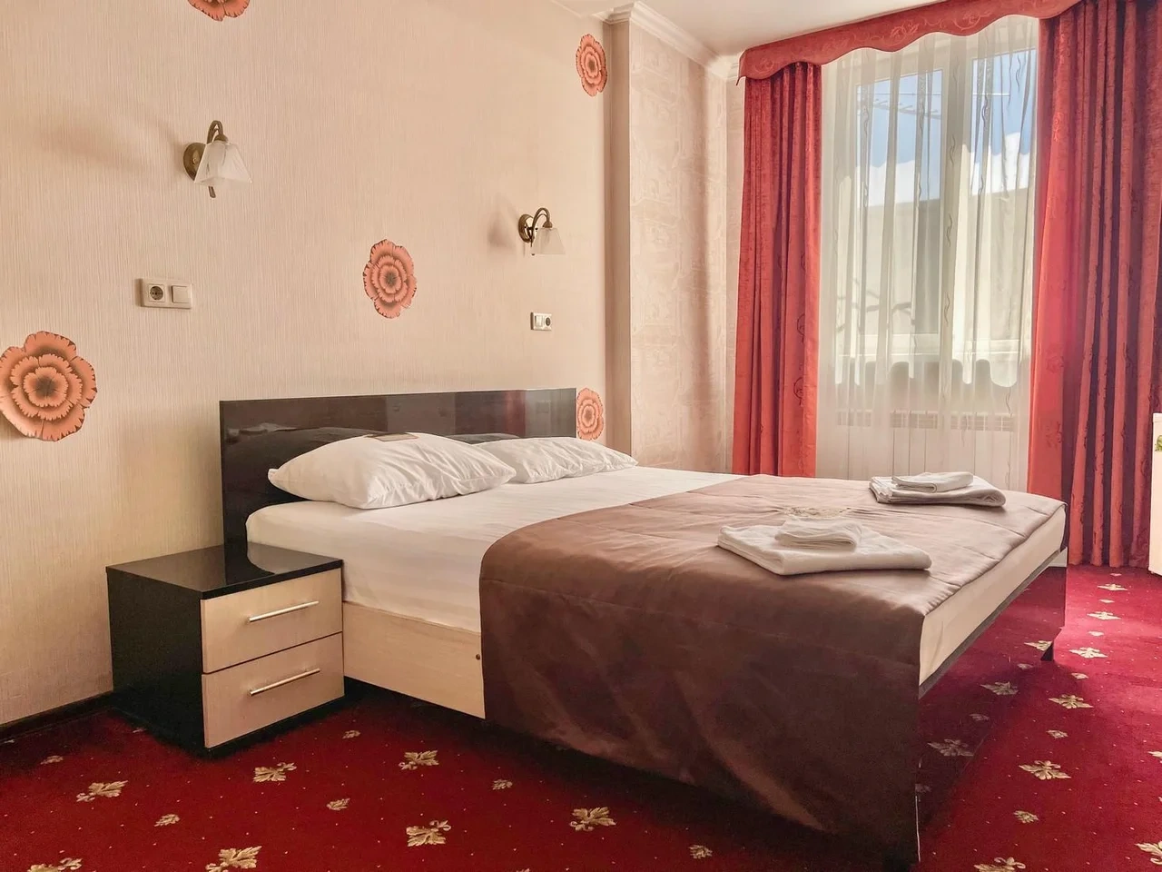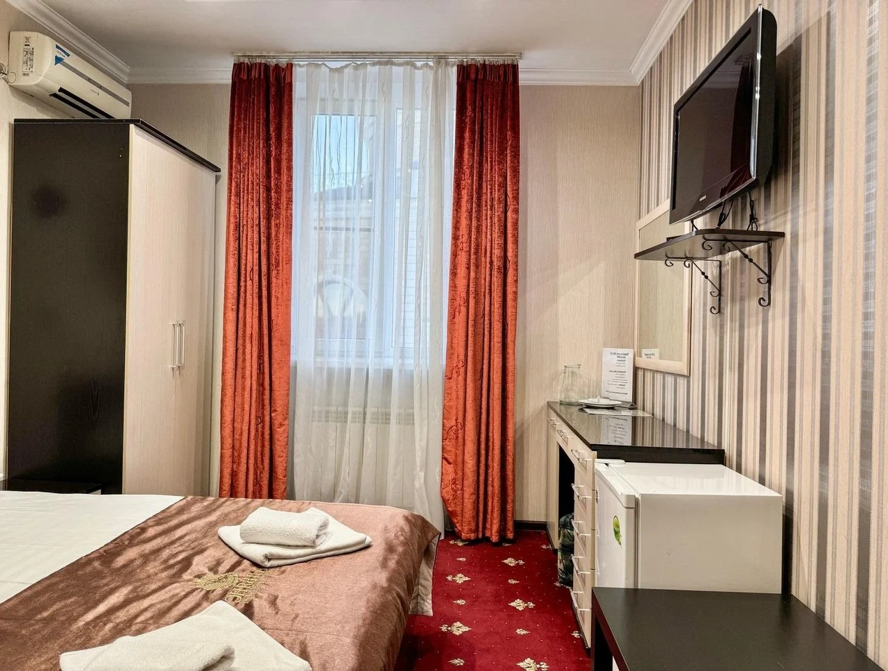 В номере воняет куревом! Вечером внизу (хозяева видимо) жарят шашлык и запах этого шашлыка вместе с дымом в номере. Мебель вся уставшая. Кровать для супружеского долга вообще не подходит, так как если на ней что то делать, то будет слышать все три этажа отеля. Матрац убитый. В санузле стоит джакузи и объявление что она не работает, но это полбеды. Воды в номере нет вообще, она просто идёт тонкой струечкой. Но это ещё тоже ладно, подмыться ещё хоть как то можно. Но как стоять в этой ванной вообще не понятно, так как у джакузи пол не ровный, нужно стоять, точнее сидеть в уголке ванной возле крана, так как вода не идёт совсем. Короче это не гостиница, а недоразумение. Слышимость в гостинице тоже нормальная. Заехали ночью люди всю ночь ругались, орали, но им даже никто не сделал замечание потому что вся администрация спит. Остановиться можно только если едешь на юг на одну ночь и то если не сильно вспотел, так как мыться и спать тут невозможно!!!