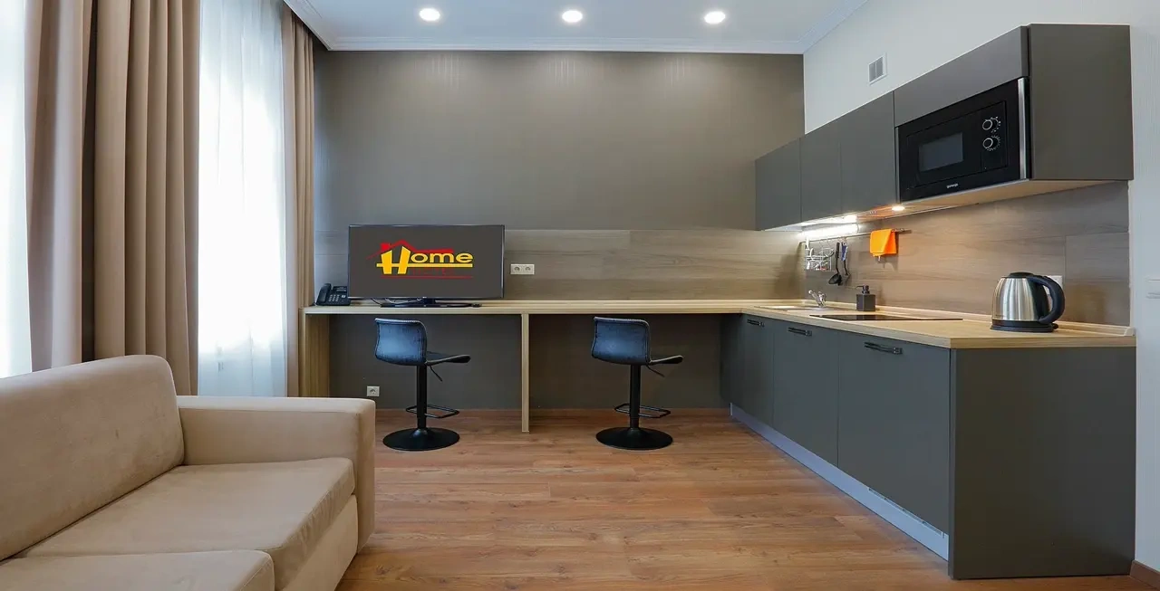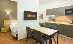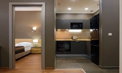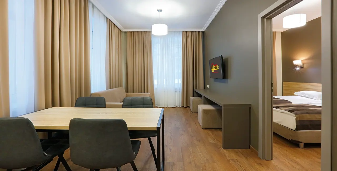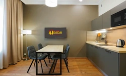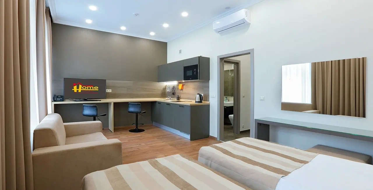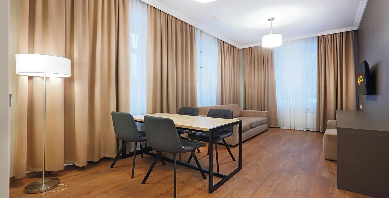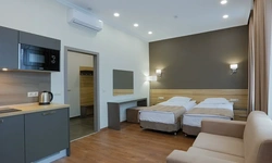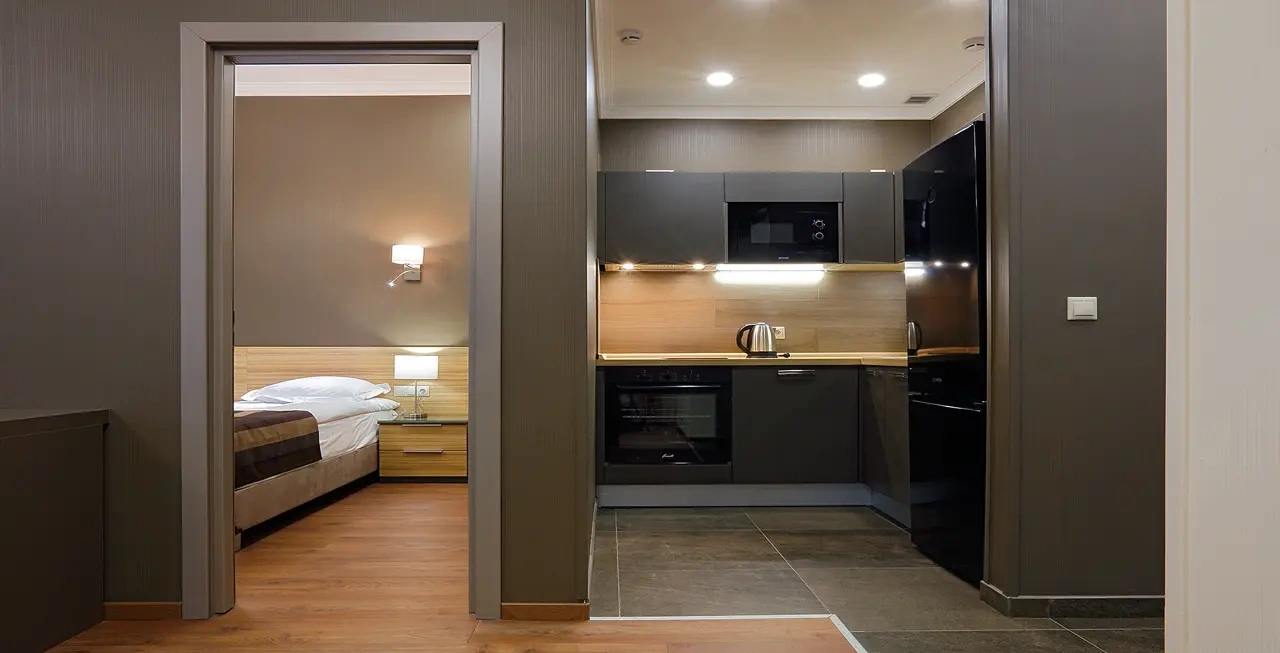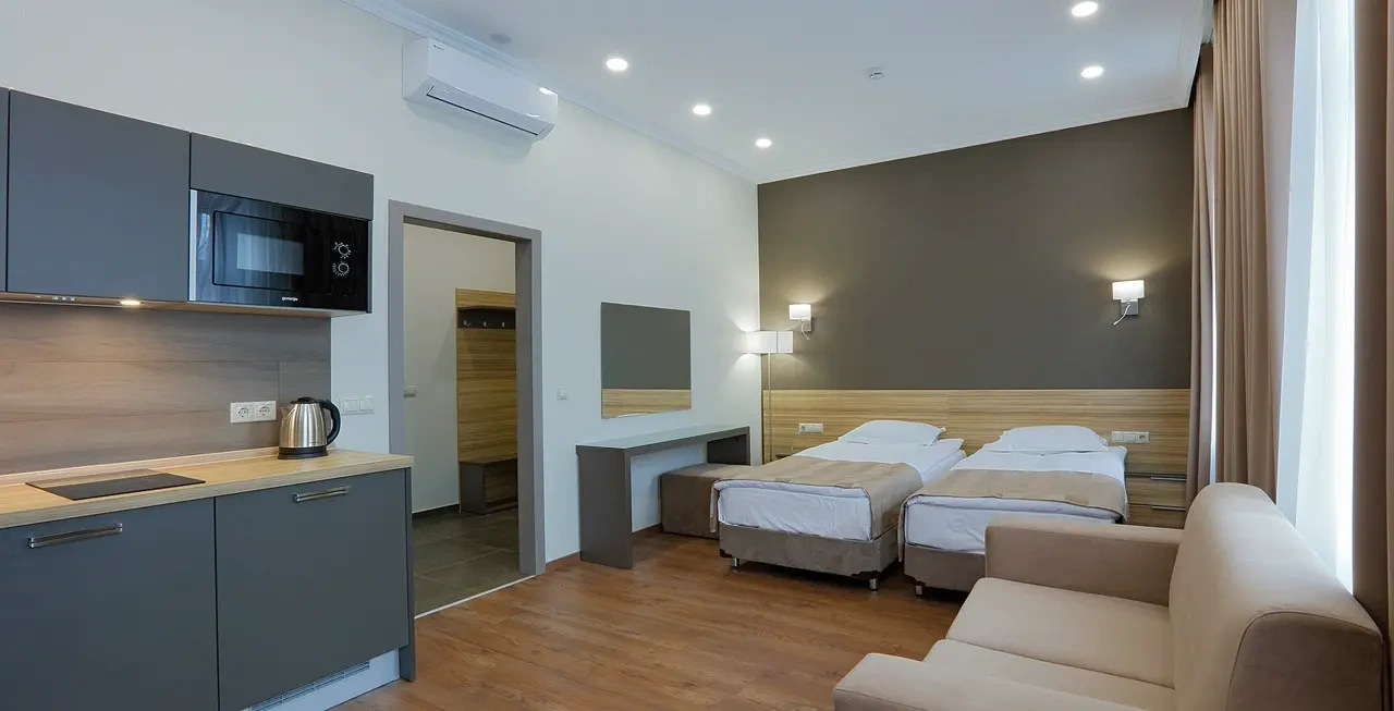 Апартаменты в которых предусмотрено все необходимое для комфортного проживания: спальня с двумя односпальными кроватями, гостиная с оборудованной зоной кухни. Современная функциональная бытовая техника: индукционная панель, микроволновая печь, чайник, холодильник, телевизор. Есть посуда и столовые приборы. В некоторых номерах предоставлена духовка. В каждом номере есть своя ванная комната с душевой кабиной или ванной.