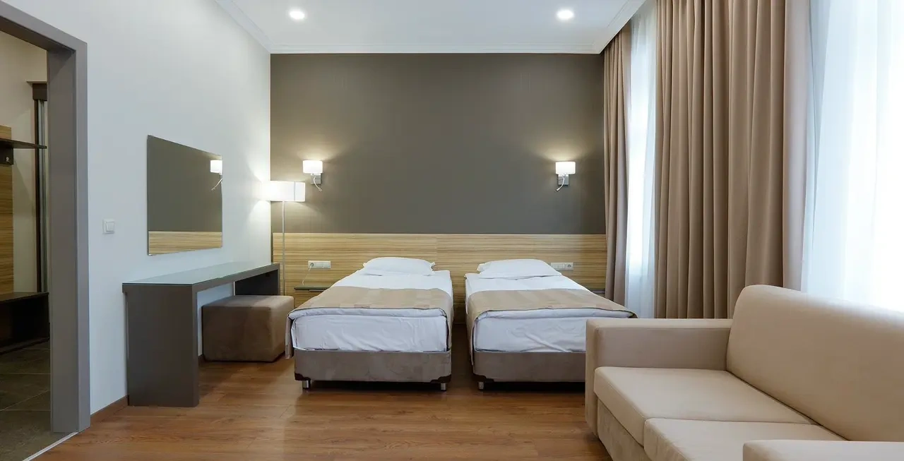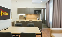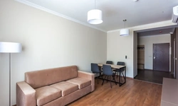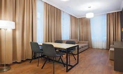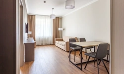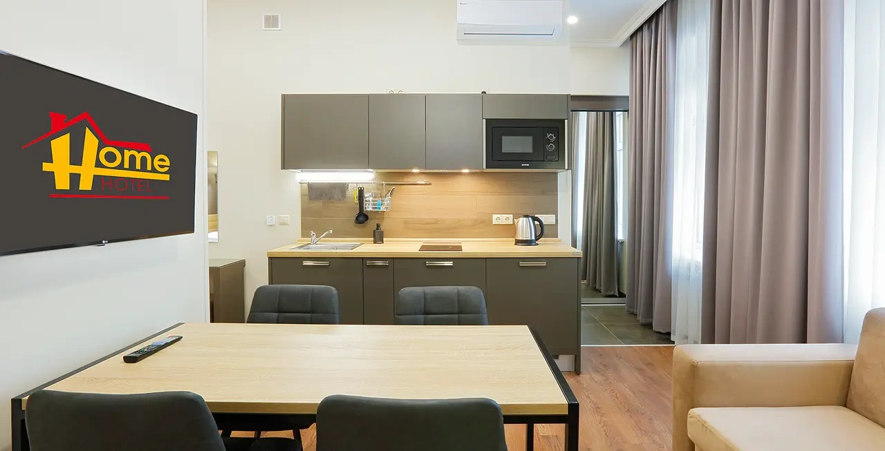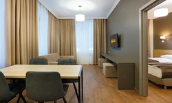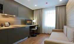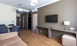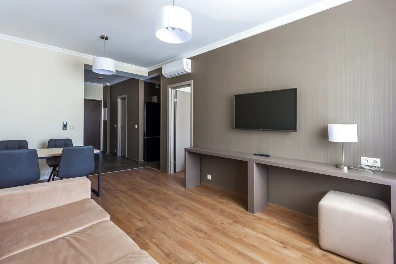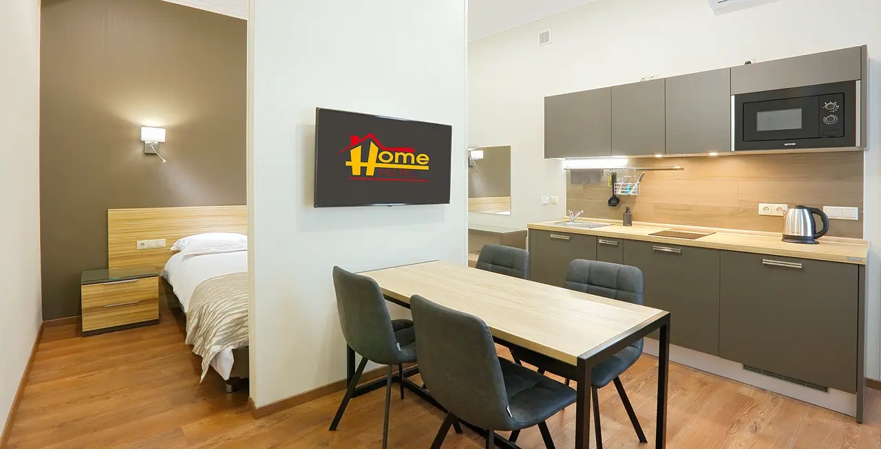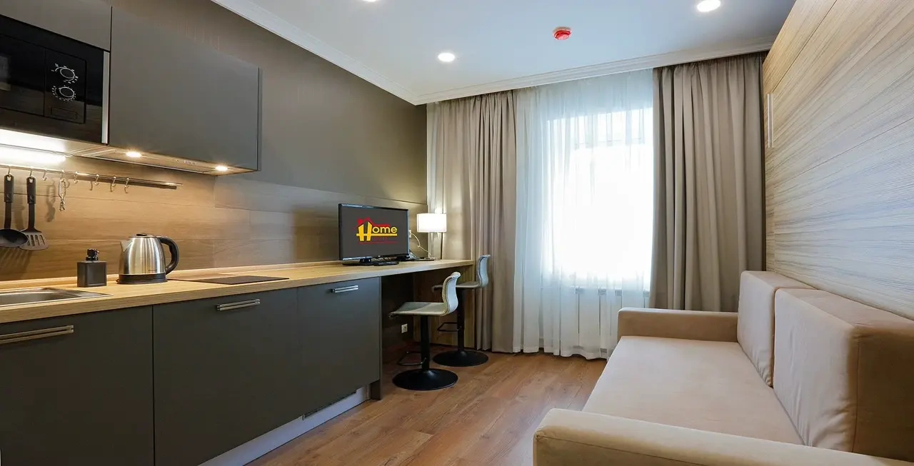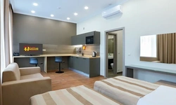 Апартаменты в которых предусмотрено все необходимое для комфортного проживания: спальня с двумя односпальными кроватями, гостиная с оборудованной зоной кухни. Современная функциональная бытовая техника: индукционная панель, микроволновая печь, чайник, холодильник, телевизор. Есть посуда и столовые приборы. В некоторых номерах предоставлена духовка. В каждом номере есть своя ванная комната с душевой кабиной или ванной.