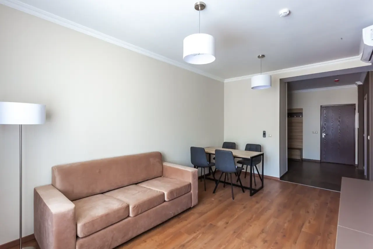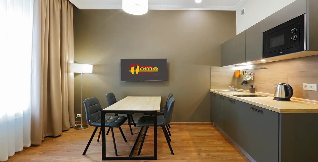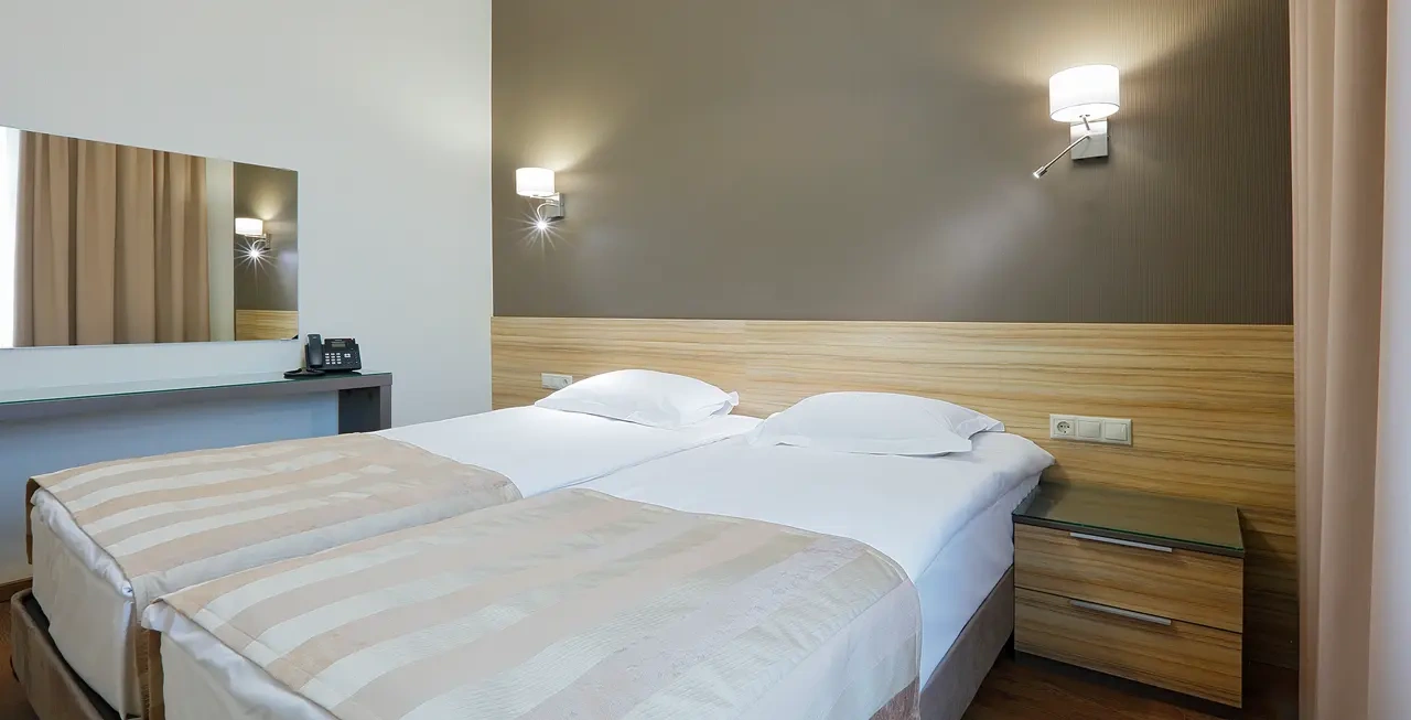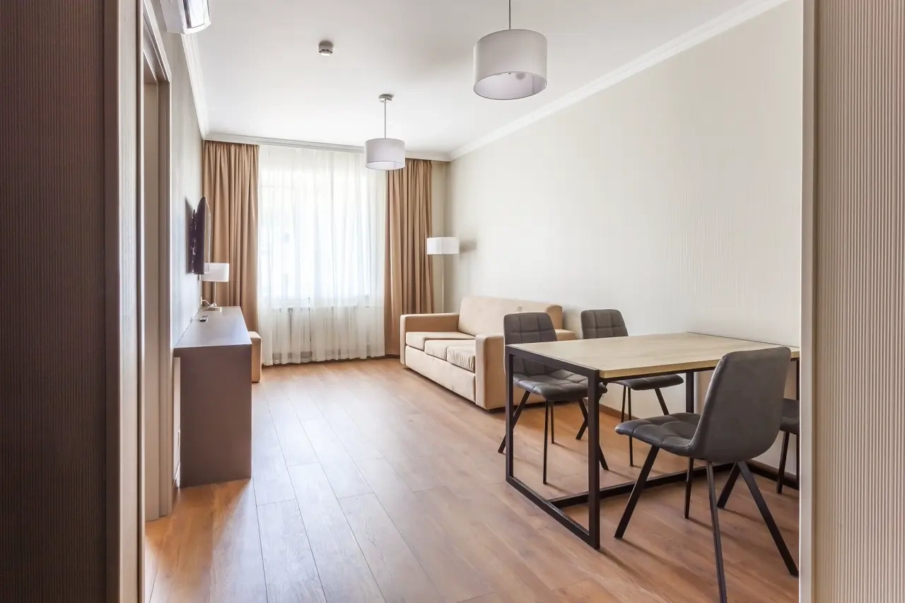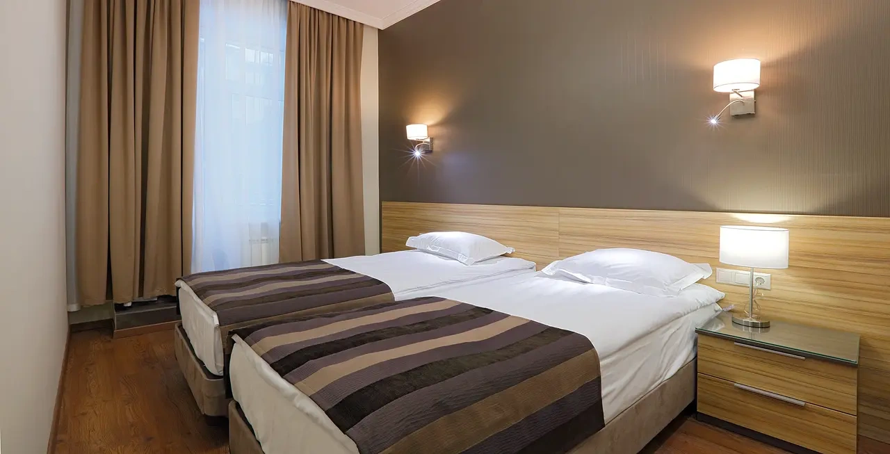 Апартаменты в которых предусмотрено все необходимое для комфортного проживания: спальня с двумя односпальными кроватями, гостиная с оборудованной зоной кухни. Современная функциональная бытовая техника: индукционная панель, микроволновая печь, чайник, холодильник, телевизор. Есть посуда и столовые приборы. В некоторых номерах предоставлена духовка. В каждом номере есть своя ванная комната с душевой кабиной или ванной.
