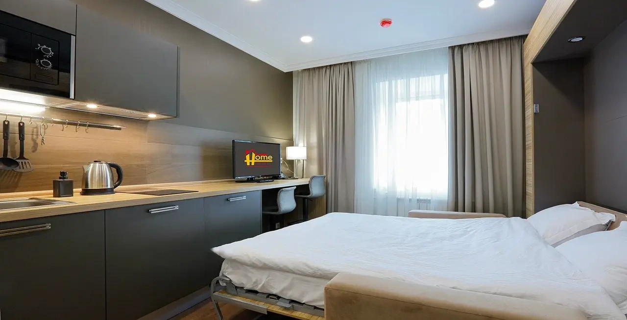 Небольшая уютная студия с кроватью-трансформером ожидает своих гостей. В числе удобств кондиционер, собственная ванная комната с душевой кабиной, фен, полотенца, постельное белье, кухня с микроволновой печью, чайником, холодильником и плитой, кухонные принадлежности, телевизор, сейф.