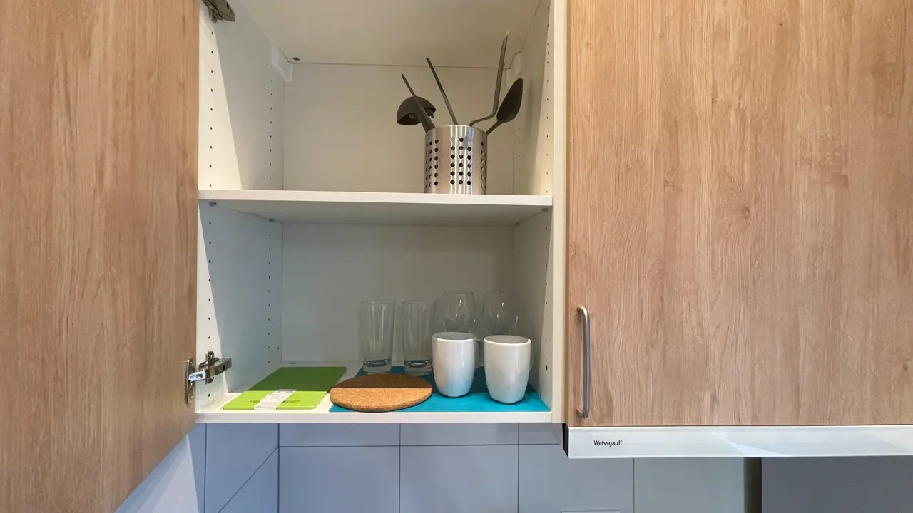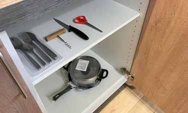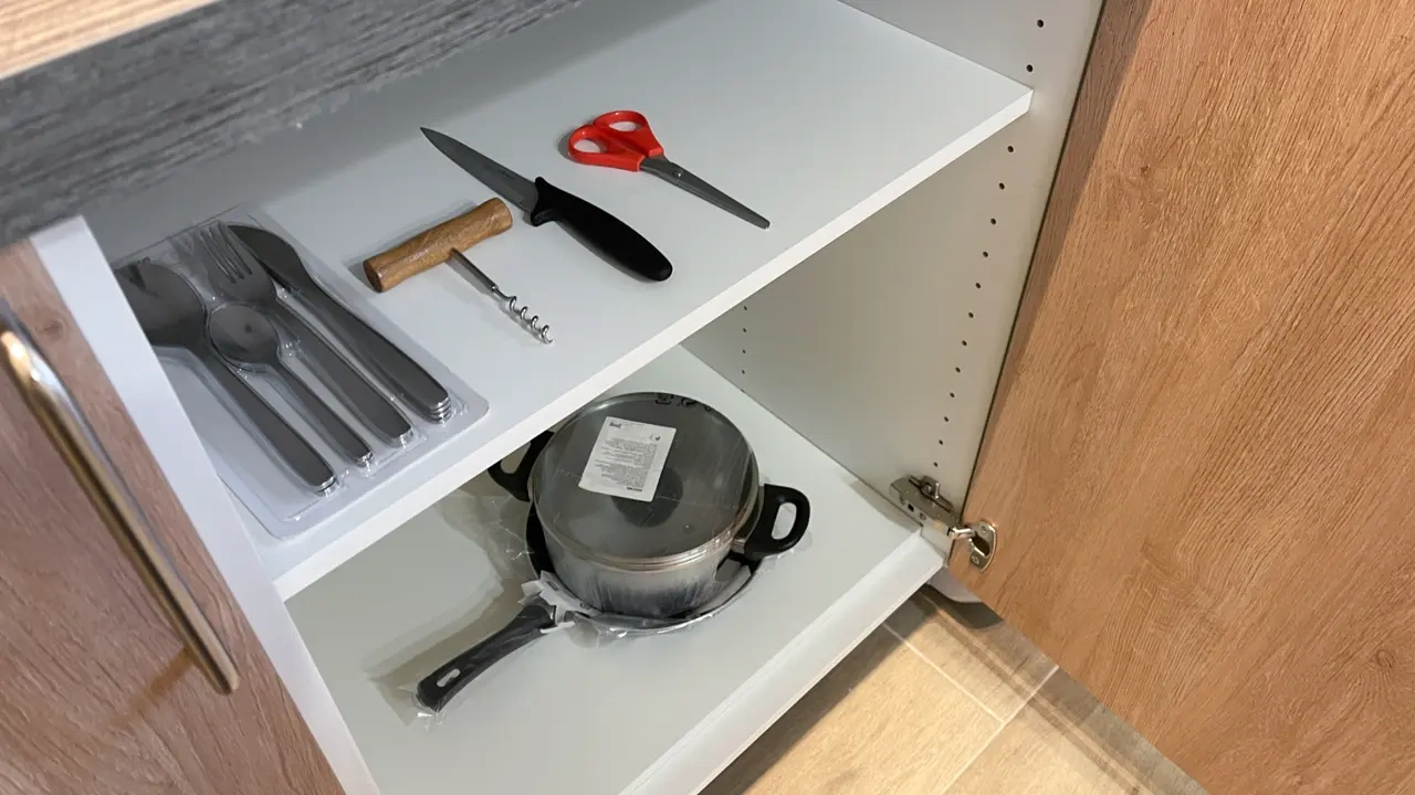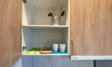 - Стильный кухонный гарнитур со всем необходимым для приготовления любимой домашней еды (техника, кухонные принадлежности, посуда, столовые приборы)