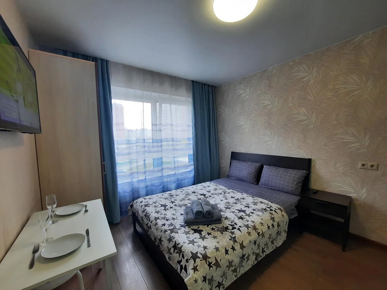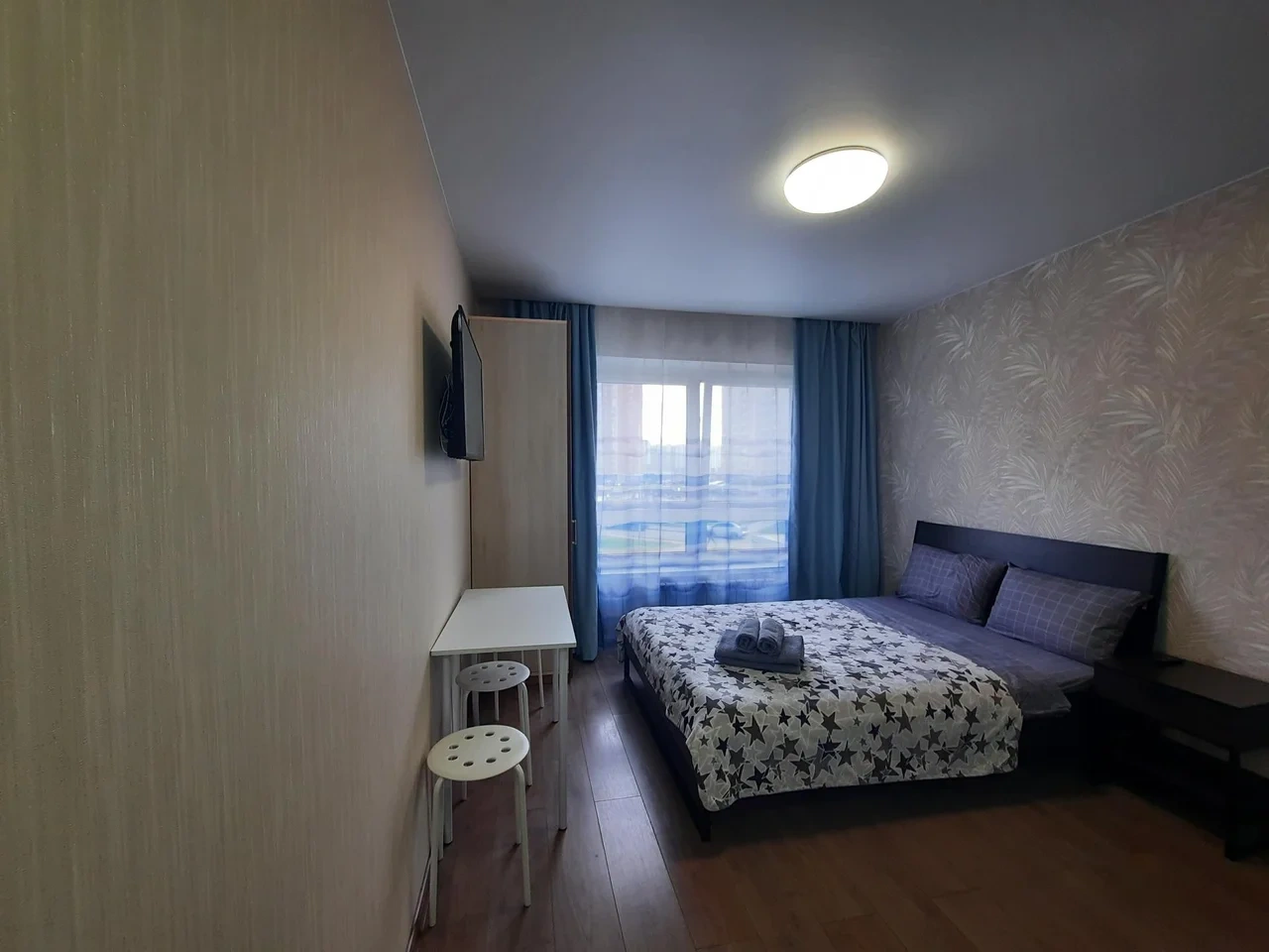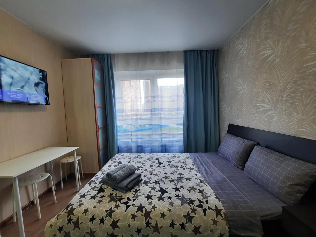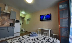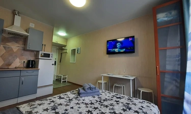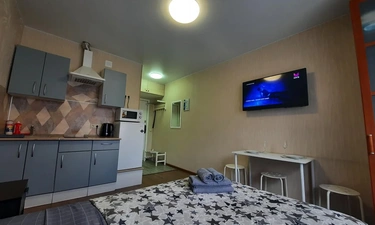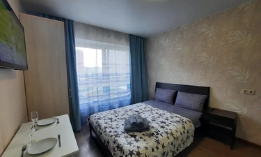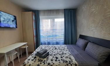 В квартире имеется двуспальная кровать с удобным ортопедическим матрасом. Плательный шкаф, телевизор.