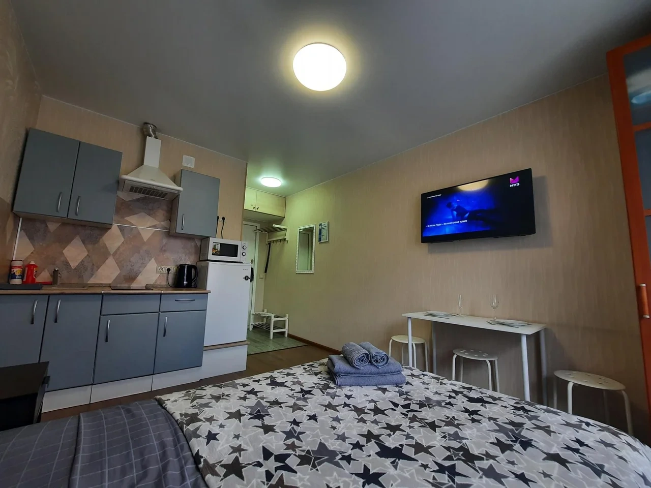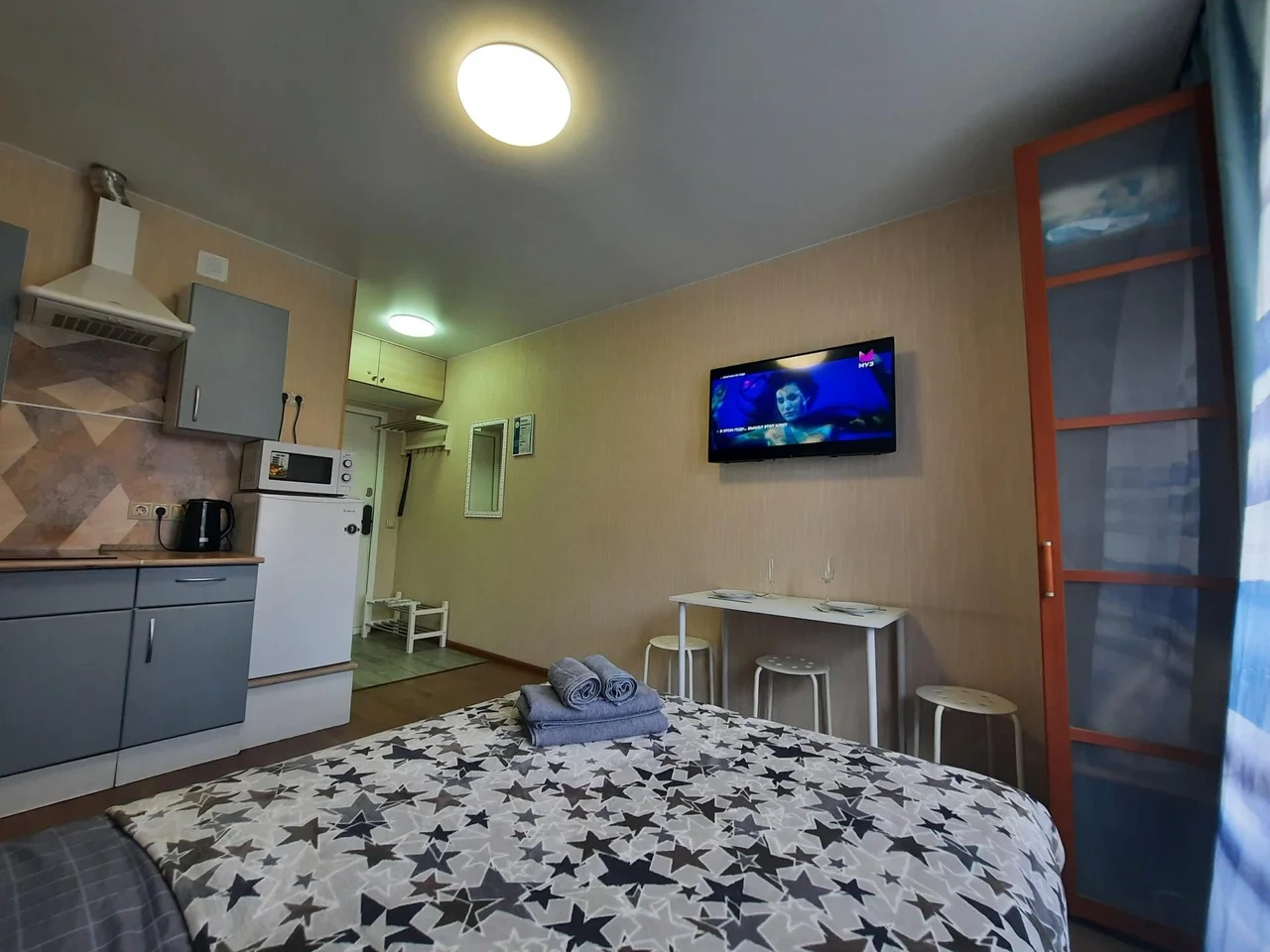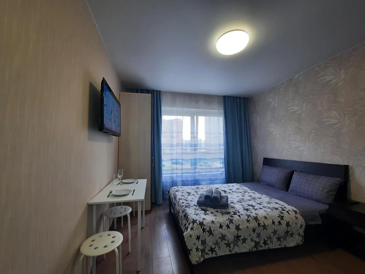 В квартире имеется двуспальная кровать с удобным ортопедическим матрасом. Плательный шкаф, телевизор.
