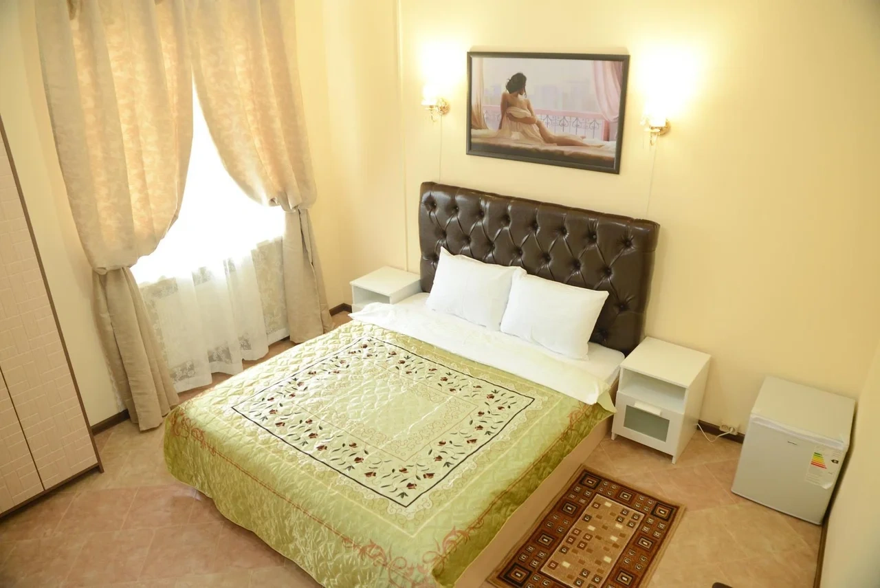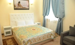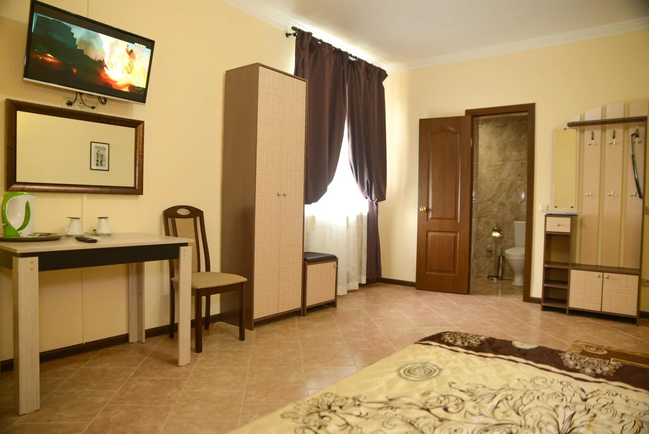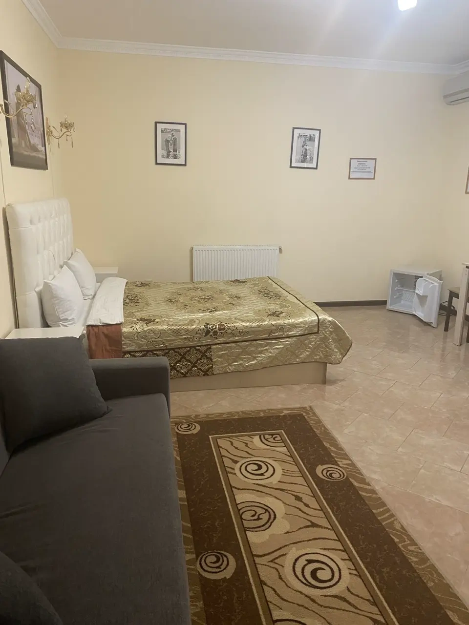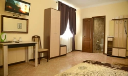 Номер Комфорт со всеми удобствами. В номере большая двуспальная кровать, диван, шкаф, тумбочки, холодильник, фен, полотенца, гель для душа, шампунь, тапочки, чайник. Есть номера с кондиционерами.