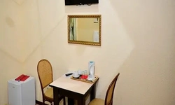 Номер Стандарт со всеми удобствами. В номере двуспальная кровать (160см), стол, стулья, тумбочки, холодильник, фен, полотенца, средства гигиены.