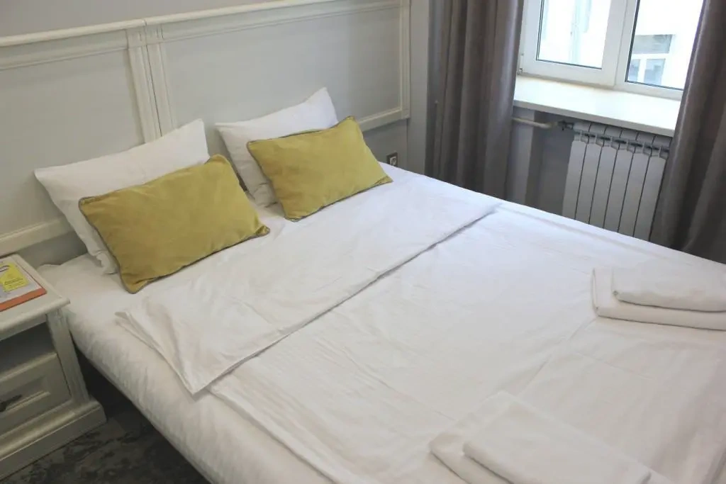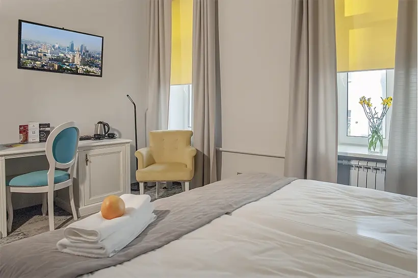 Современные двухместные номера площадью 26 м2 в современном стиле с новой мебелью и оборудованием . Номера оснащены всем необходимым для комфортного проживания: телефон с доступом в город, телевизор, кондиционер, электрический чайник с чайными принадлежностями, мини-бар. Большая кровать (Double bed ) и новое постельное белье. Ванная комната оснащена европейским сантехническим оборудованием. Мягкие полотенца, косметические принадлежности, вода при заезде - приятно порадуют гостей.