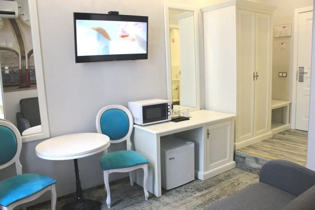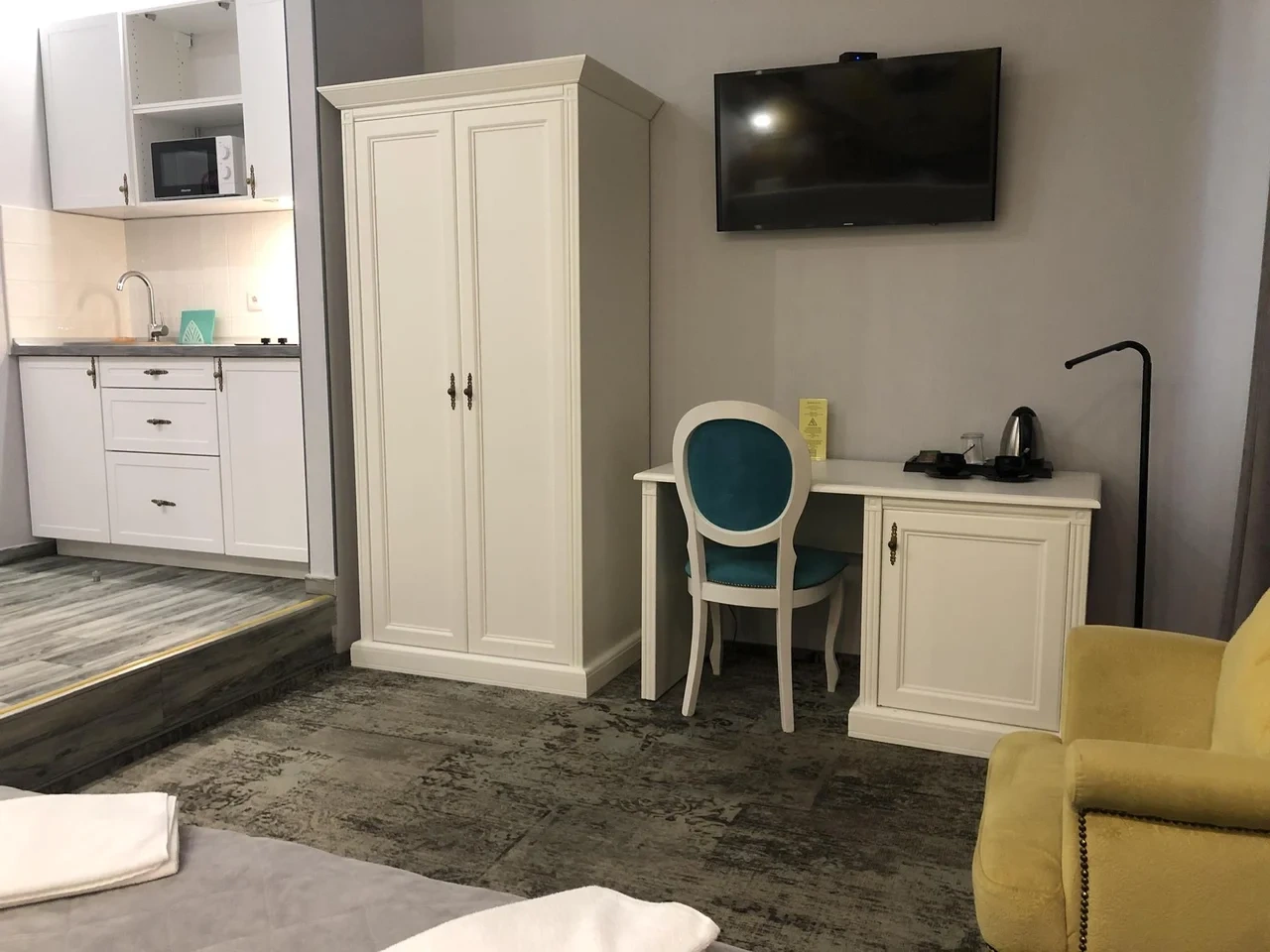 Апартаменты с большой двуспальной кроватью и мини-кухней. Идеально подходит для семей с детьми. Изысканная меблировка и декор, наличие кухонной плиты и телефонной связи. Номер оснащен мини-баром, чайной станцией с чайными принадлежностями, телевизором , феном ,кондиционером. Возможно для размещения семей с маленькими детьми. Наличие мягкого халата и пушистых полотенец помогут создают домашнюю атмосферу. Ванная комната оснащена немецким сантехническим оборудованием.Площадь номера варьируется от 24 до 28 кв.м. Планировка номера возможна в трех различных вариантах.