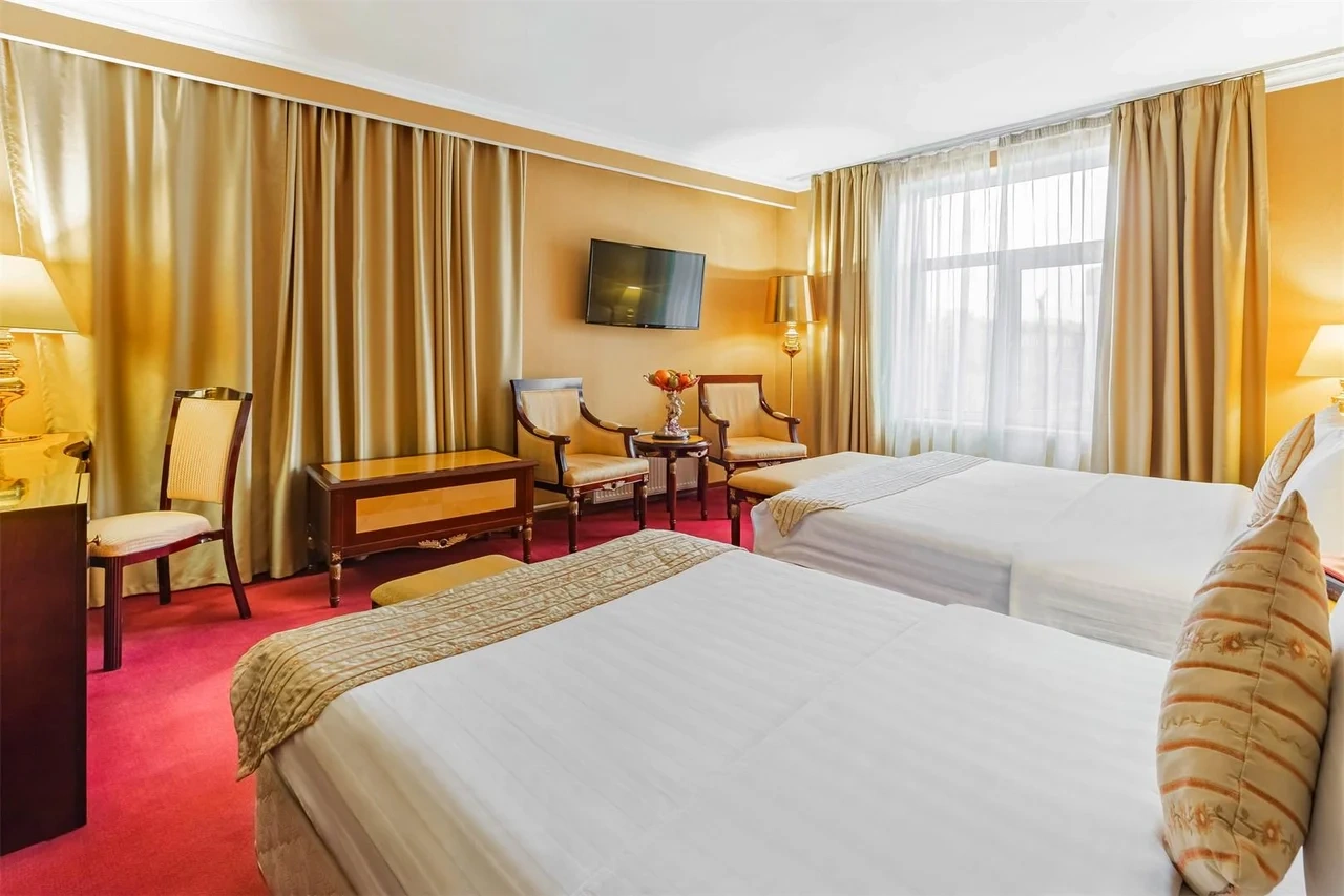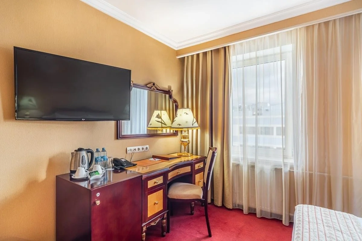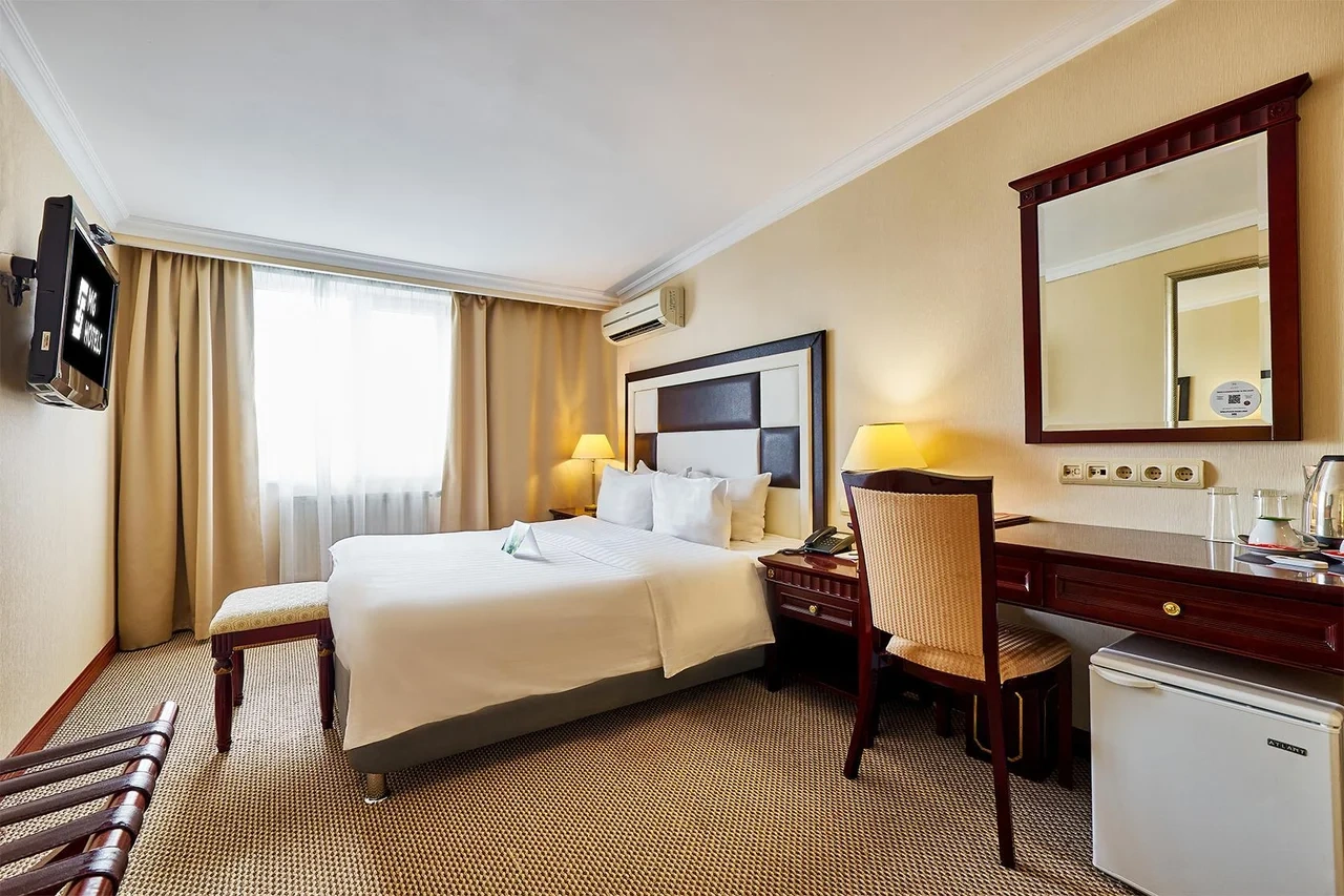 Уютный двухместный номер категории «Стандарт» – прекрасный вариант для недорогого, но комфортного размещения двух человек. В таком номере все располагает к комфортному отдыху: продуманный интерьер создает уют, комфортная кровать - 1 двуспальная (160см*200см либо 180см*200см) или две раздельные (90см*200см либо 120см*200см) с современным ортопедическим матрасом обещает крепкий сон. Плазменная панель и доступ к интерактивному спутниковому телевидению разнообразят досуг. Если в поездке вам нужно поработать — в вашем распоряжении удобный рабочий стол и высокоскоростной беспроводной интернет. Ценные вещи и документы можно оставить в сейфе. Также номера укомплектованы мини-баром, чайной станцией, телефоном, феном, гладильными принадлежностями. Ежедневно при жилой уборке происходит пополнение гигиенических принадлежностей, питьевой воды, чая и сахара. Мини-бар не входит в стоимость номера и оплачивается отдельно. Под запрос предоставляются халаты, косметический и бритвенный наборы. Окна номеров категории «Стандарт» выходят в уютный атриум отеля либо в коридор — вашему отдыху не помешает шум!