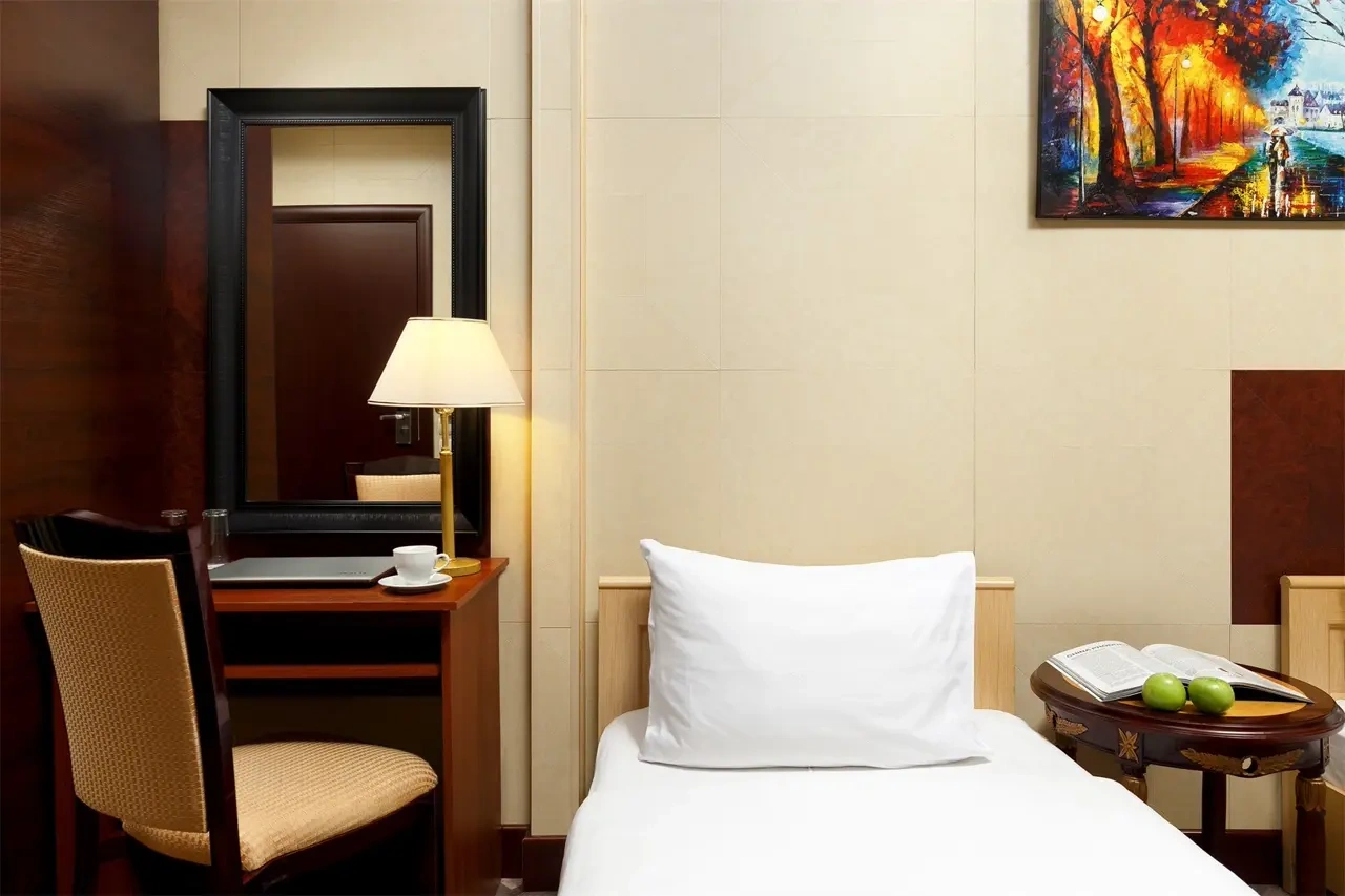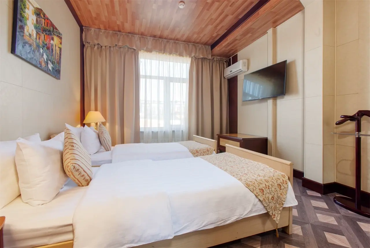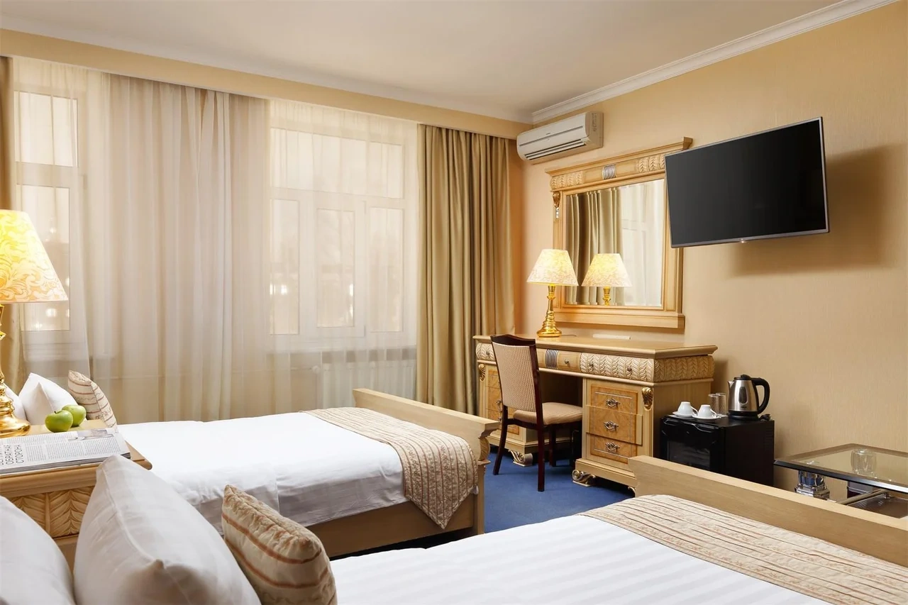 Уютный двухместный номер категории «Стандарт» – прекрасный вариант для недорогого, но комфортного размещения двух человек. В таком номере все располагает к комфортному отдыху: продуманный интерьер создает уют, комфортная кровать - 1 двуспальная (160см*200см либо 180см*200см) или две раздельные (90см*200см либо 120см*200см) с современным ортопедическим матрасом обещает крепкий сон. Плазменная панель и доступ к интерактивному спутниковому телевидению разнообразят досуг. Если в поездке вам нужно поработать — в вашем распоряжении удобный рабочий стол и высокоскоростной беспроводной интернет. Ценные вещи и документы можно оставить в сейфе. Также номера укомплектованы мини-баром, чайной станцией, телефоном, феном, гладильными принадлежностями. Ежедневно при жилой уборке происходит пополнение гигиенических принадлежностей, питьевой воды, чая и сахара. Мини-бар не входит в стоимость номера и оплачивается отдельно. Под запрос предоставляются халаты, косметический и бритвенный наборы. Окна номеров категории «Стандарт» выходят в уютный атриум отеля либо в коридор — вашему отдыху не помешает шум!