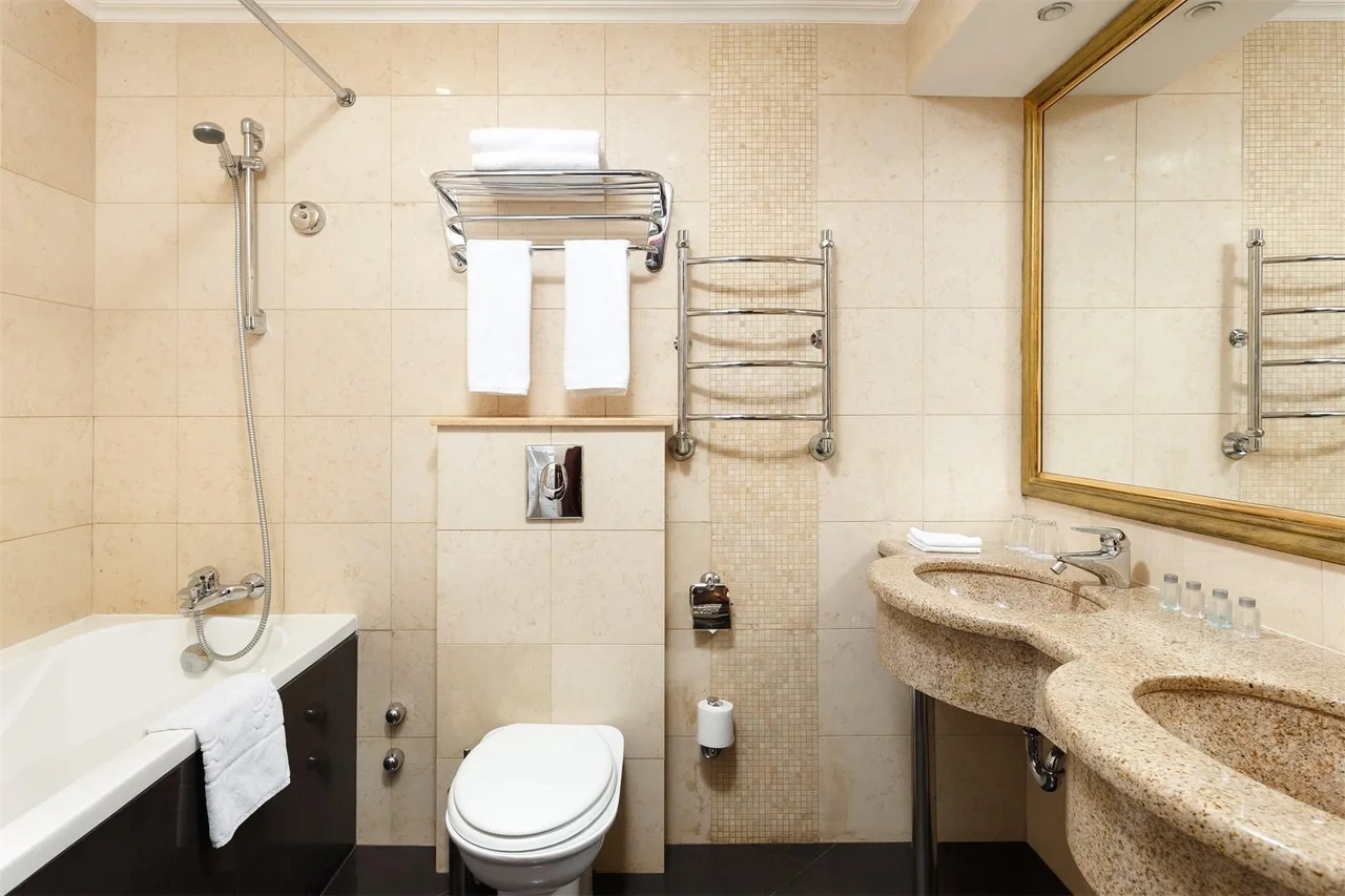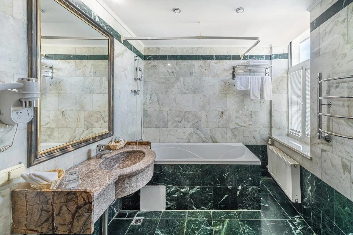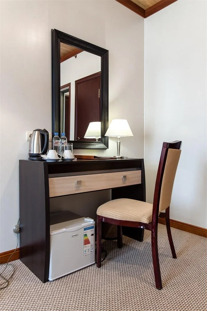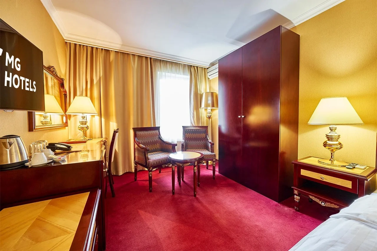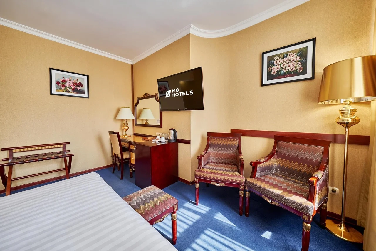 Номер категории «Бизнес» – оптимальный вариант как для рабочей поездки или встречи с деловыми партнерами, так и для романтического отдыха. Широкая кровать размера «King size» с ортопедическим матрасом гарантирует вам прекрасный сон. Теплые тона отделки дарят ощущение комфорта и способствуют расслаблению, мебель из ценных пород дерева выглядит изысканно и одновременно солидно. Интерьер номера тщательно продуман, здесь есть все, что может понадобиться во время отдыха. Ценные вещи и документы можно оставить в сейфе. Номера укомплектованы мини-баром, чайной станцией, телефоном, феном, гладильными принадлежностями и халатами. Ежедневно при жилой уборке происходит пополнение гигиенических принадлежностей, питьевой воды, чая и сахара. Мини-бар не входит в стоимость номера и оплачивается отдельно. Под запрос предоставляются косметический и бритвенный наборы. Окна номера выходят на тихую улицу, внутренний двор и на город, так что можете быть уверены: вашему отдыху не помешает шум.