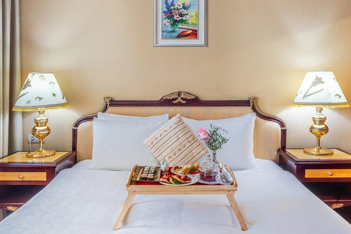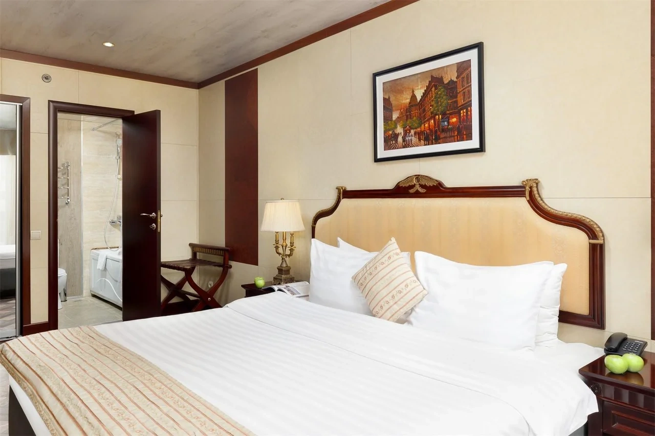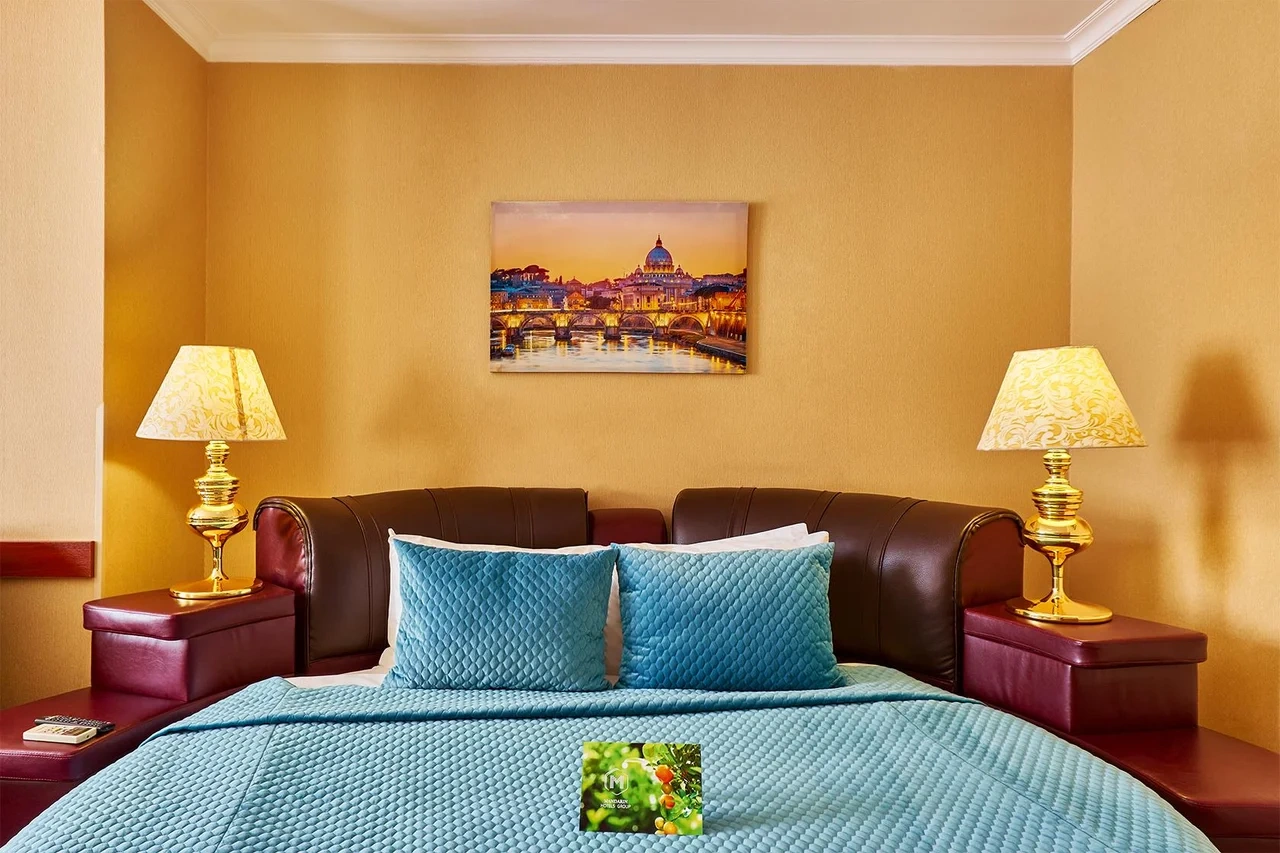 Шикарный номер категории «Делюкс» – оптимальный выбор для солидного человека, влюбленной пары, молодоженов. Просторный и комфортный, с тщательно продуманным интерьером — здесь есть все, что может понадобиться вам во время отдыха. Интерьер выдержан в приятной теплой гамме, которая располагает к спокойному отдыху после насыщенного дня. Широкая двухместная кровать размера «King Size» снабжена ортопедическим матрасом, который гарантирует великолепный сон, а современная система климат-контроля обеспечит оптимальную температуру и максимальный уют в номере. В номере есть удобный письменный стол и высокоскоростной Wi-Fi, а также индивидуальный сейф для ценных вещей и документов. Номера укомплектованы мини-баром, чайной станцией, телефоном, феном, гладильными принадлежностями и халатами. Ежедневно при жилой уборке происходит пополнение гигиенических принадлежностей, питьевой воды, чая и сахара. Мини-бар не входит в стоимость номера и оплачивается отдельно. Под запрос предоставляются косметический и бритвенный наборы. Окна номера выходят на тихую улицу, внутренний двор и на город, так что можете быть уверены: вашему отдыху не помешает шум.