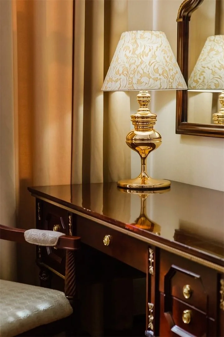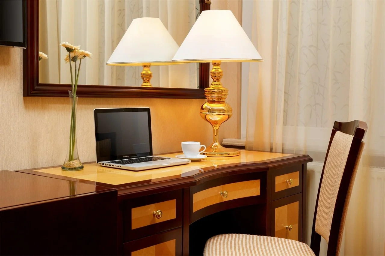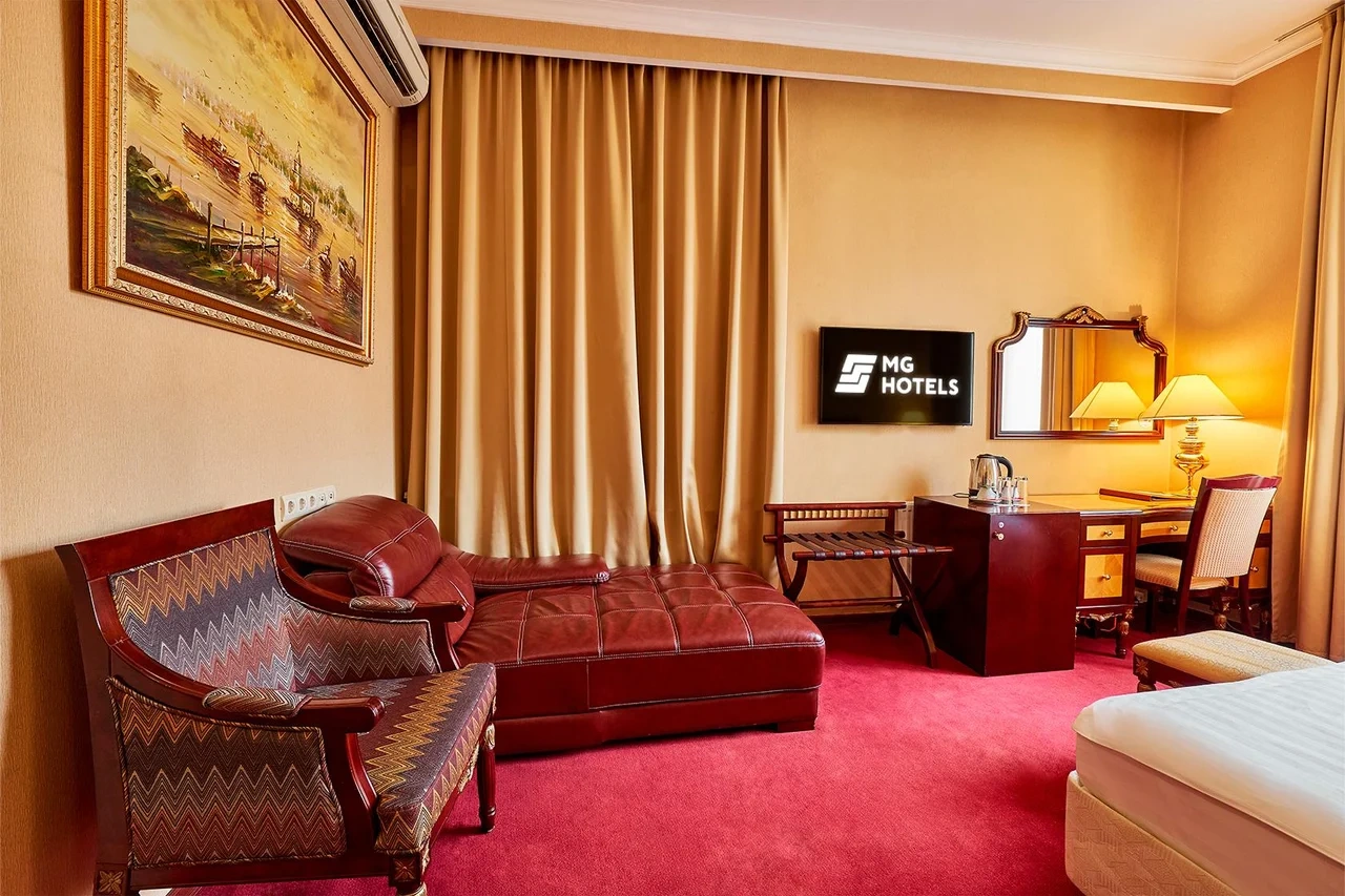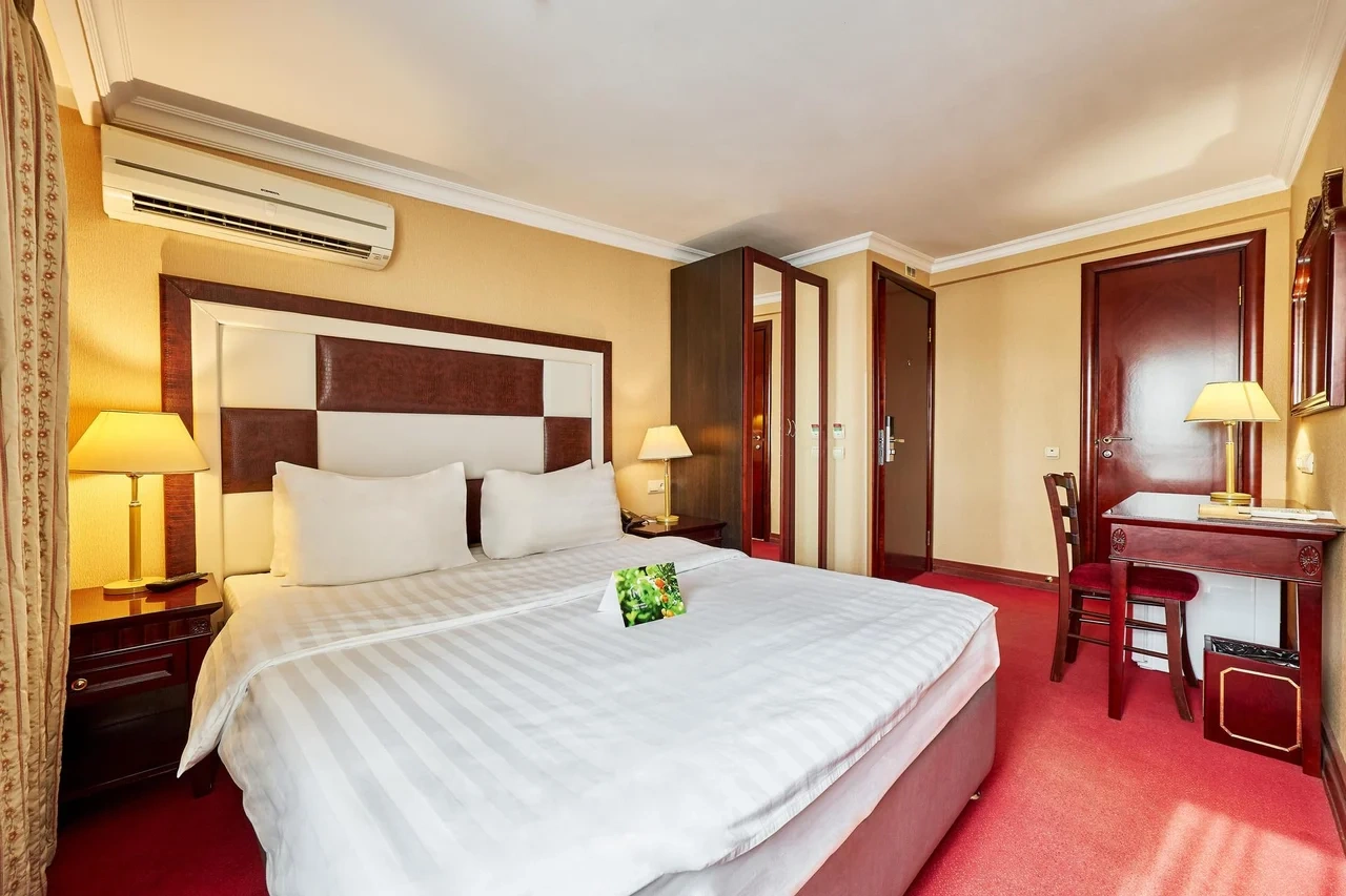 Шикарный номер категории «Делюкс» – оптимальный выбор для солидного человека, влюбленной пары, молодоженов. Просторный и комфортный, с тщательно продуманным интерьером — здесь есть все, что может понадобиться вам во время отдыха. Интерьер выдержан в приятной теплой гамме, которая располагает к спокойному отдыху после насыщенного дня. Широкая двухместная кровать размера «King Size» снабжена ортопедическим матрасом, который гарантирует великолепный сон, а современная система климат-контроля обеспечит оптимальную температуру и максимальный уют в номере. В номере есть удобный письменный стол и высокоскоростной Wi-Fi, а также индивидуальный сейф для ценных вещей и документов. Номера укомплектованы мини-баром, чайной станцией, телефоном, феном, гладильными принадлежностями и халатами. Ежедневно при жилой уборке происходит пополнение гигиенических принадлежностей, питьевой воды, чая и сахара. Мини-бар не входит в стоимость номера и оплачивается отдельно. Под запрос предоставляются косметический и бритвенный наборы. Окна номера выходят на тихую улицу, внутренний двор и на город, так что можете быть уверены: вашему отдыху не помешает шум.