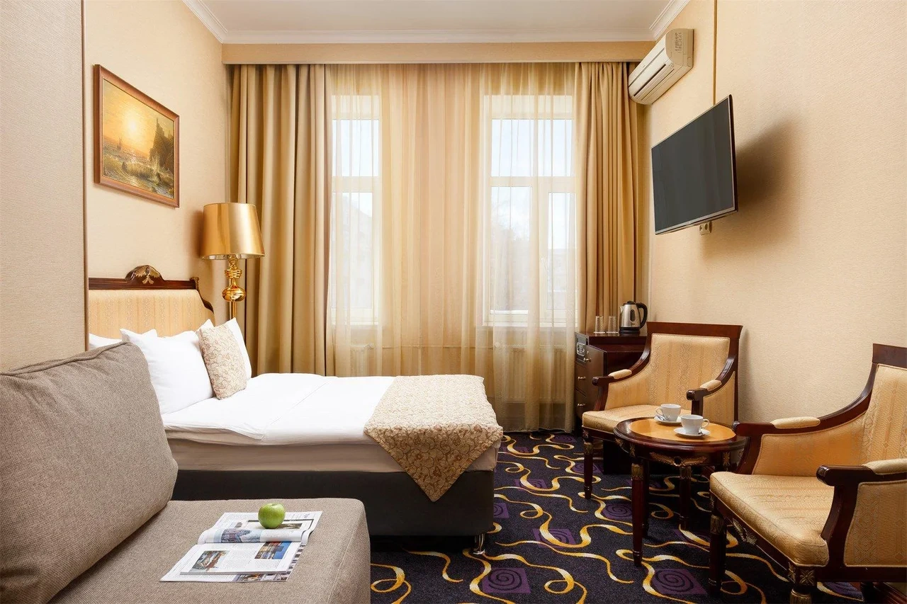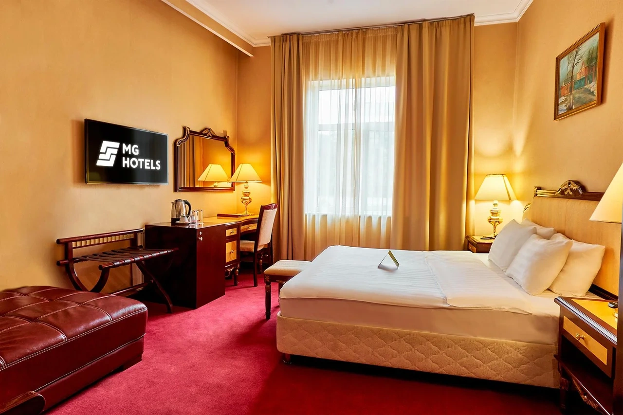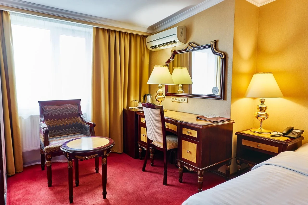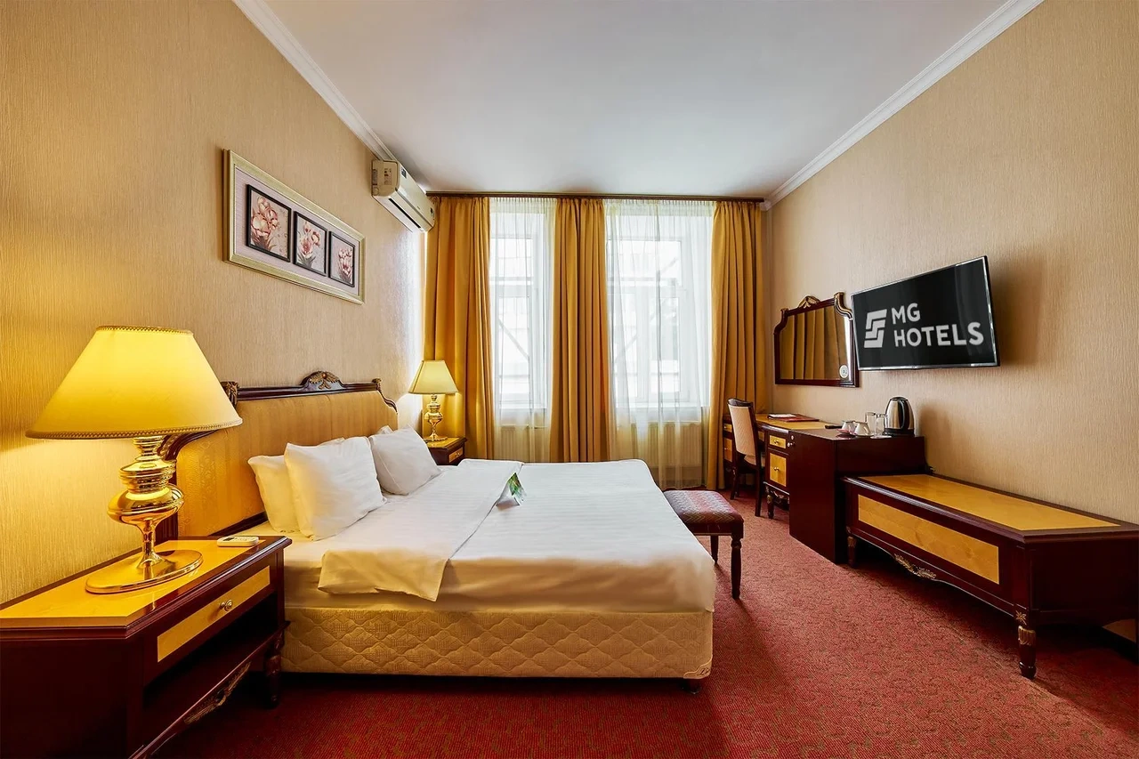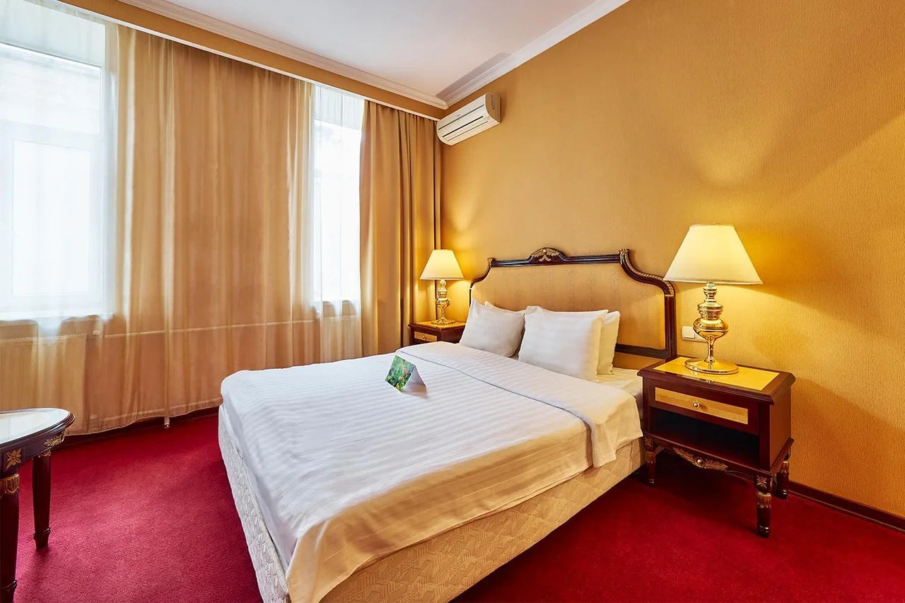 Двухместный номер категории «Стандарт» – прекрасный вариант для деловой поездки или отдыха пары. Небольшой, но очень комфортный номер отличается стильным интерьером в теплых тонах, которые лишь добавляют уюта, расслабляют и настраивают на отдых. Плазменная панель и доступ к интерактивному спутниковому телевидению разнообразят досуг. Если в поездке вам нужно поработать — в вашем распоряжении удобный рабочий стол и высокоскоростной беспроводной интернет. Ценные вещи и документы можно оставить в сейфе. Также номера укомплектованы мини-баром, чайной станцией, телефоном, феном, гладильными принадлежностями. Ежедневно при жилой уборке происходит пополнение гигиенических принадлежностей, питьевой воды, чая и сахара. Мини-бар не входит в стоимость номера и оплачивается отдельно. Под запрос предоставляются халаты, косметический и бритвенный наборы. Окна номера выходят на тихую улицу, внутренний двор и на город, так что можете быть уверены: вашему отдыху не помешает шум.
