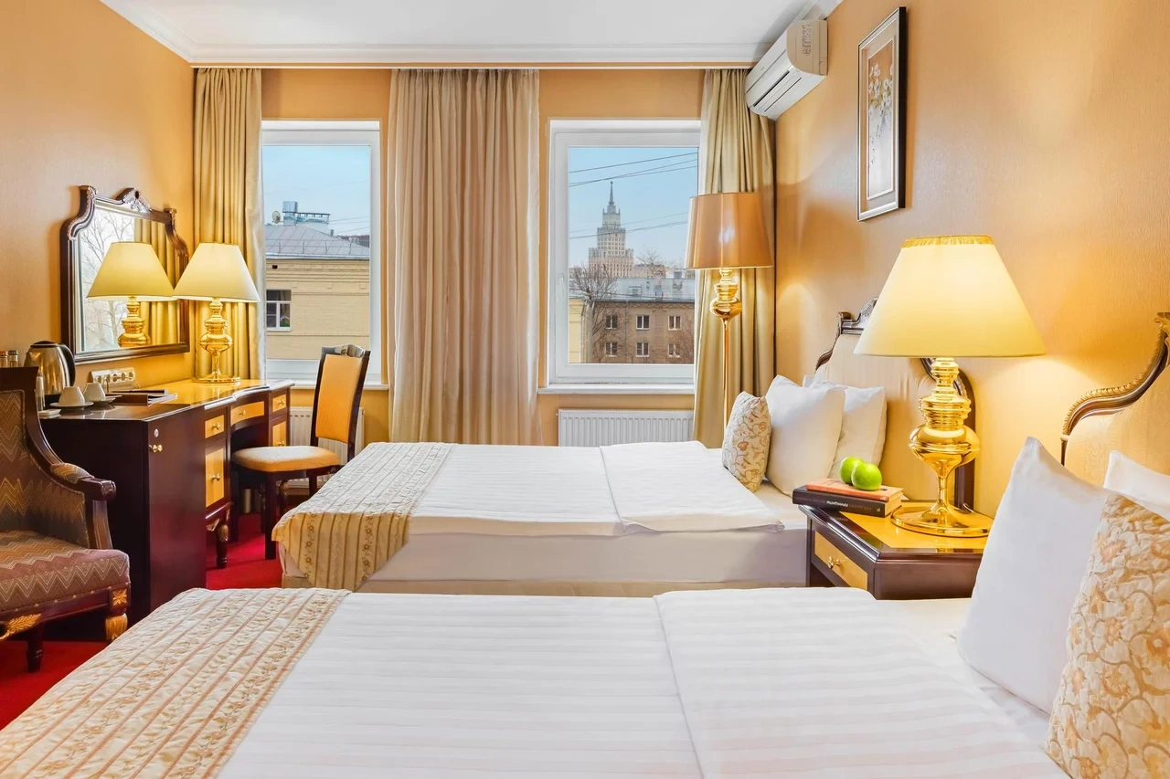 Просторный «семейный» номер с двумя комфортными кроватями — оптимальный вариант размещения для семьи с детьми или компании до 5 человек. Вариации кроватей: - 180х200 см и 140х200см; - 180х200 см и 120х200см; - 180х200 см и 90х200см. В номерах выделена гостиная зона с креслами и кофейным столиком. Если вам понадобится поработать — можно воспользоваться рабочей зоной с удобным письменным столом. Уходя на прогулку, вы можете оставить документы и ценности в мини-сейфе. В номере есть телевизор с интерактивным спутниковым ТВ, высокоскоростной интернет, мини-бар (не входит в стоимость номера и оплачивается отдельно), чайная станция, телефон, фен, гладильные принадлежности, халаты. Ежедневно при жилой уборке происходит пополнение гигиенических принадлежностей, питьевой воды, чая и сахара. Под запрос предоставляются косметический, бритвенный, швейный наборы. Окна номера выходят во внутренний двор, улицу либо атриум отеля. Дополнительные услуги (услуги прачечной, мини бар и т. д.) в стоимость не входят. За дополнительную плату (2000 руб/сутки) в номере возможно установить дополнительную кровать (питание оплачивается отдельно).