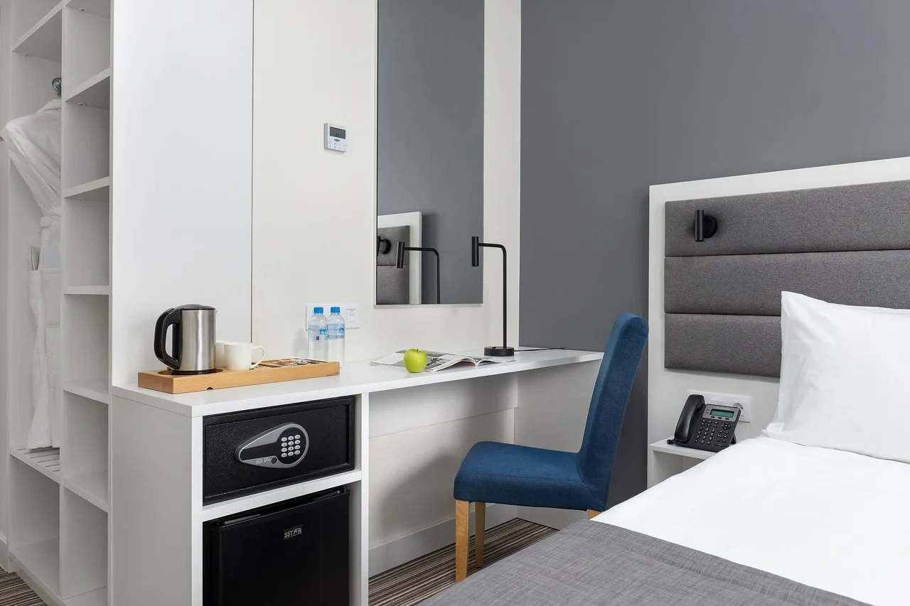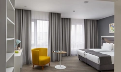 Однокомнатный номер с одной двуспальной или двумя односпальными кроватями, зоной отдыха (кресло и журнальный стол), рабочей зоной и просторной ванной комнатой.