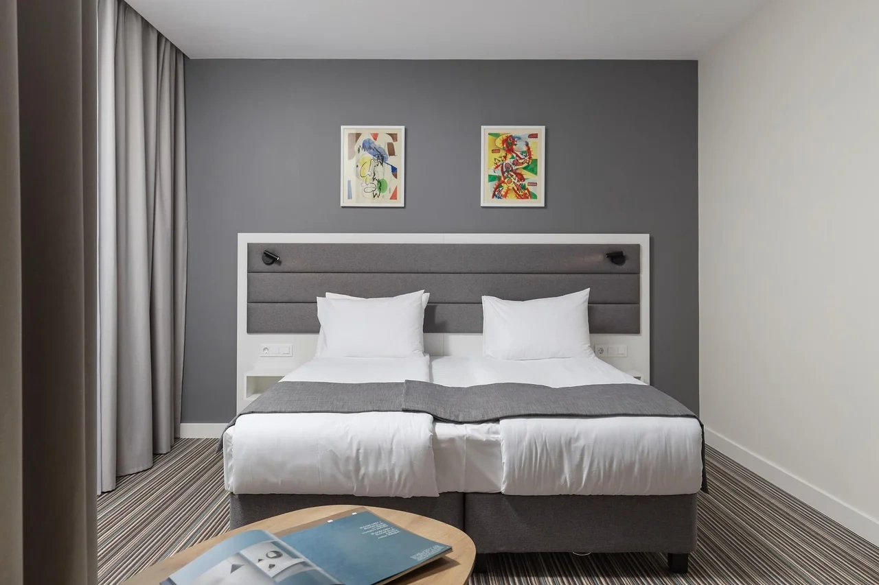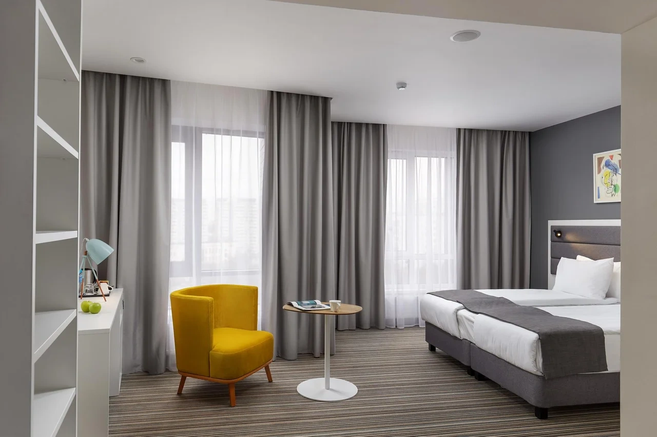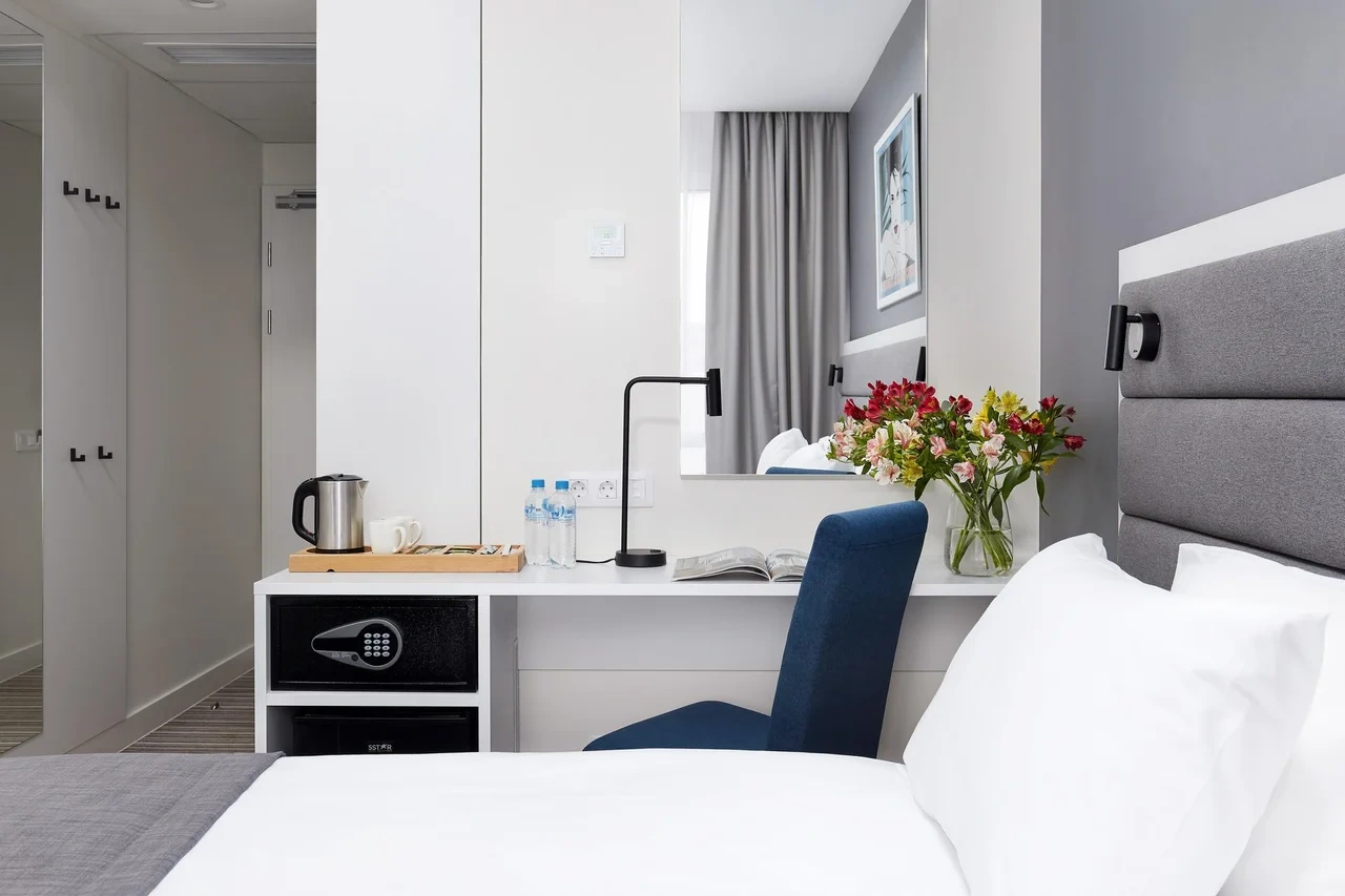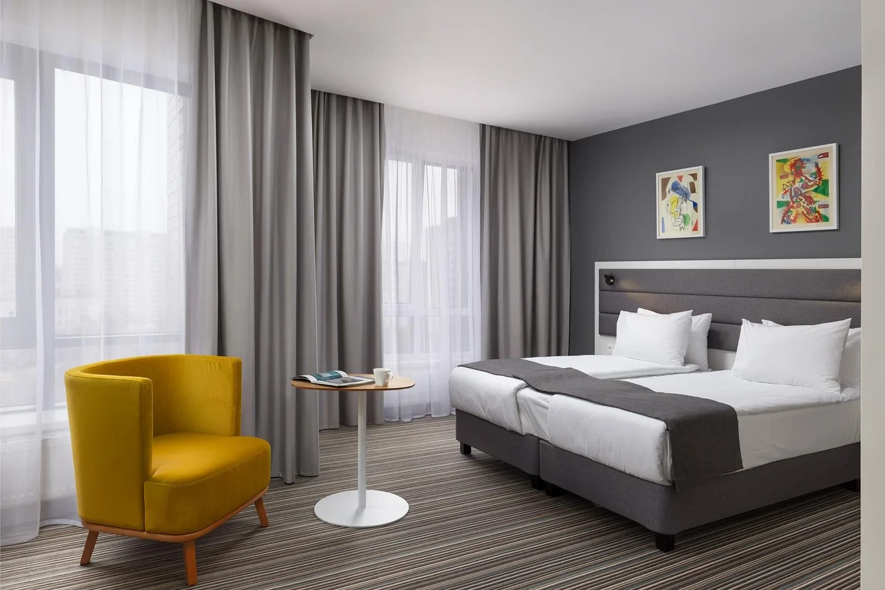 Однокомнатный номер в светлых тонах c двумя раздельными кроватями (90*200) и просторной ванной комнатой. Дети до 7 лет включительно размещаются бесплатно, без предоставления дополнительного места.