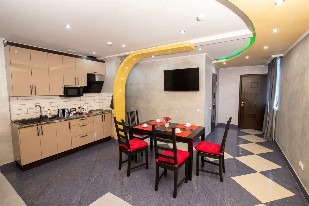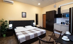 Номер с телевизором с плоским экраном, кондиционером, холодильником и полностью оборудованная кухня со всеми необходимыми кухонными принадлежностями. Большая ванная и душевая кабина, предоставляются бесплатные туалетно-косметические принадлежности и халат.
