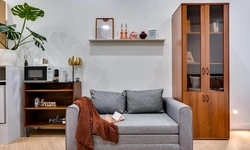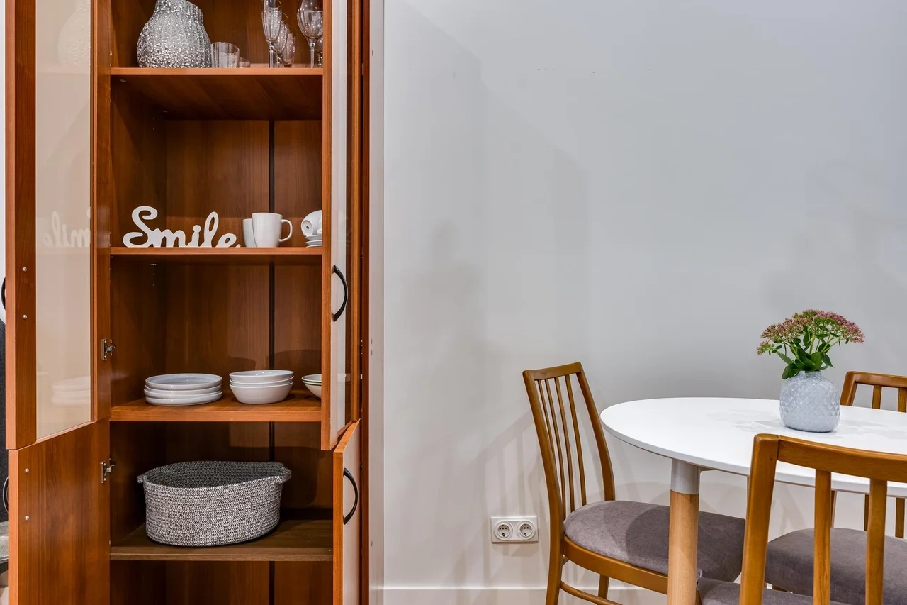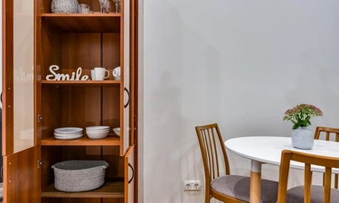 В ЗОНЕ КУХНИ ГОСТИНОЙ – стол со стульями, 2-х местный диван (раскладывается), посуда, столовые приборы, фужеры и чашки. Вы можете выбирать - приготовить что-нибудь вкусное самим, купить готовую еду в Азбуке Вкуса или ВкусВилл рядом.