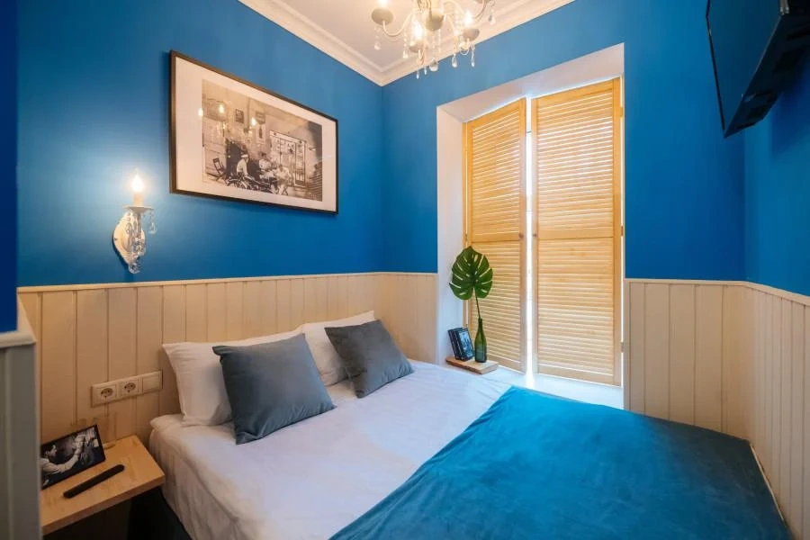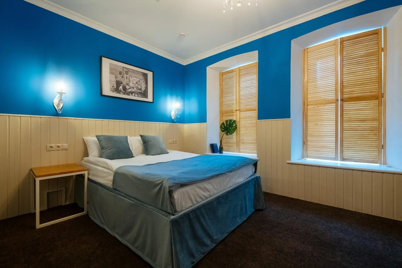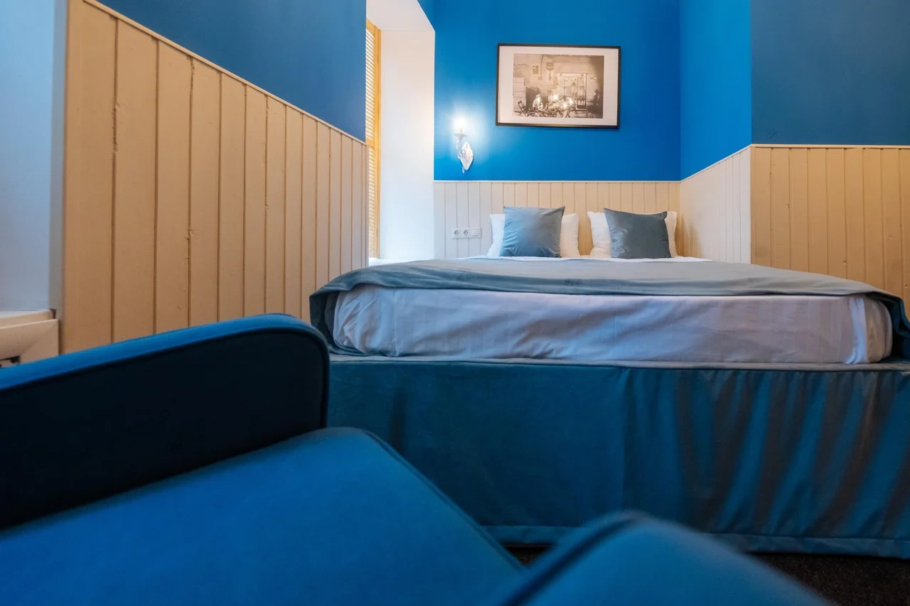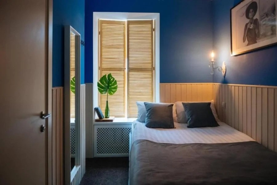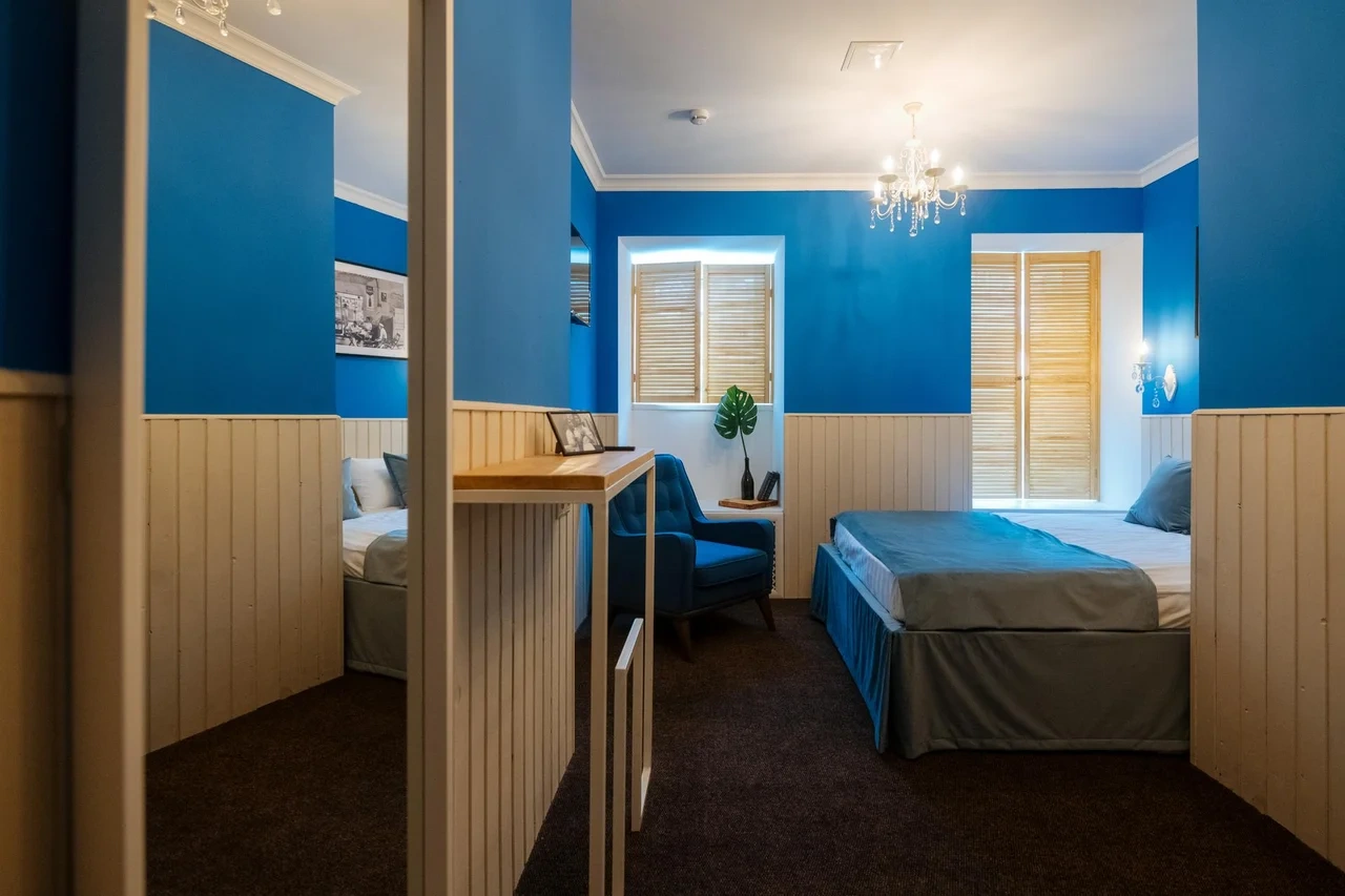 Прохладно, из-за того, что батарея закрыта кроватью. Нет банкетки и ложки для обуви. В номере пахнет сыростью, хотя номер сухой. Синий цвет придаёт неуютность. Если бы цвет номера был пастельный или бледно серый, смотрелся бы уютнее и создавалось бы ощущение теплоты.