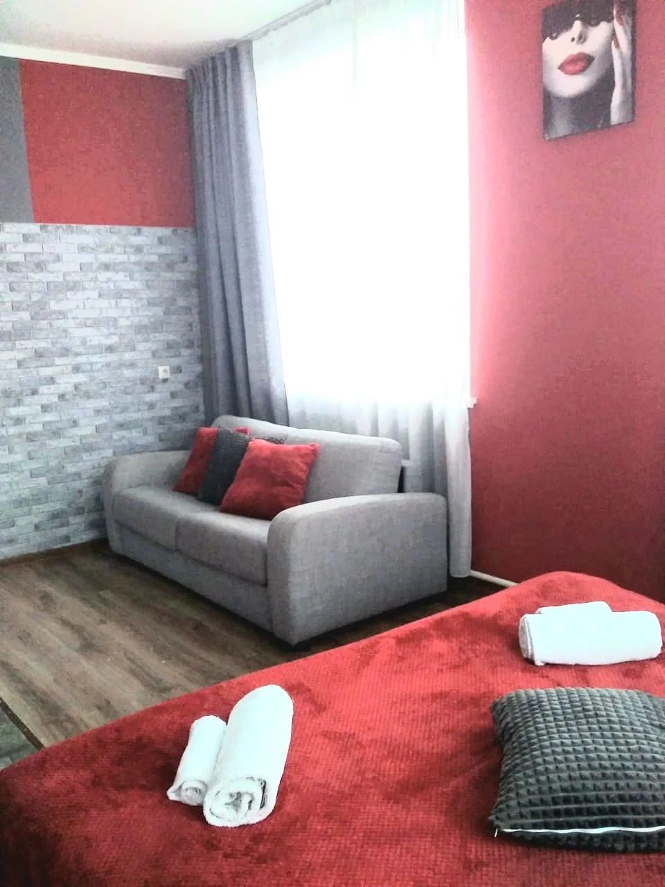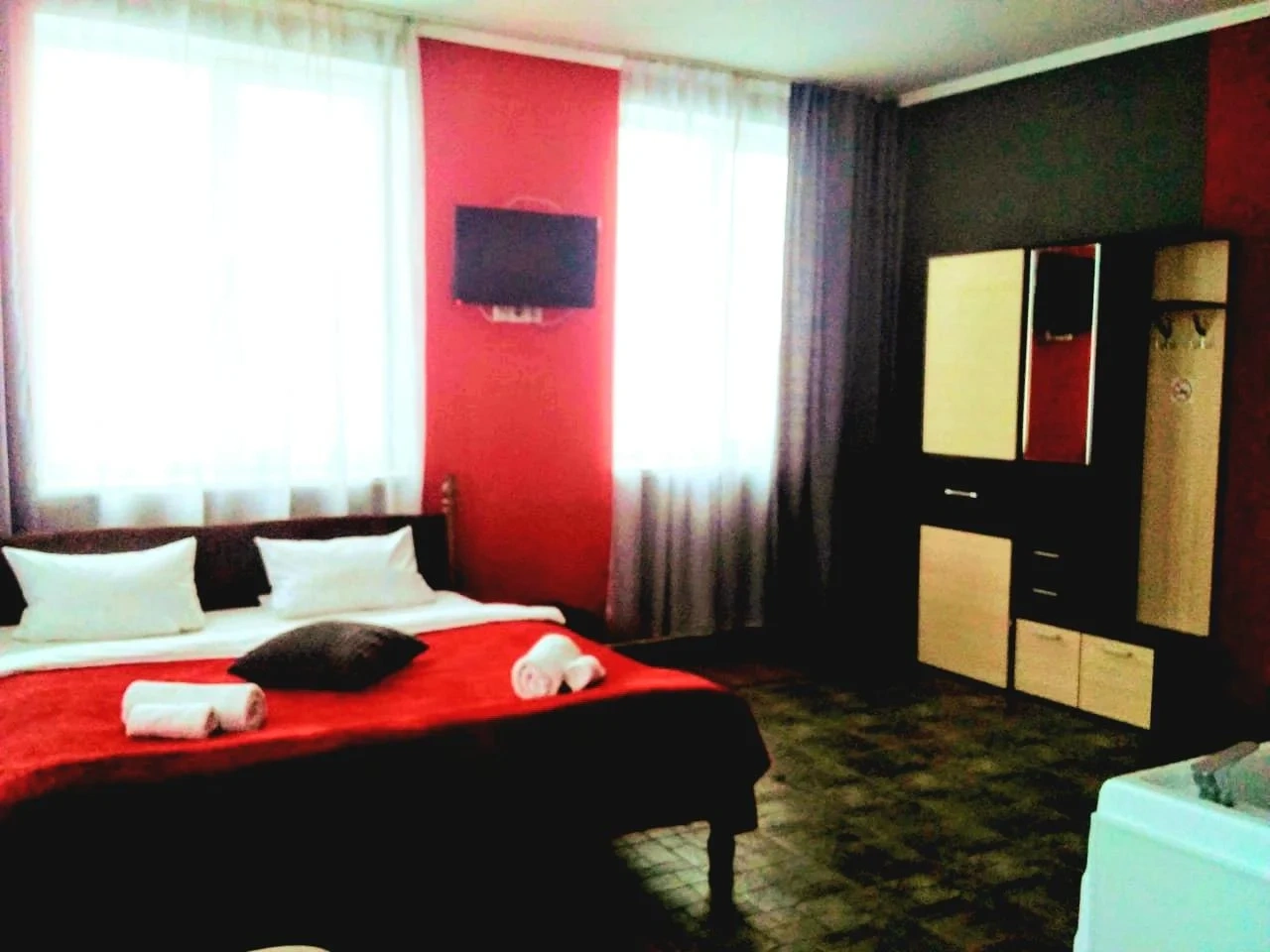 В комнате пахло куревом. Проветрить было не возможно, потому что окна выходили на шоссе и был всю ночь страшный шум от грузовых фур. Постель была в принципе удобная. В номере никаких излишеств. Не было шкафа, куда можно было повесить вещи. На одну ночь уставшим курящим путникам сгодится. На первом этаже бургеркинг круглосуточный.