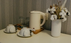 В номере есть небольшой холодильник и чайник, тем самым можно там же и перекусить. В отеле есть кухня, где можно разогреть еду.