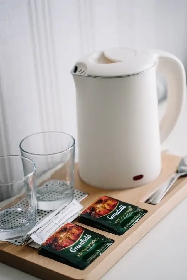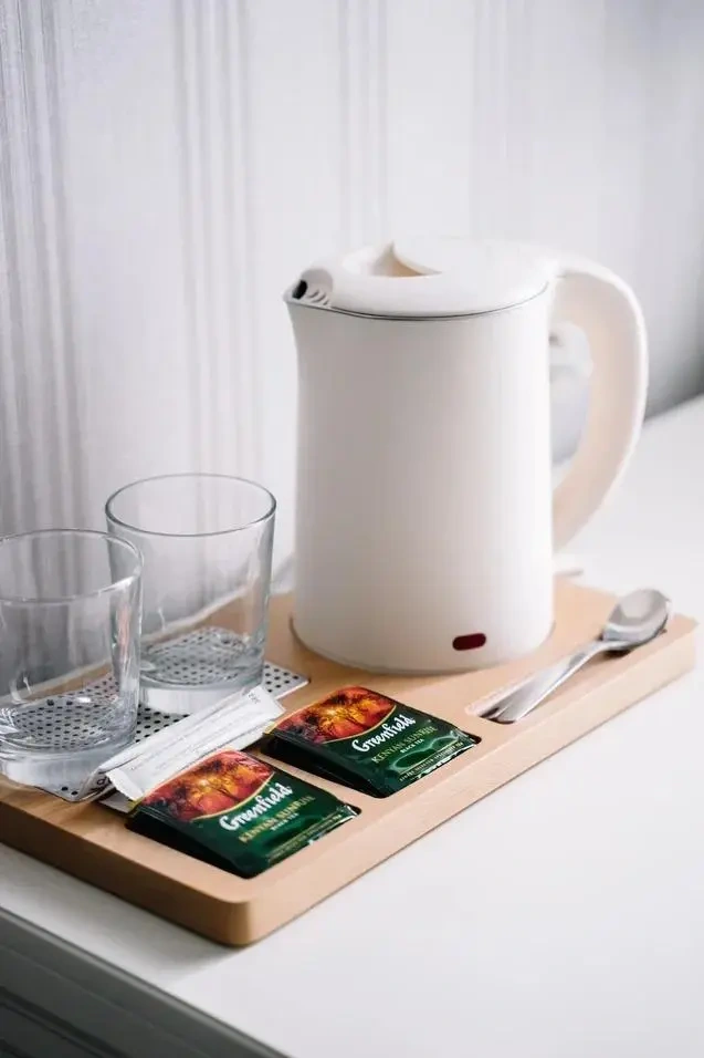 Расположение. Недалеко от метро. Чисто, все заявленное имеется. Есть термопот в обеденной зоне. В номере чайник, чай
