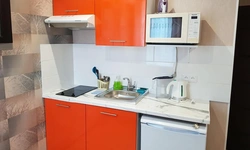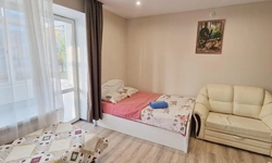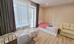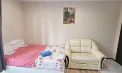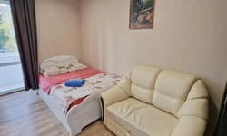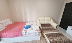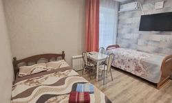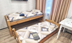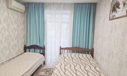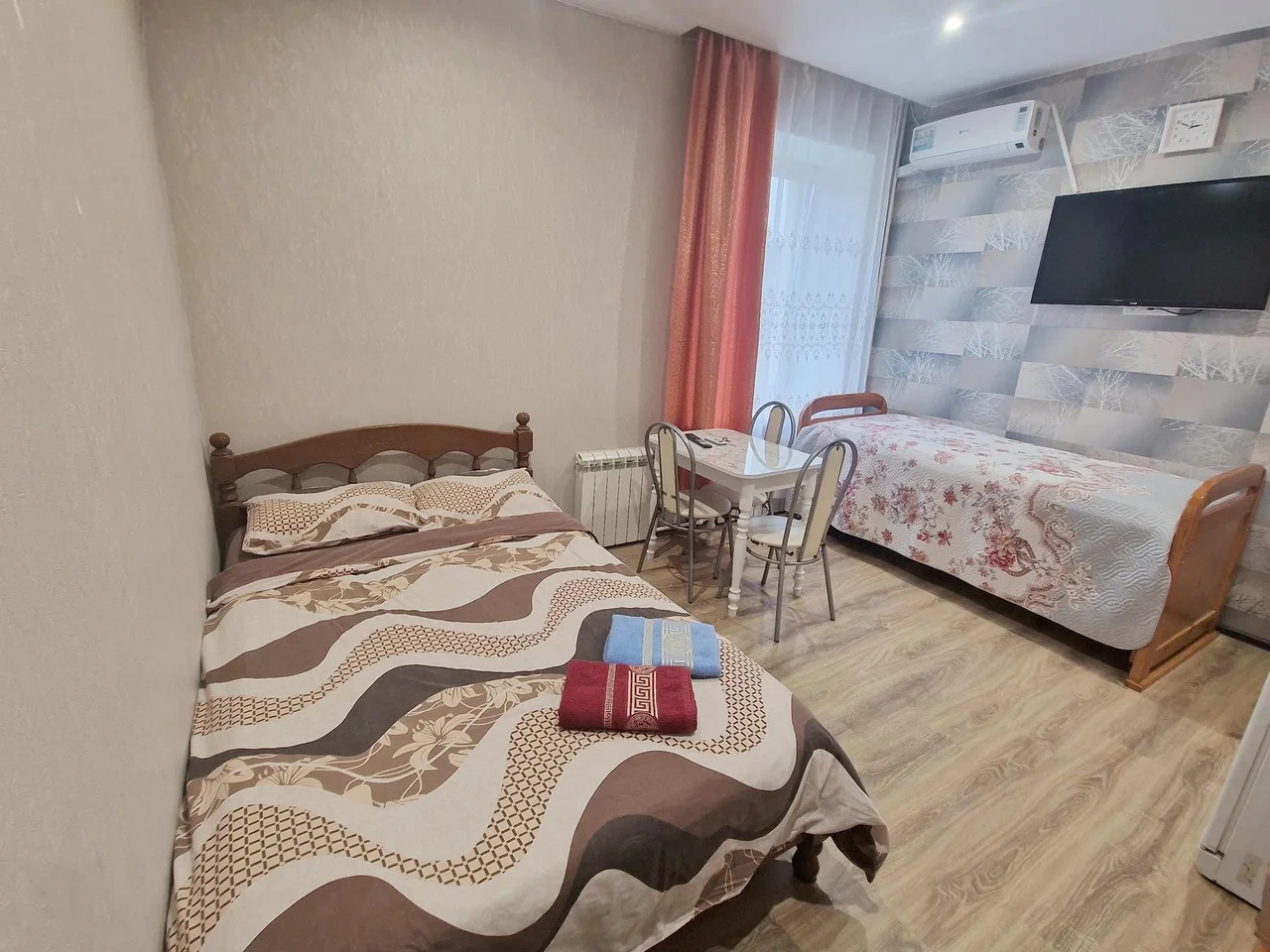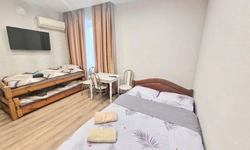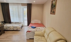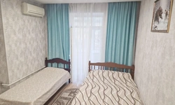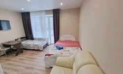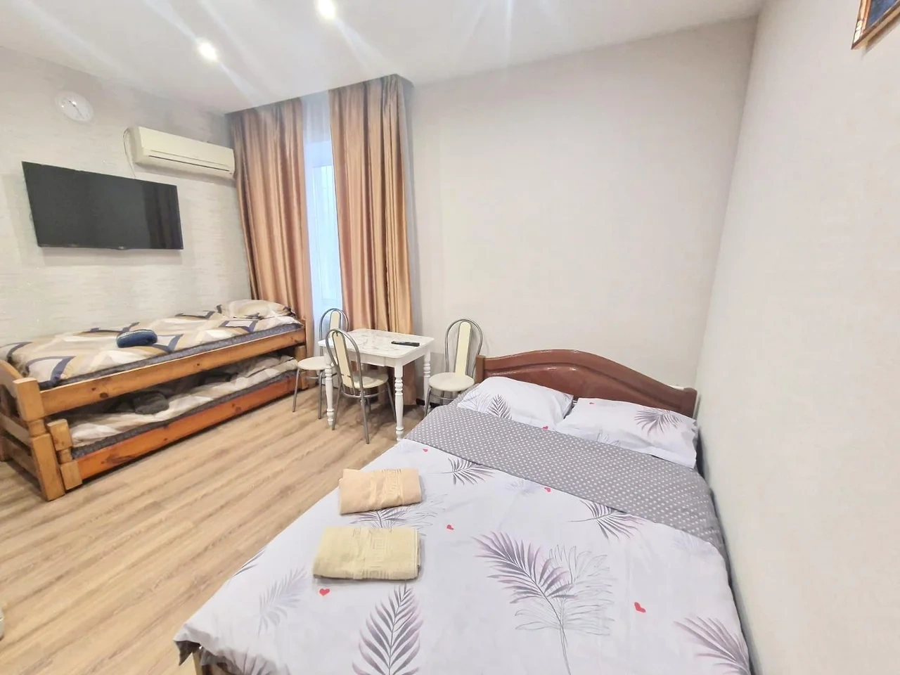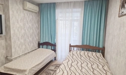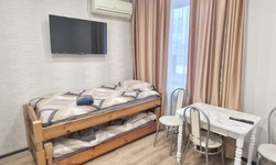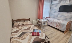 Четырехместный номер с кухней. Есть 1 двуспальная кровать, 1 односпальная кровать и раскладной диван. Кухня обеспечена всей необходимой техникой и посудой. В номере свой санузел - душ и туалет. Имеется кондиционер, телевизор и интернет.