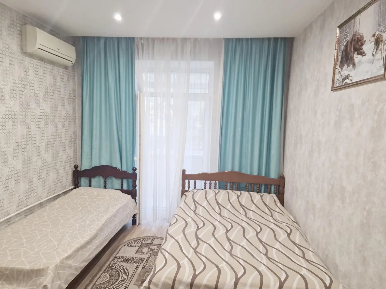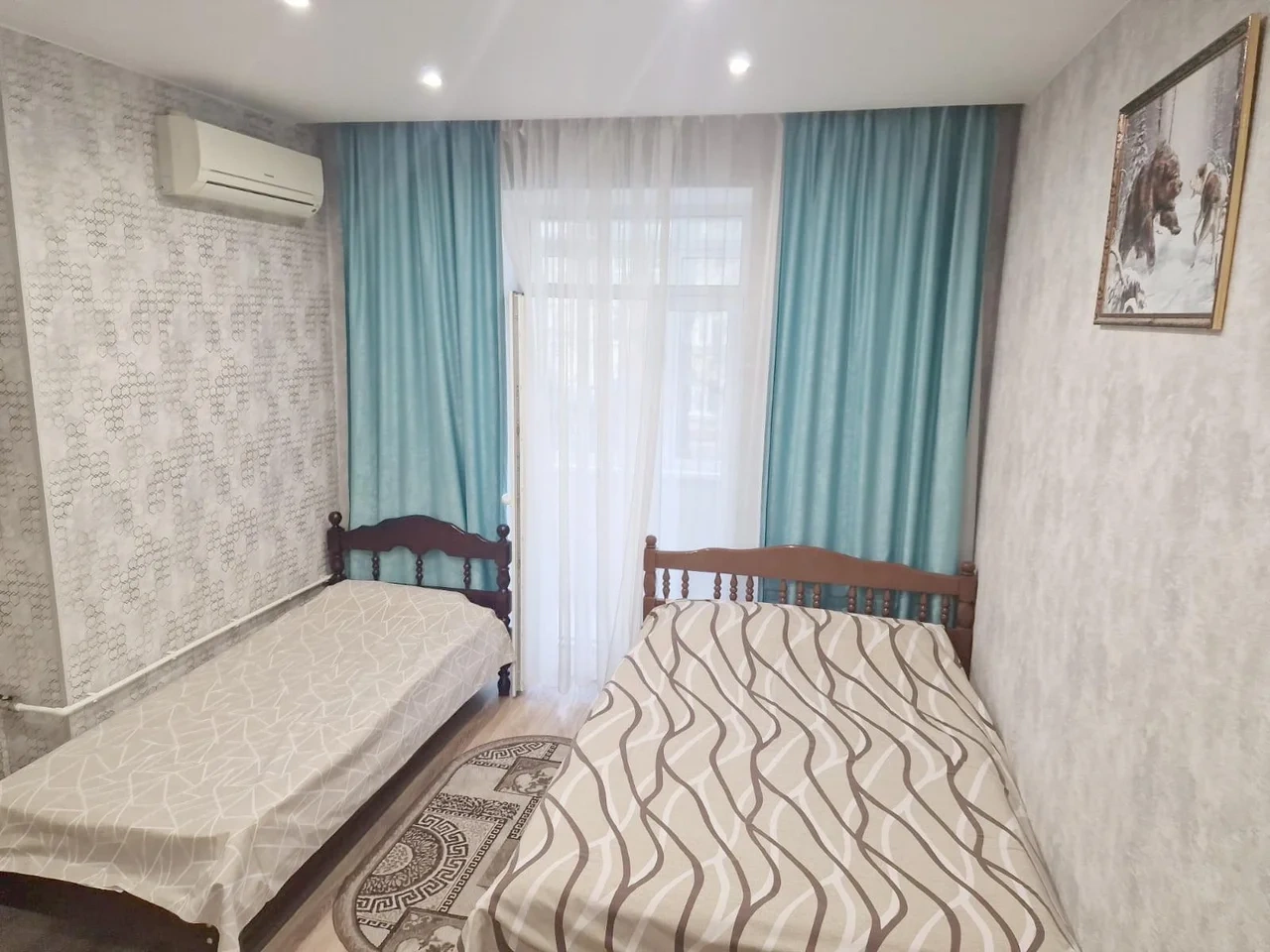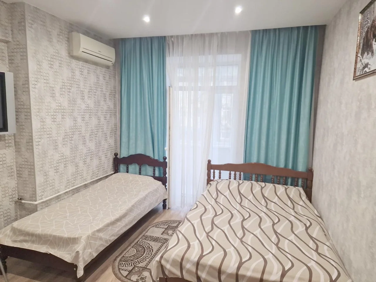 Четырехместный номер с кухней. Есть 1 двуспальная кровать, 1 односпальная кровать и раскладной диван. Кухня обеспечена всей необходимой техникой и посудой. В номере свой санузел - душ и туалет. Имеется кондиционер, телевизор и интернет.