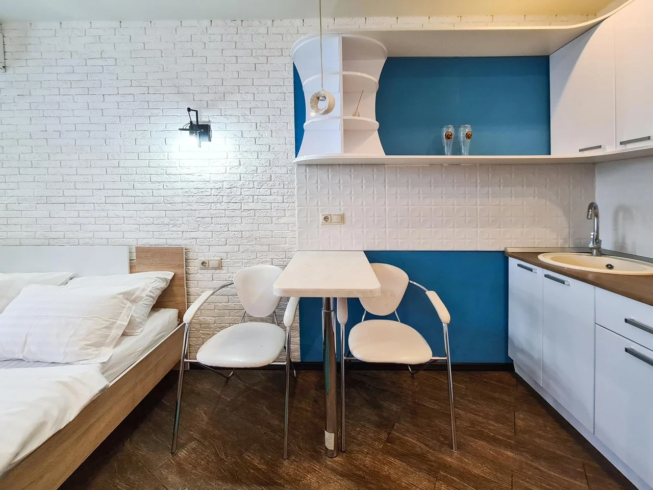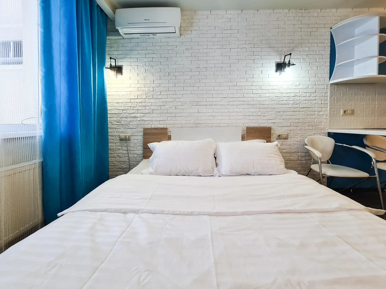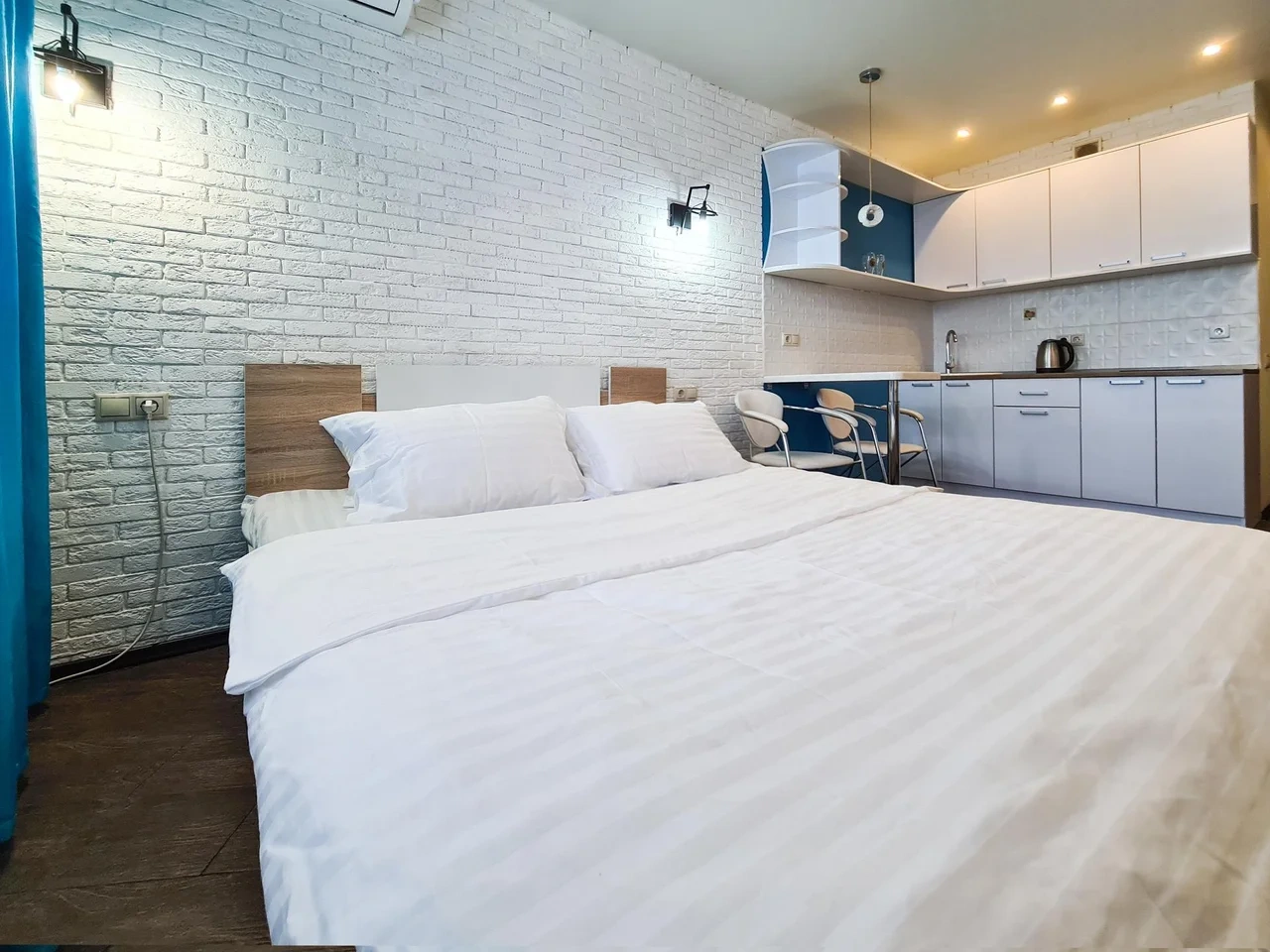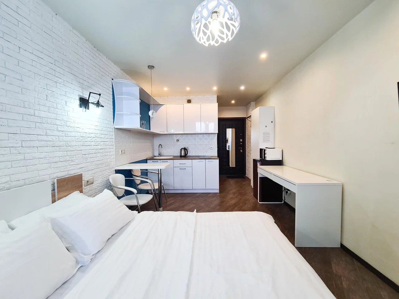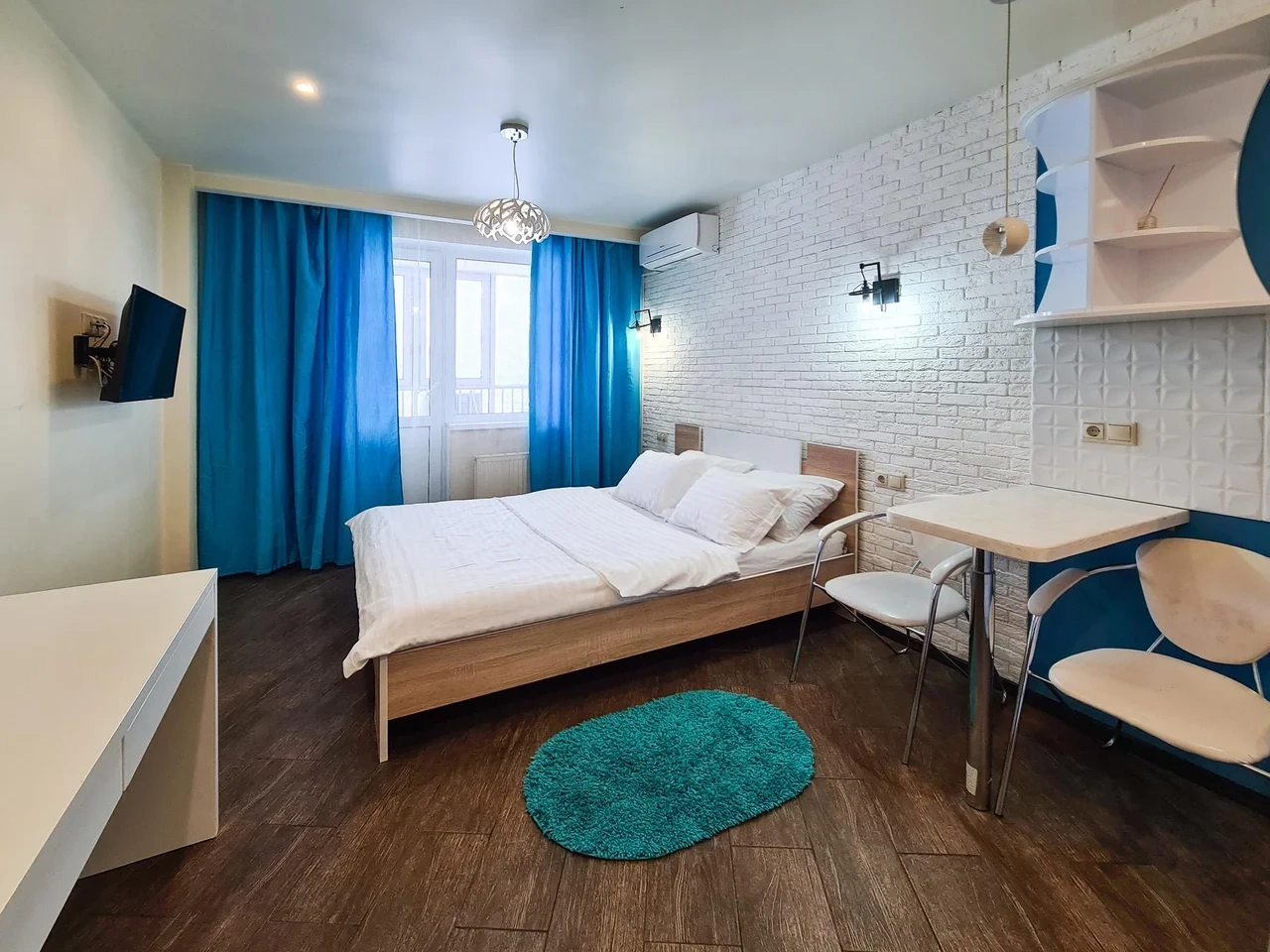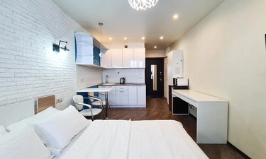 Вашему вниманию представлена стильная студия, оформленная в современном стиле. В интерьере преобладают нежные тона, включая белый и синий. В квартире для Вас есть все необходимое для комфортного проживания: двухспальная кровать, телевизор, wifi , холодильник, плита для приготовления пищи, электрочайник, стол, стулья, утюг и гладильная доска, комод, вешалка с зеркалом. Также индивидуальная ванная комната, оборудована душевой кабиной, унитазом, раковиной и феном. Комфортное освещение создаст максимально уютную атмосферу для пребывания в наших апартаментах.