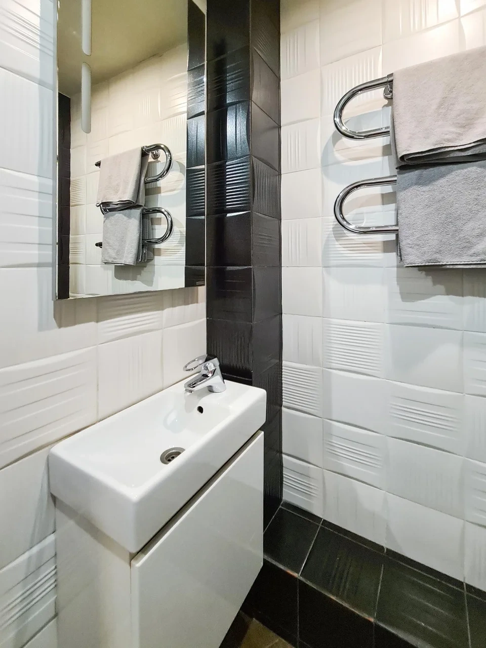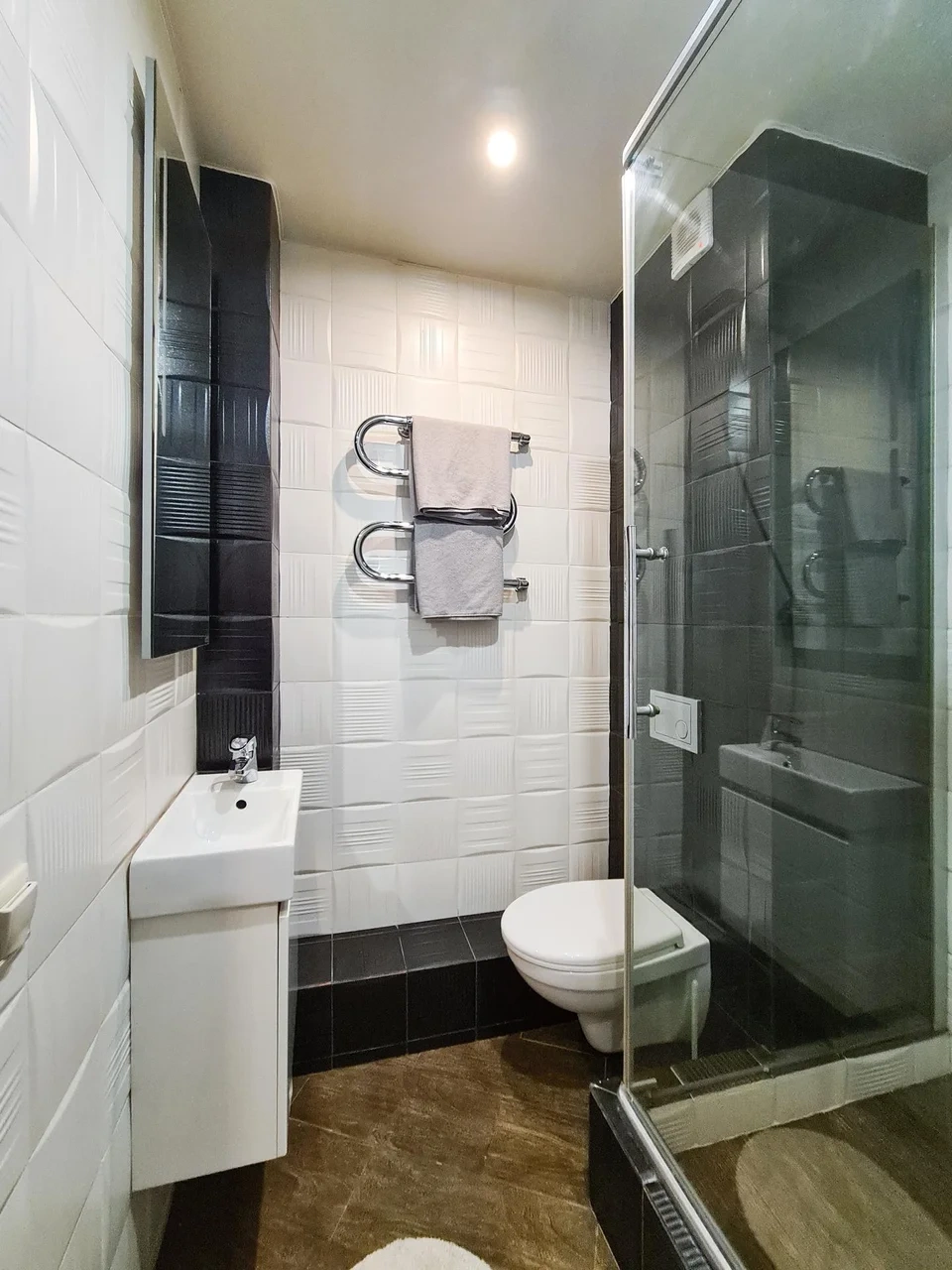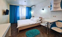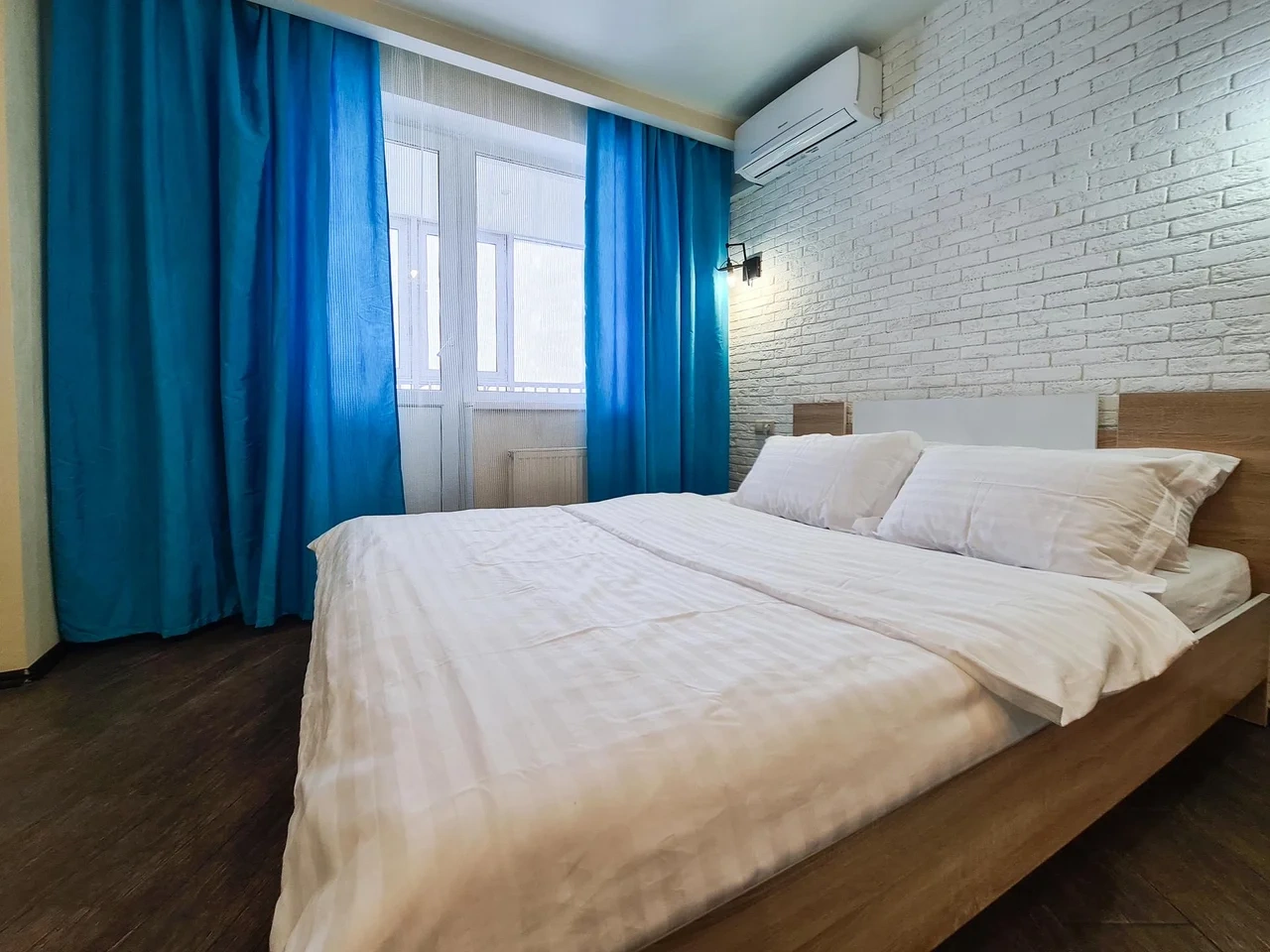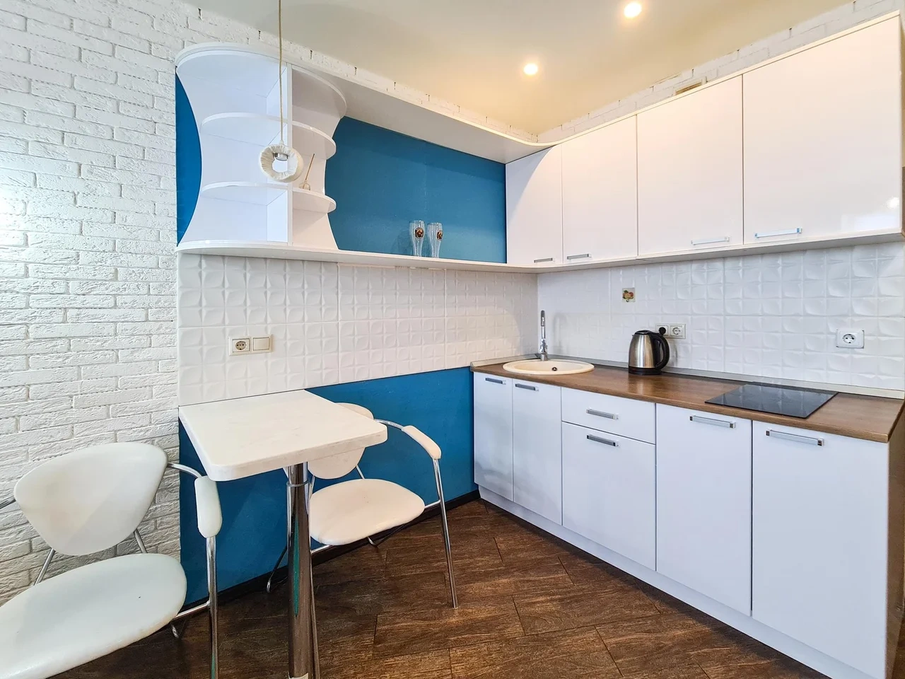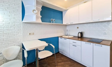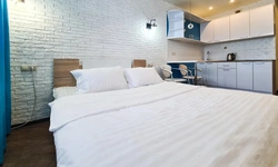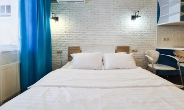 Вашему вниманию представлена стильная студия, оформленная в современном стиле. В интерьере преобладают нежные тона, включая белый и синий. В квартире для Вас есть все необходимое для комфортного проживания: двухспальная кровать, телевизор, wifi , холодильник, плита для приготовления пищи, электрочайник, стол, стулья, утюг и гладильная доска, комод, вешалка с зеркалом. Также индивидуальная ванная комната, оборудована душевой кабиной, унитазом, раковиной и феном. Комфортное освещение создаст максимально уютную атмосферу для пребывания в наших апартаментах.