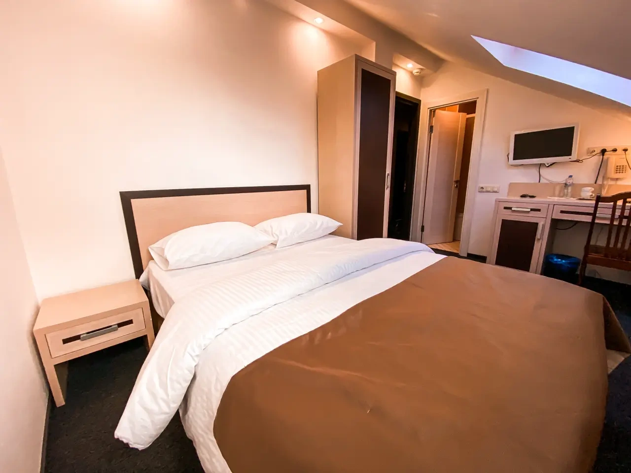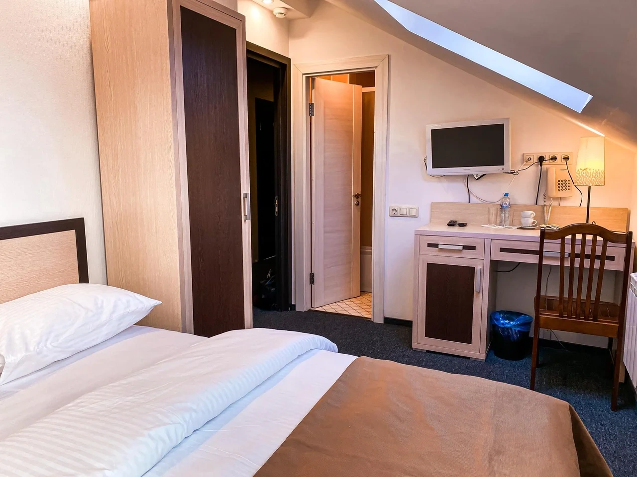 Номер категории "Стандарт" это эргономичный номер, который идеально подходит для комфортного отдыха во время туристической или деловой поездки в столицу. Номера категории "Стандарт", площадью 15 м, предусматривает все, что необходимо для полноценного отдыха и комфортного проживания. Он оборудован удобной двуспальной кроватью с мягким матрасом и свежим постельным бельем, где вы сможете отдохнуть после насыщенного дня. В номере также имеется рабочее место с письменным столом и стулом, где вы можете выполнять свои деловые задачи или просто организовать свою работу. Для вашего удобства в номере "Стандарт" есть телевизор с широким выбором каналов, чтобы вы могли насладиться своими любимыми программами или фильмами. Также в номере есть бесплатный Wi-Fi, чтобы вы могли оставаться на связи и пользоваться интернетом без ограничений. В собственной ванной комнате с душем вы найдете все необходимые туалетно-косметические принадлежности, включая полотенца, шампунь, гель для душа мыло и фен. Номера категории "Стандарт" предлагают пространство, где вы сможете отдохнуть и расслабиться после долгого дня.