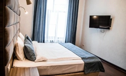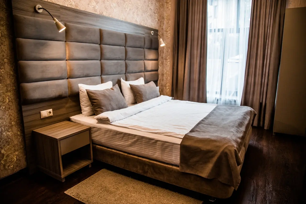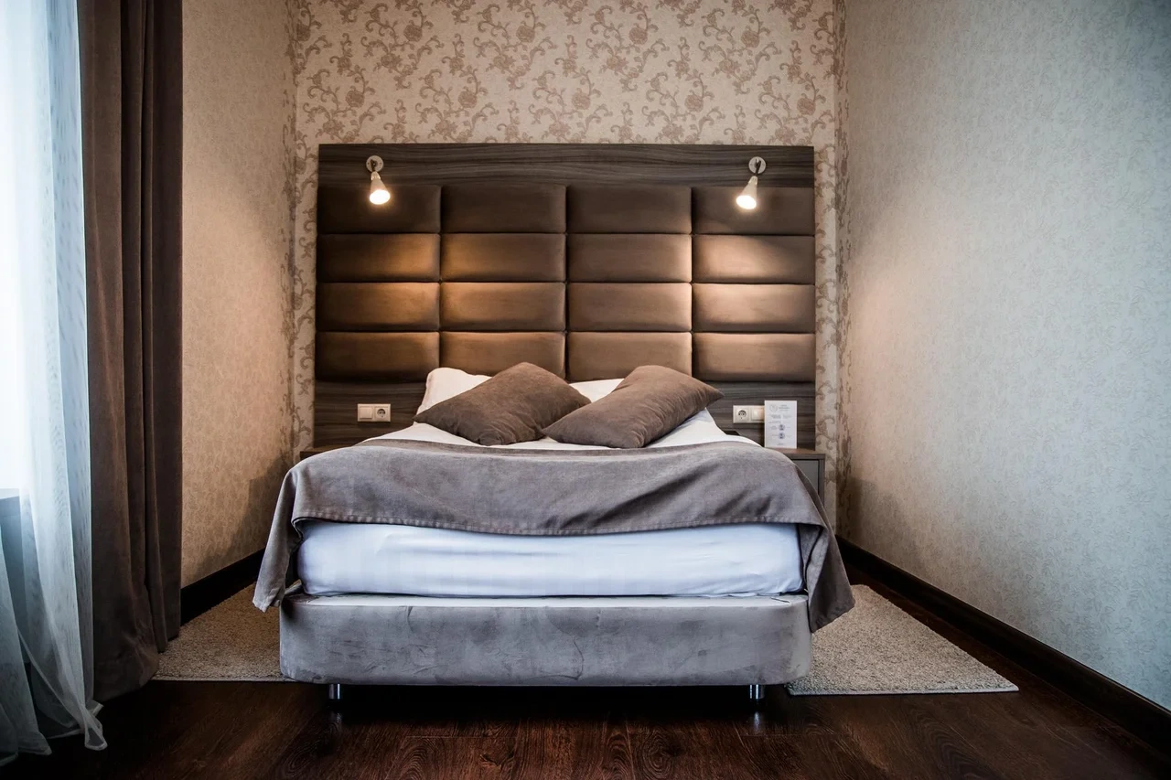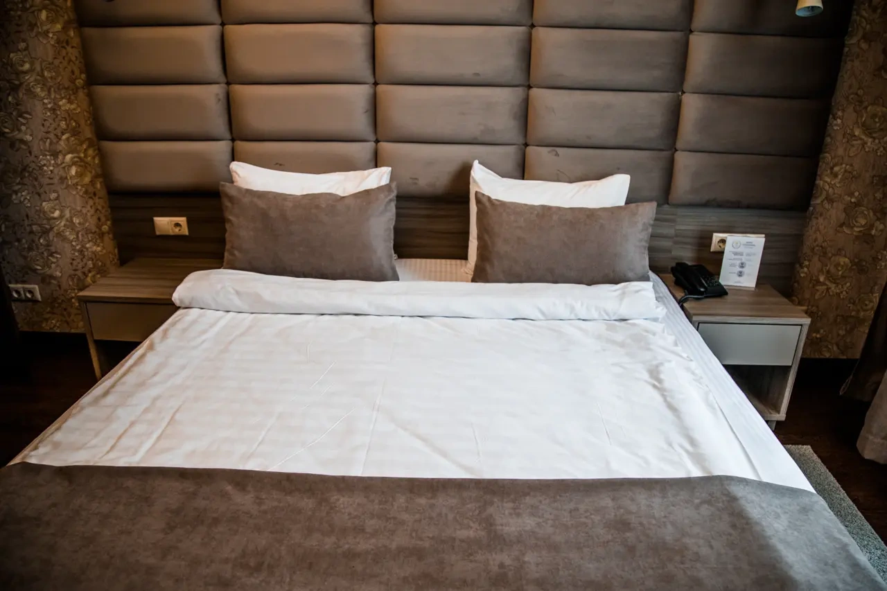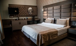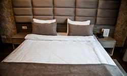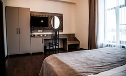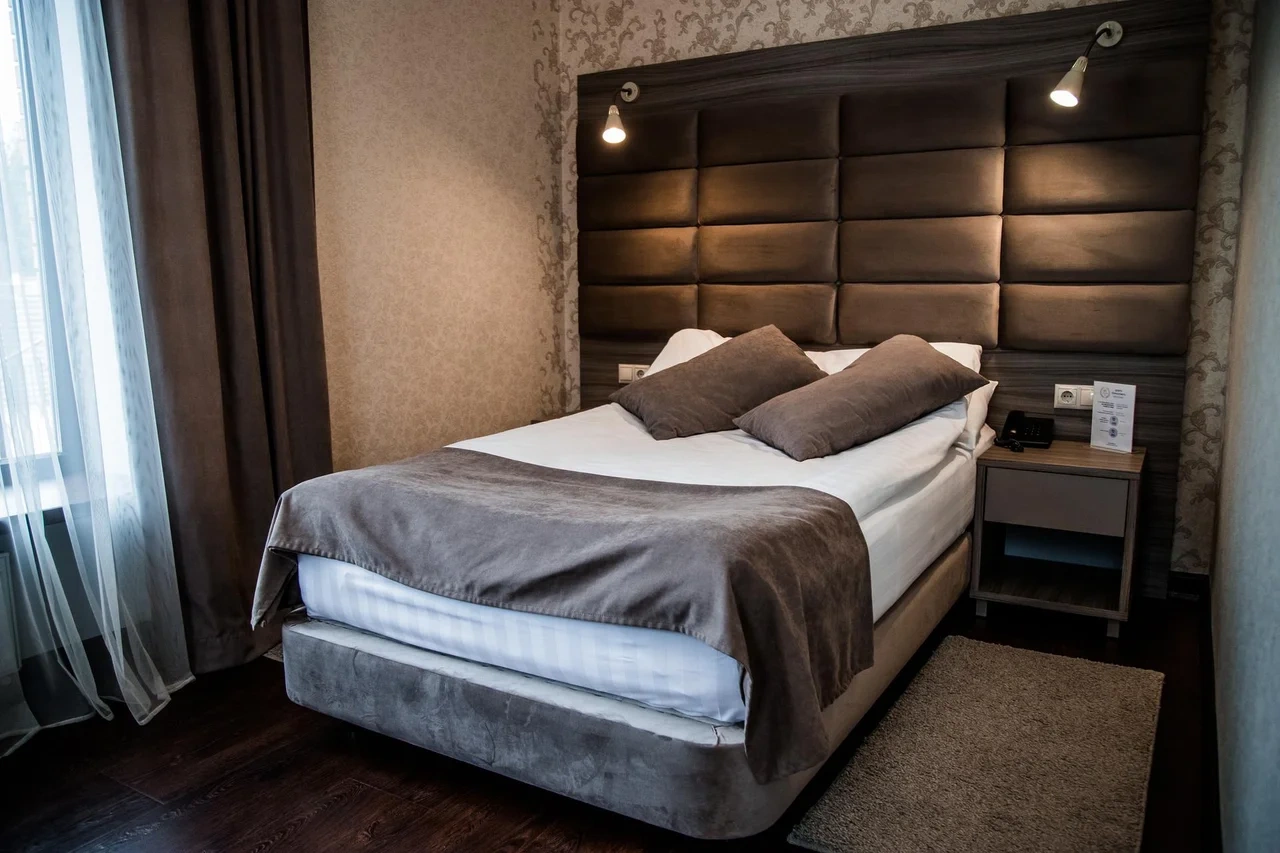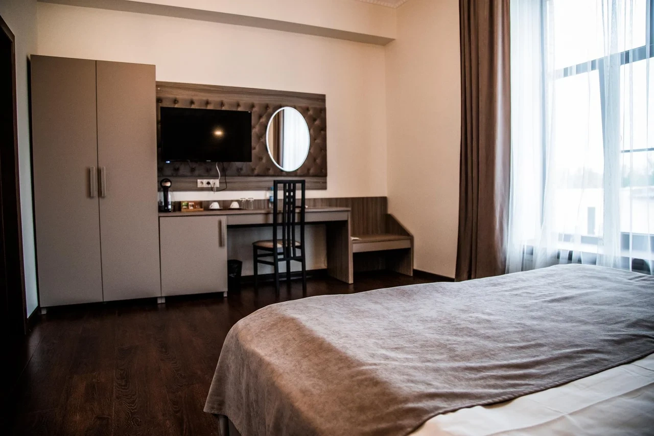 Уютный просторный номер с двуспальной кроватью и ортопедическим профессиональным матрасом. В номере есть всё необходимое для комфортного проживания: шкаф, прикроватные тумбочки, обувница, рабочий стол, зеркало, телевизор, сейф, фен, просторная душевая, банные принадлежности. Также в номере есть чайник, чай и чайная пара. Плотные шторы надежно защитят от лишнего света, а прикроватные лампы создадут уютный свет. Вся мебель сделана на заказ по индивидуальным замерам, а при ремонте номера использованы качественные материалы.