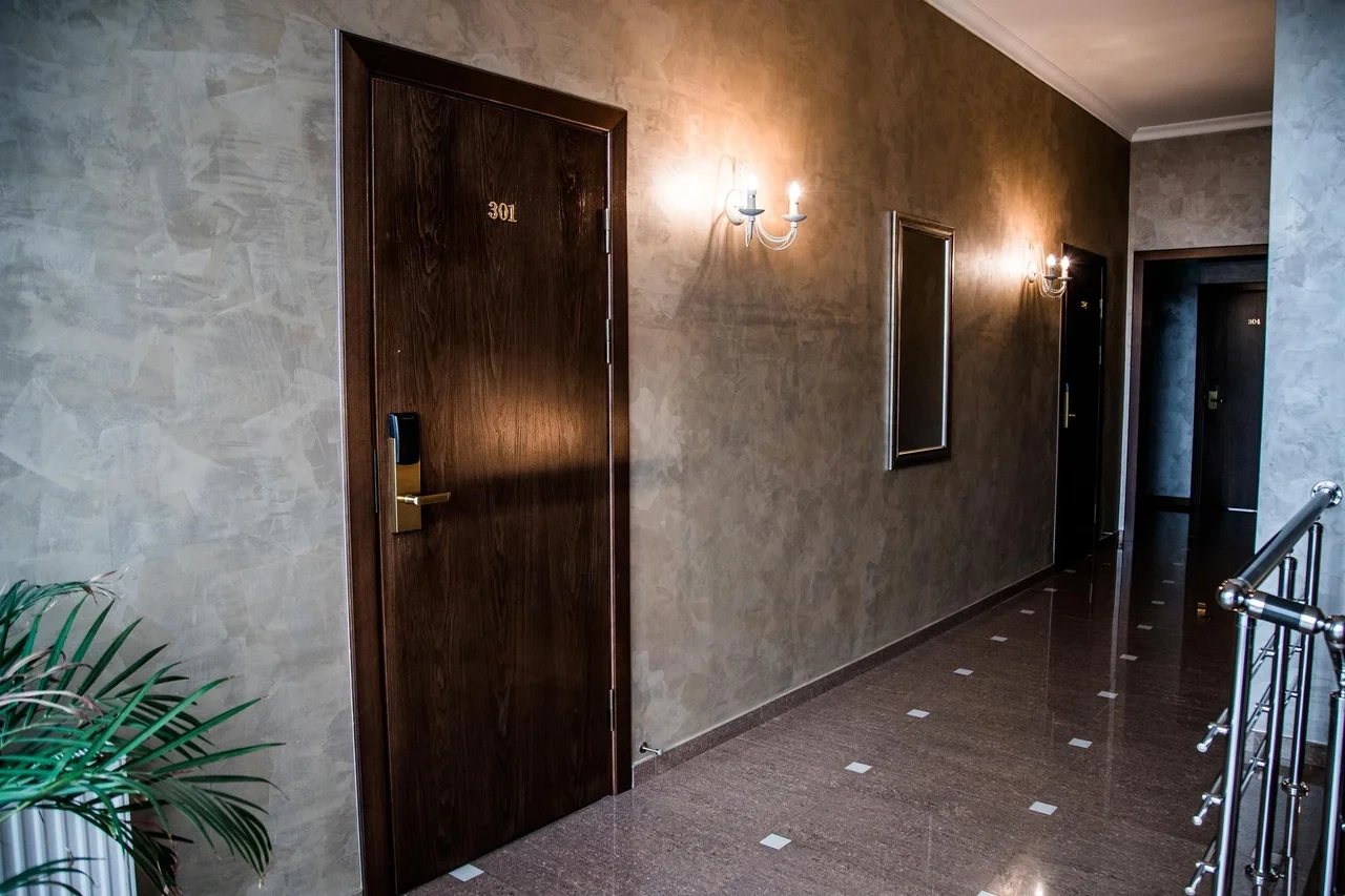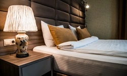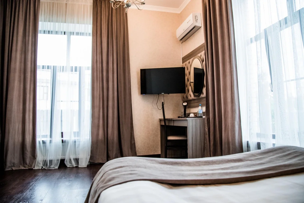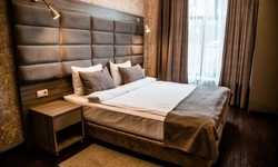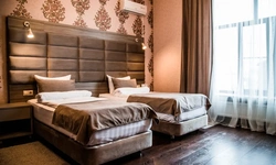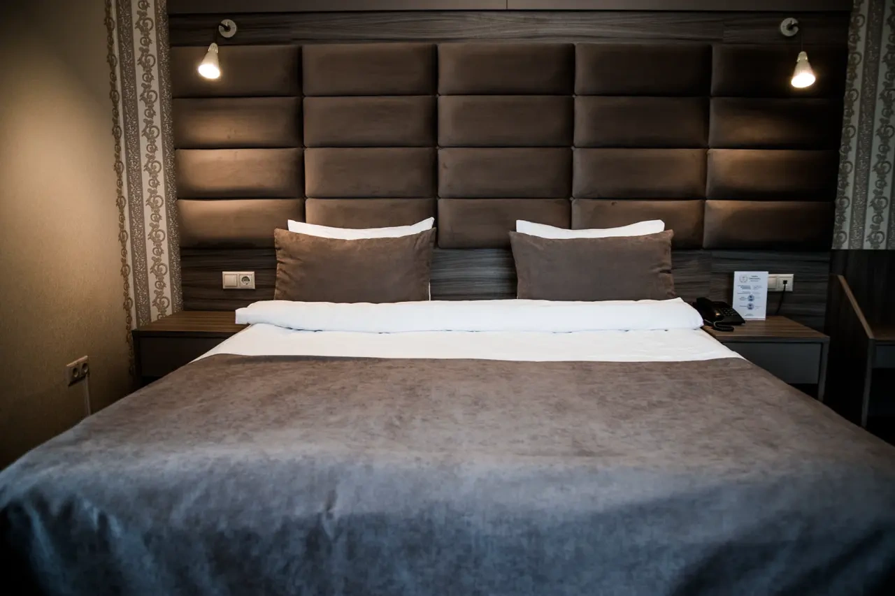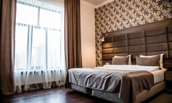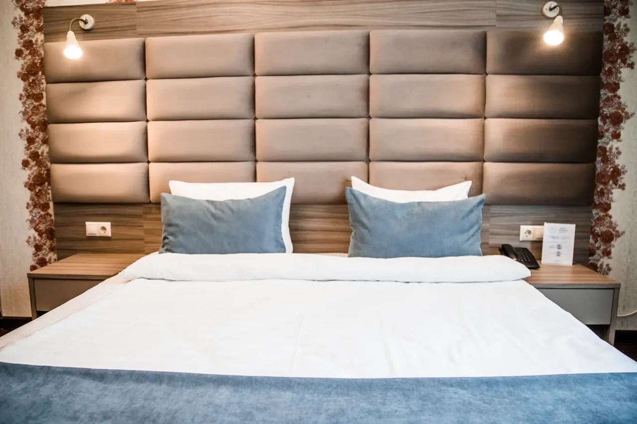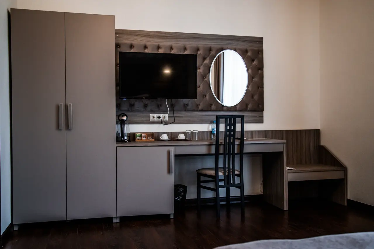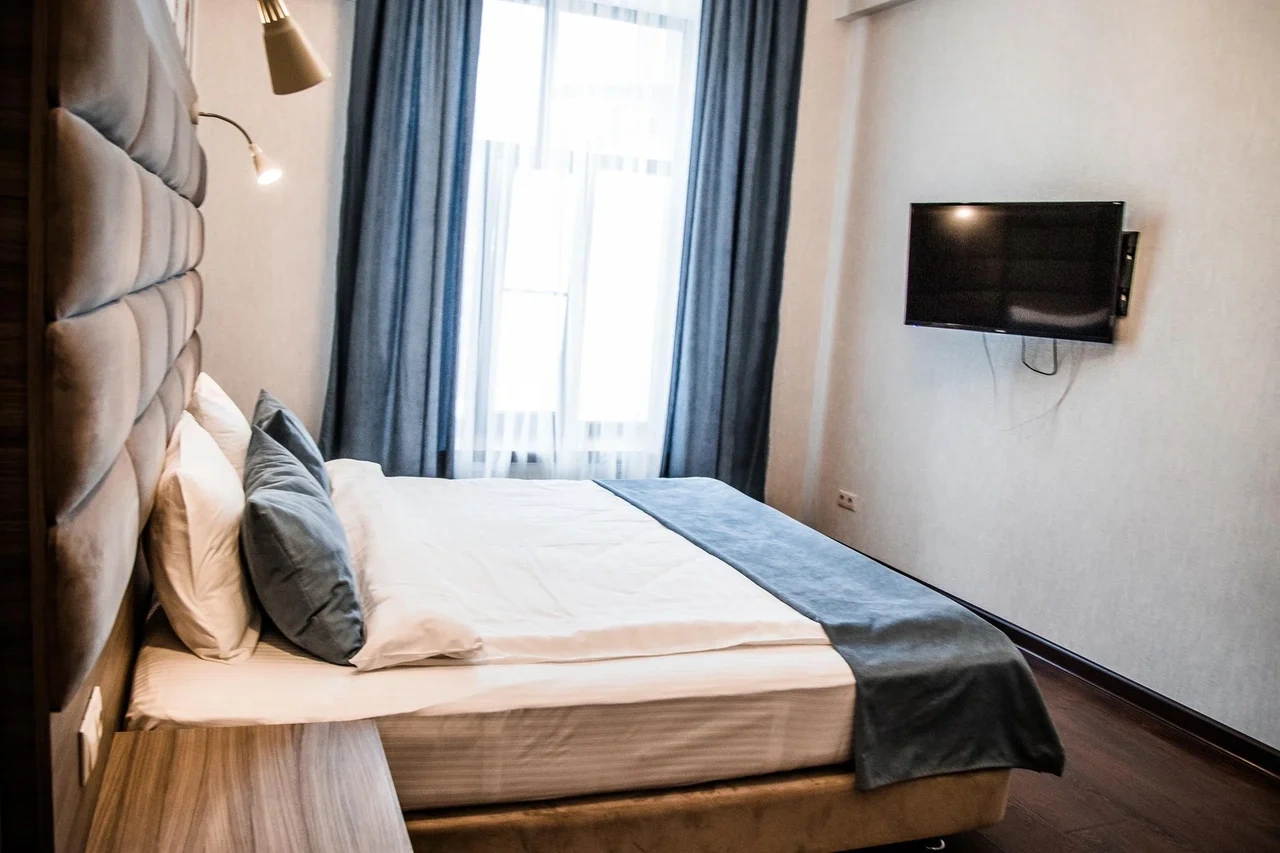 Уютный просторный номер с двуспальной кроватью и ортопедическим профессиональным матрасом. В номере есть всё необходимое для комфортного проживания: шкаф, прикроватные тумбочки, обувница, рабочий стол, зеркало, телевизор, сейф, фен, просторная душевая, банные принадлежности. Также в номере есть чайник, чай и чайная пара. Плотные шторы надежно защитят от лишнего света, а прикроватные лампы создадут уютный свет. Вся мебель сделана на заказ по индивидуальным замерам, а при ремонте номера использованы качественные материалы.
