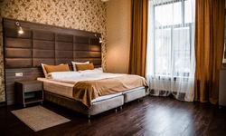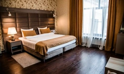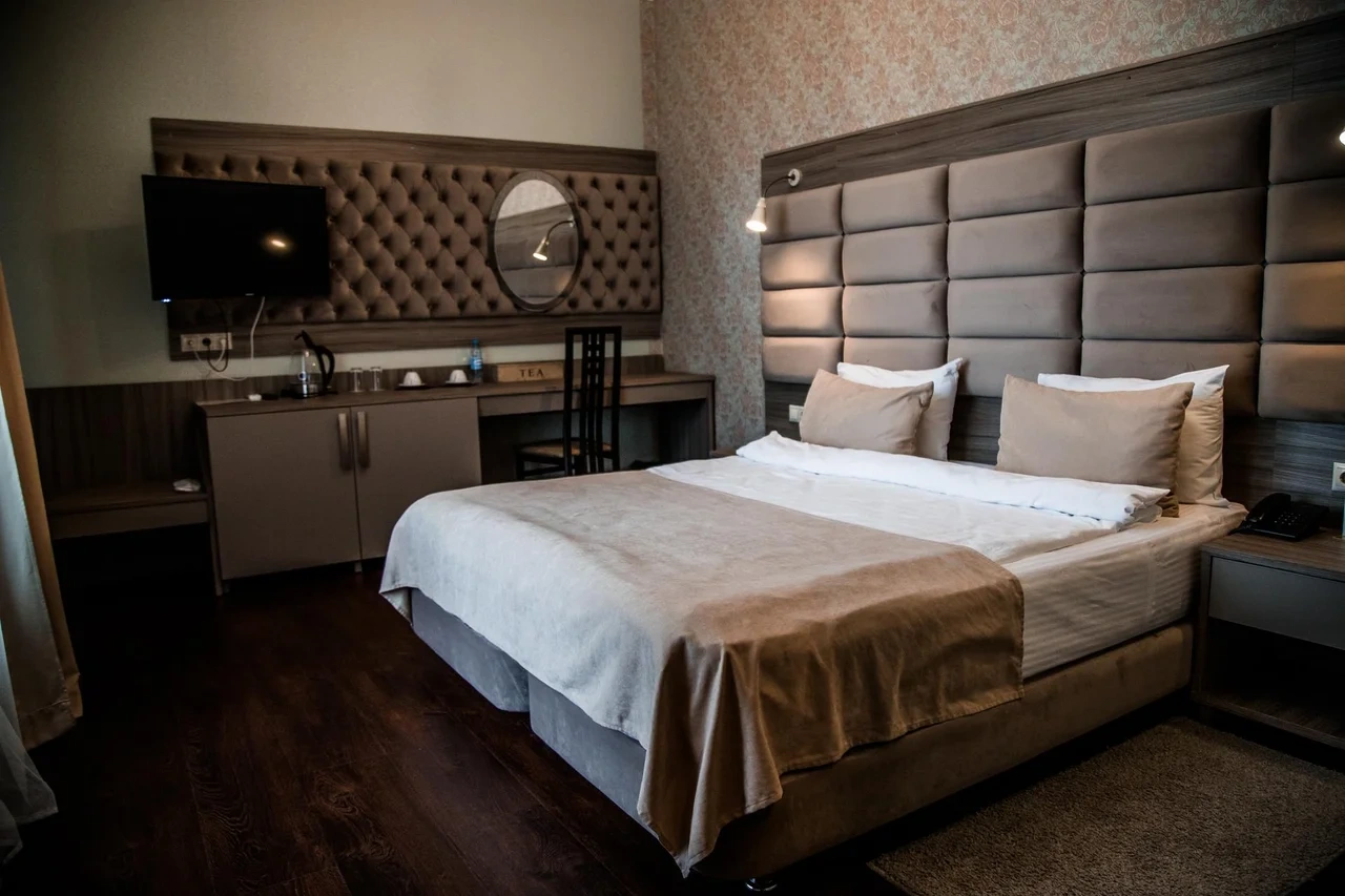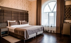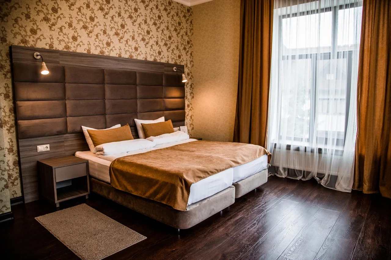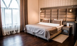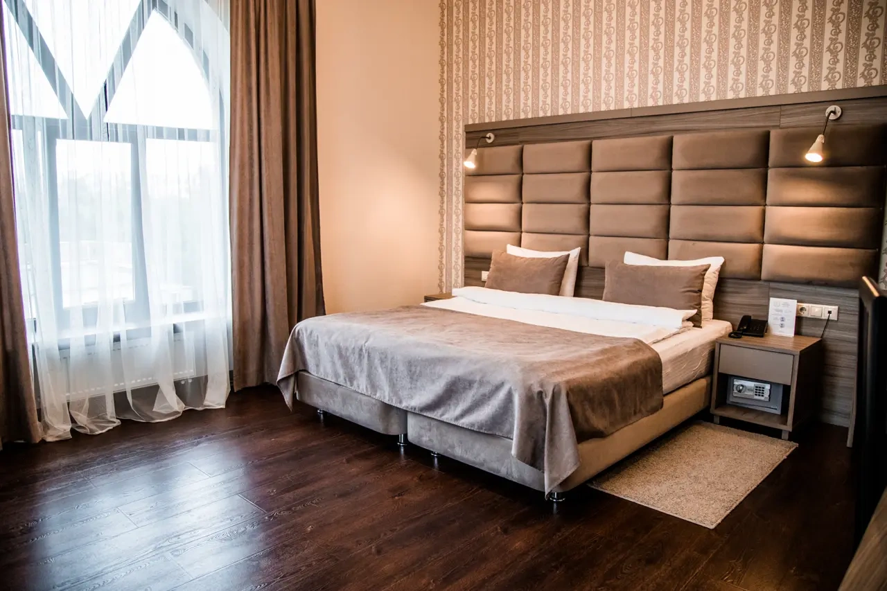 Просторный номер с двуспальной кроватью kingsize и ортопедическим профессиональным матрасом. В номере есть всё необходимое для комфортного проживания: шкаф, прикроватные тумбочки, обувница, рабочий стол, зеркало, телевизор, сейф, фен, просторная душевая, банные принадлежности. Также в номере есть чайник, чай и чайная пара. Плотные шторы надежно защитят от лишнего света, а прикроватные лампы создадут уютный свет. Вся мебель сделана на заказ по индивидуальным замерам, а при ремонте номера использованы качественные материалы.