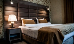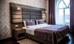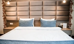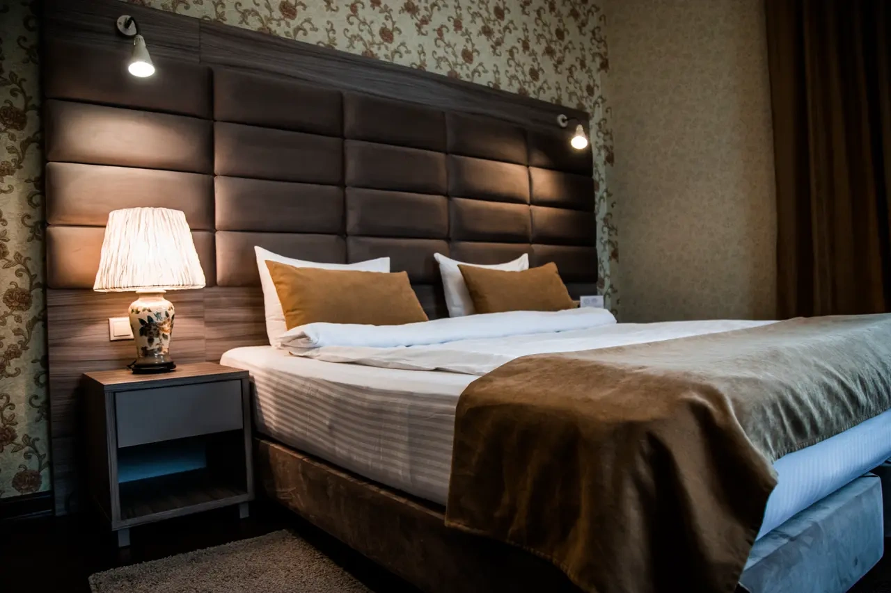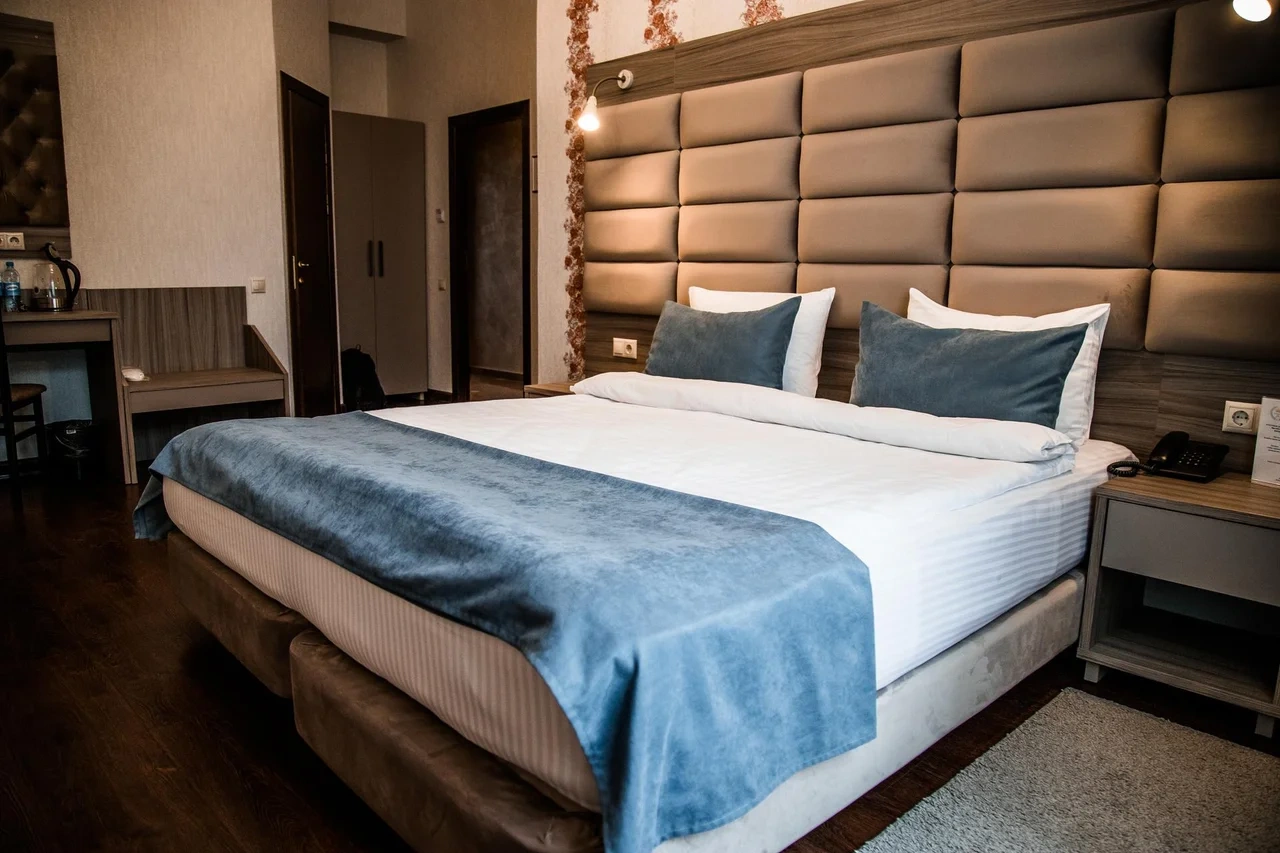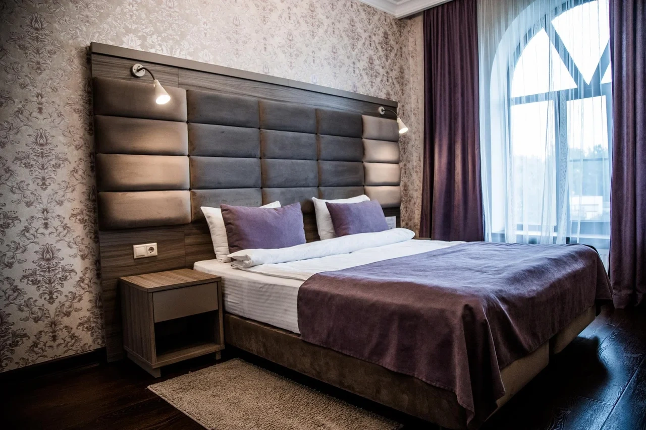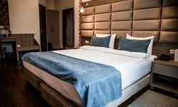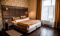Просторный номер с двуспальной кроватью kingsize и ортопедическим профессиональным матрасом. В номере есть всё необходимое для комфортного проживания: шкаф, прикроватные тумбочки, обувница, рабочий стол, зеркало, телевизор, сейф, фен, просторная душевая, банные принадлежности. Также в номере есть чайник, чай и чайная пара. Плотные шторы надежно защитят от лишнего света, а прикроватные лампы создадут уютный свет. Вся мебель сделана на заказ по индивидуальным замерам, а при ремонте номера использованы качественные материалы.