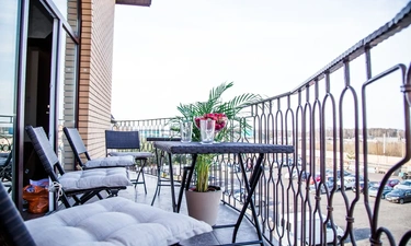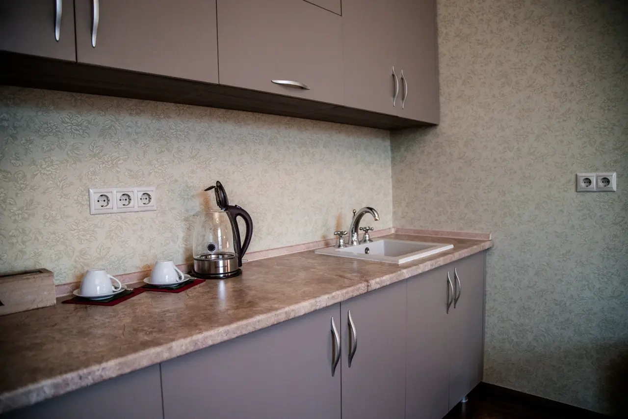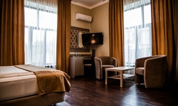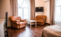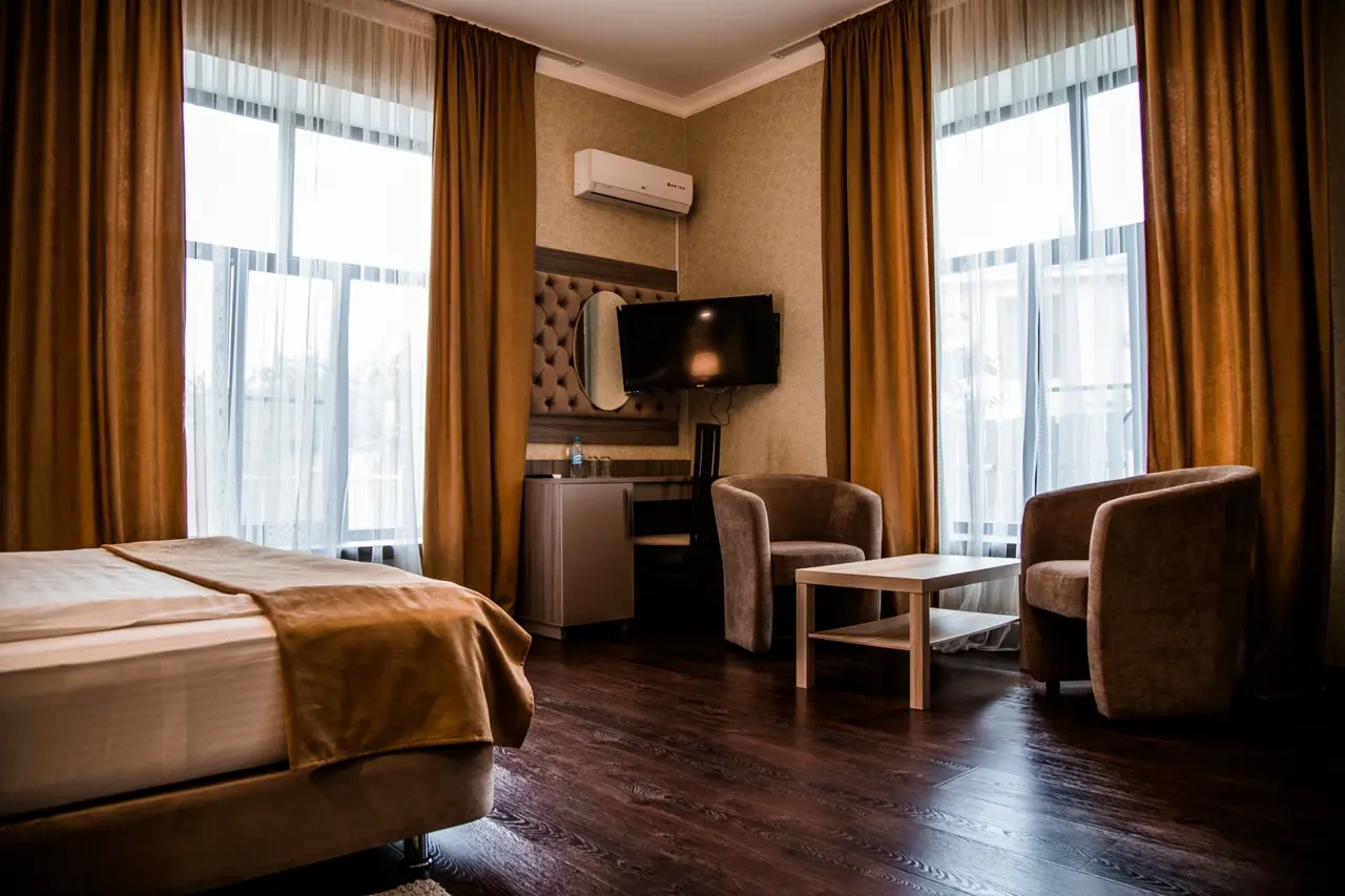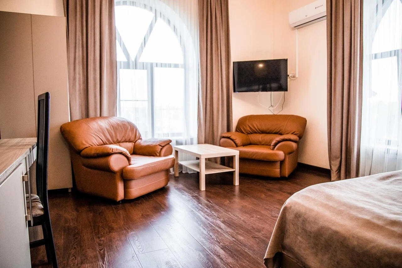 Большой стильный номер с двуспальной кроватью и ортопедическим профессиональным матрасом. Номер оснащён кухонным гарнитуром и мойкой. Пообедать или посидеть за чашечкой кофе можно в уютных креслах за журнальным столиком. Есть свой балкон с видом на сад. В номере есть всё необходимое для комфортного проживания: шкаф, прикроватные тумбочки, обувница, рабочий стол, зеркало, телевизор, сейф, фен, просторная душевая, банные принадлежности. Также в номере есть чайник, чай и чайная пара. Плотные шторы надежно защитят от лишнего света, а прикроватные лампы создадут уютный свет. Вся мебель сделана на заказ по индивидуальным замерам, а при ремонте номера использованы качественные материалы.