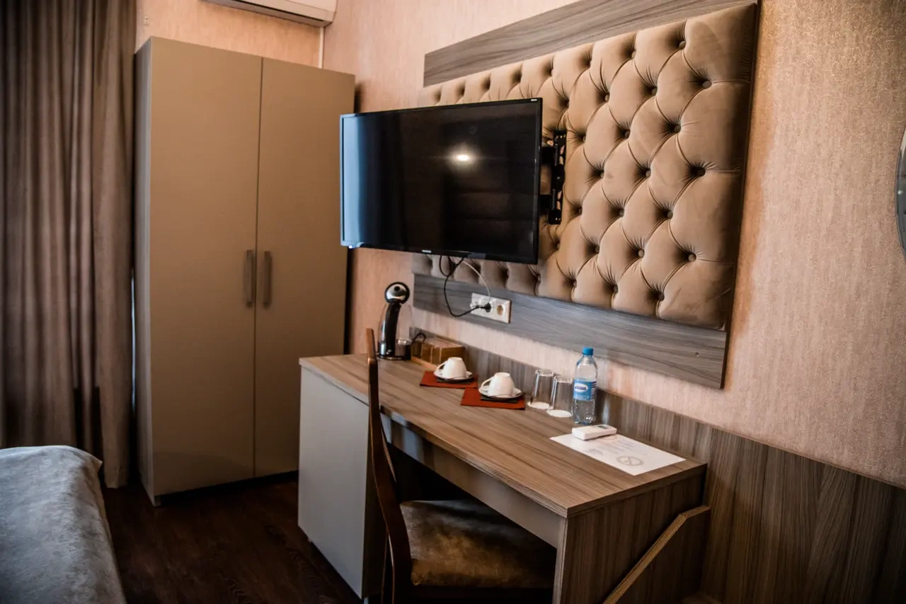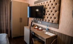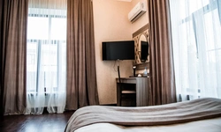 Уютный номер с полутороспальной кроватью и ортопедическим профессиональным матрасом. В номере есть всё необходимое для комфортного проживания: шкаф, прикроватные тумбочки, обувница, рабочий стол, зеркало, телевизор, сейф, фен, просторная душевая, банные принадлежности. Также в номере есть чайник, чай и чайная пара. Плотные шторы надежно защитят от лишнего света, а прикроватные лампы создадут уютный свет. Вся мебель сделана на заказ по индивидуальным замерам, а при ремонте номера использованы качественные материалы.