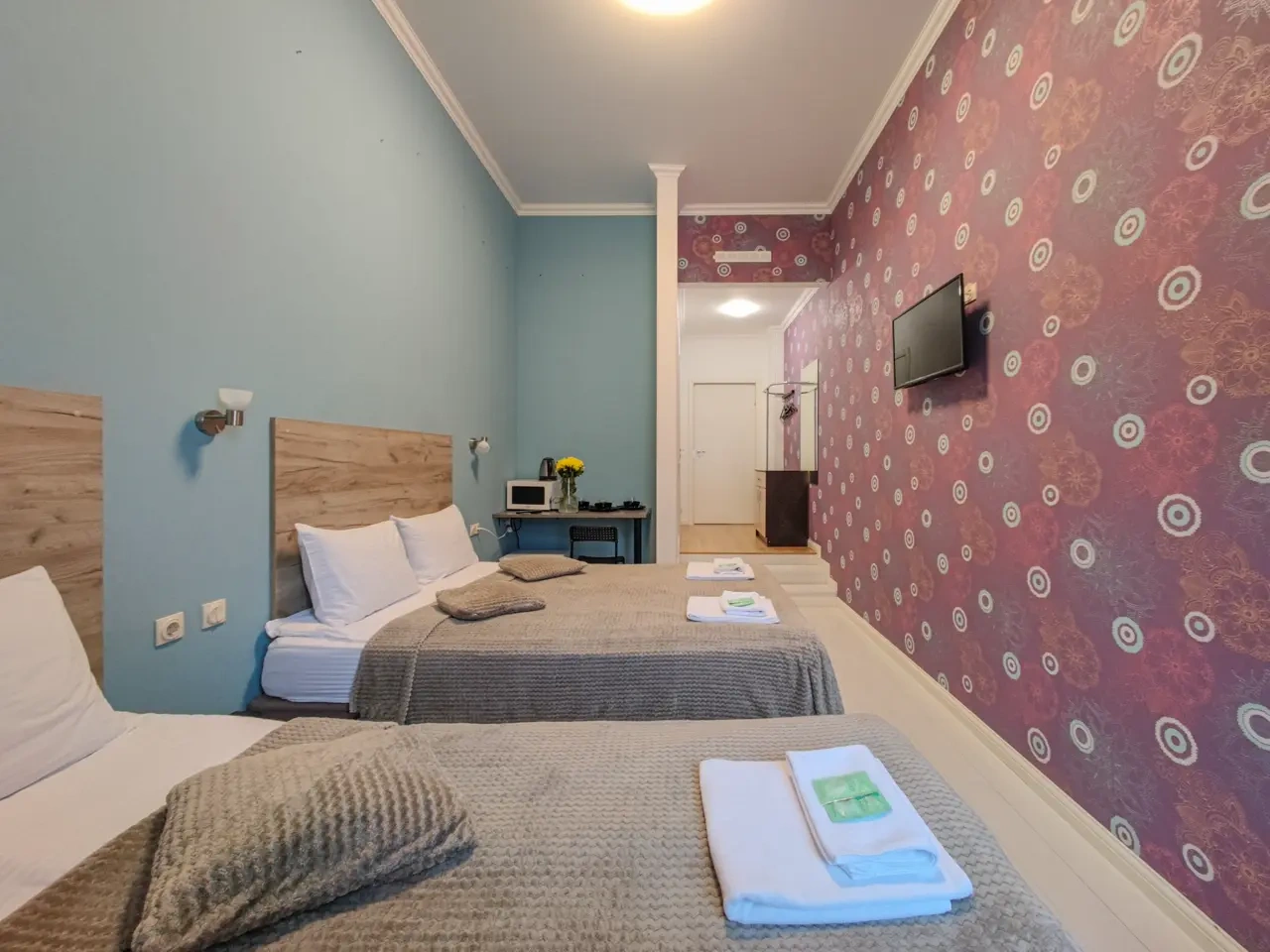 Семейная комната на троих человек с собственными удобствами(двуспальная и односпальная кровати), также есть телевизор, холодильник, чайник ,посуда и микроволновая печь ,постельное белье, полотенца, фен ,кофемашина, чайная станция. Расположение в центре города рядом со станцией Гостиный Двор(пересечение невского/садовой) - в пешей доступности Русский музей, Михайловский сквер , Фонтанка, цирк и многое другое . Большое количество кафе и ресторанов ,хорошая транспортная развязка